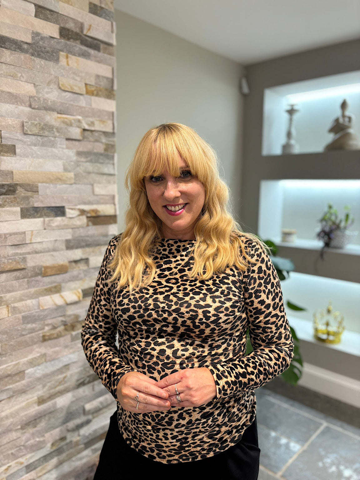 This leopard top combines luxurious softness with contemporary design. The gentle ruching along the sides sculpts a refined, fitted shape that flatters your figure while maintaining comfort throughout the day. Crafted from a touchable fabric that invites you to feel confident, this piece works beautifully as a standalone statement or layered under your favourite jacket. A versatile wardrobe essential that celebrates your style with understated elegance.