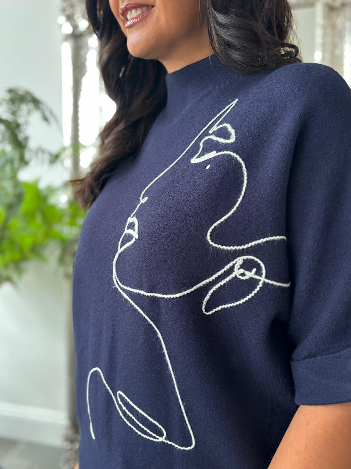 Crafted from high-quality fabric, the Abstract Face Knit Emily offers comfort and style. Its high neck provides warmth, while the embroidered abstract face design adds a unique artistic touch. Thoughtful button details on the sleeve enhance the overall look, making this knit a versatile piece you'll appreciate wearing day after day.