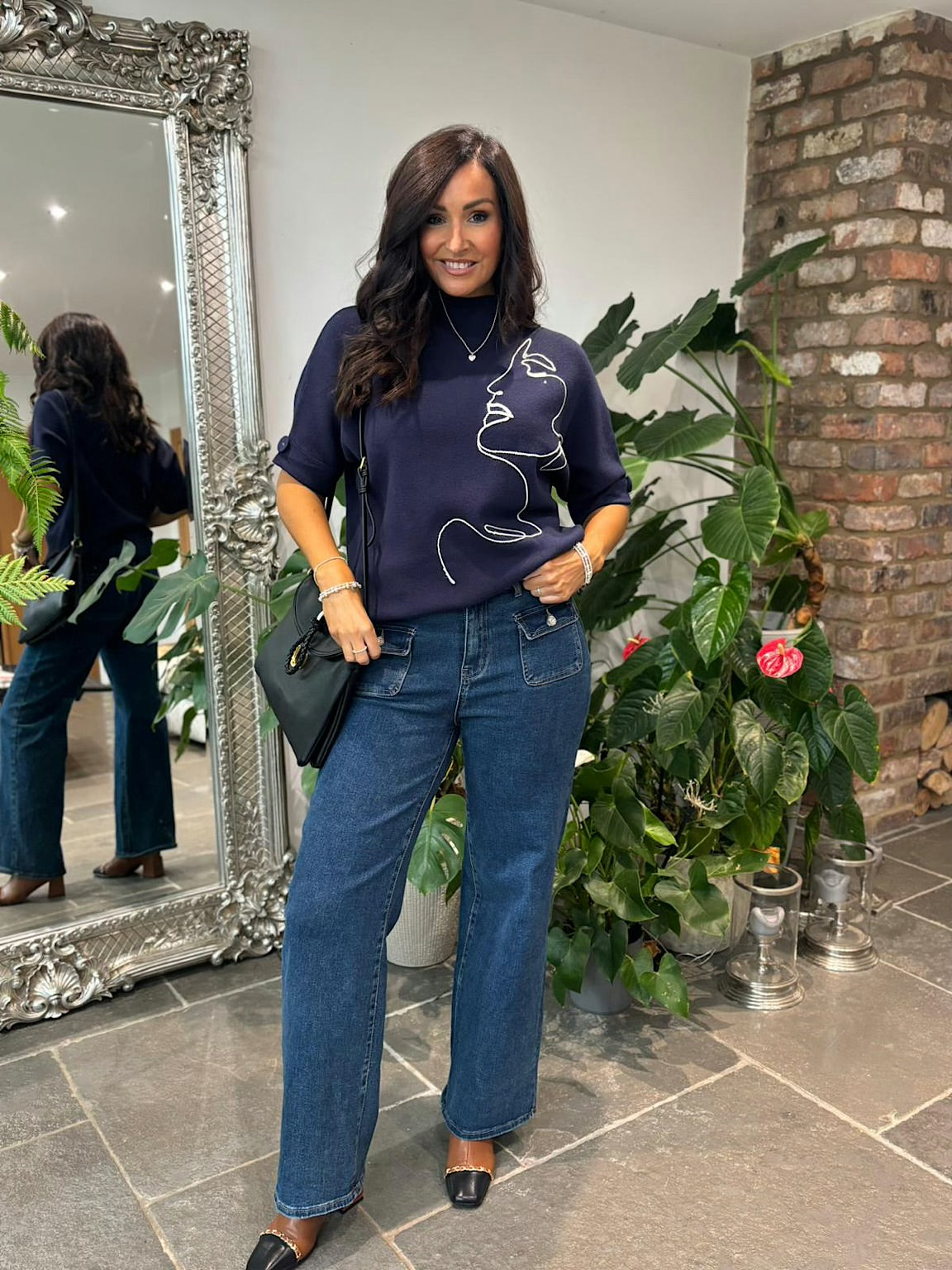 Styled with.....> Black Braid Fasten Shoulder Bag / Tan Chain Front Block Heel Boots / Denim Button Pocket Wide Leg Jeans