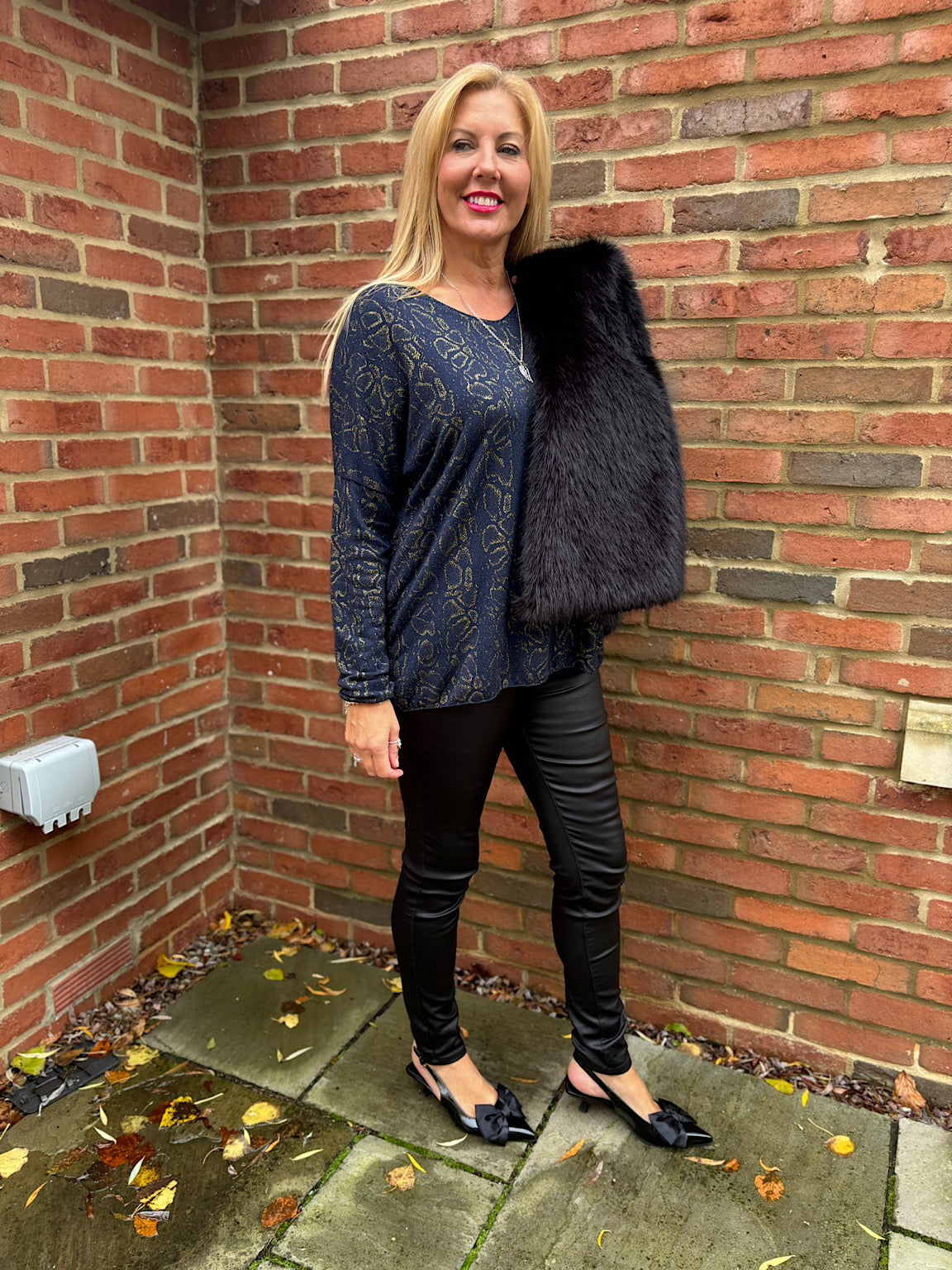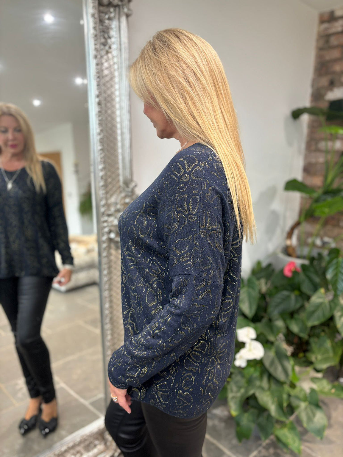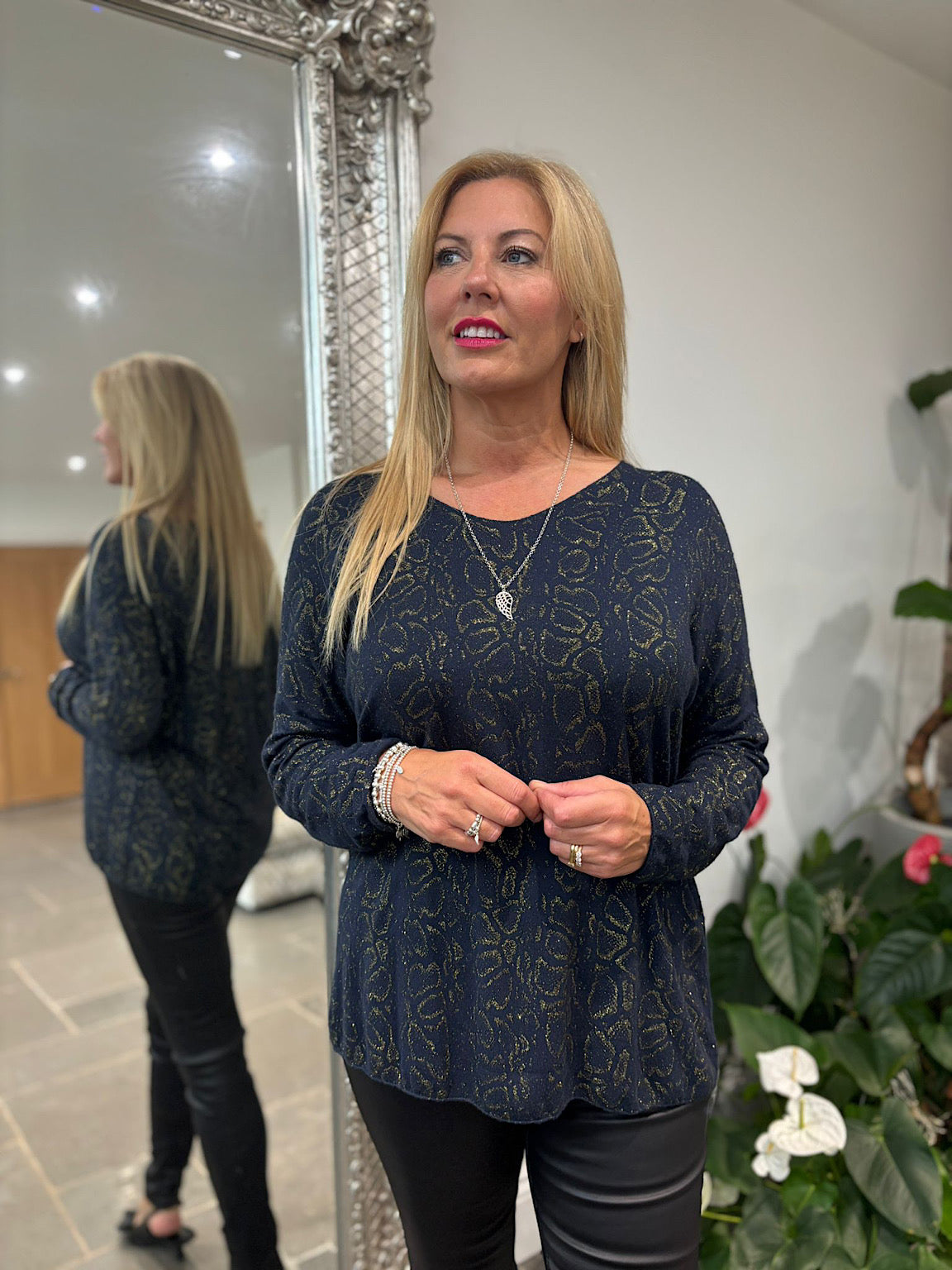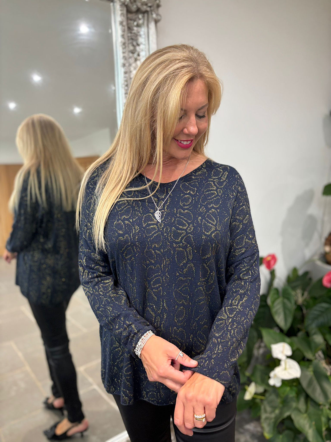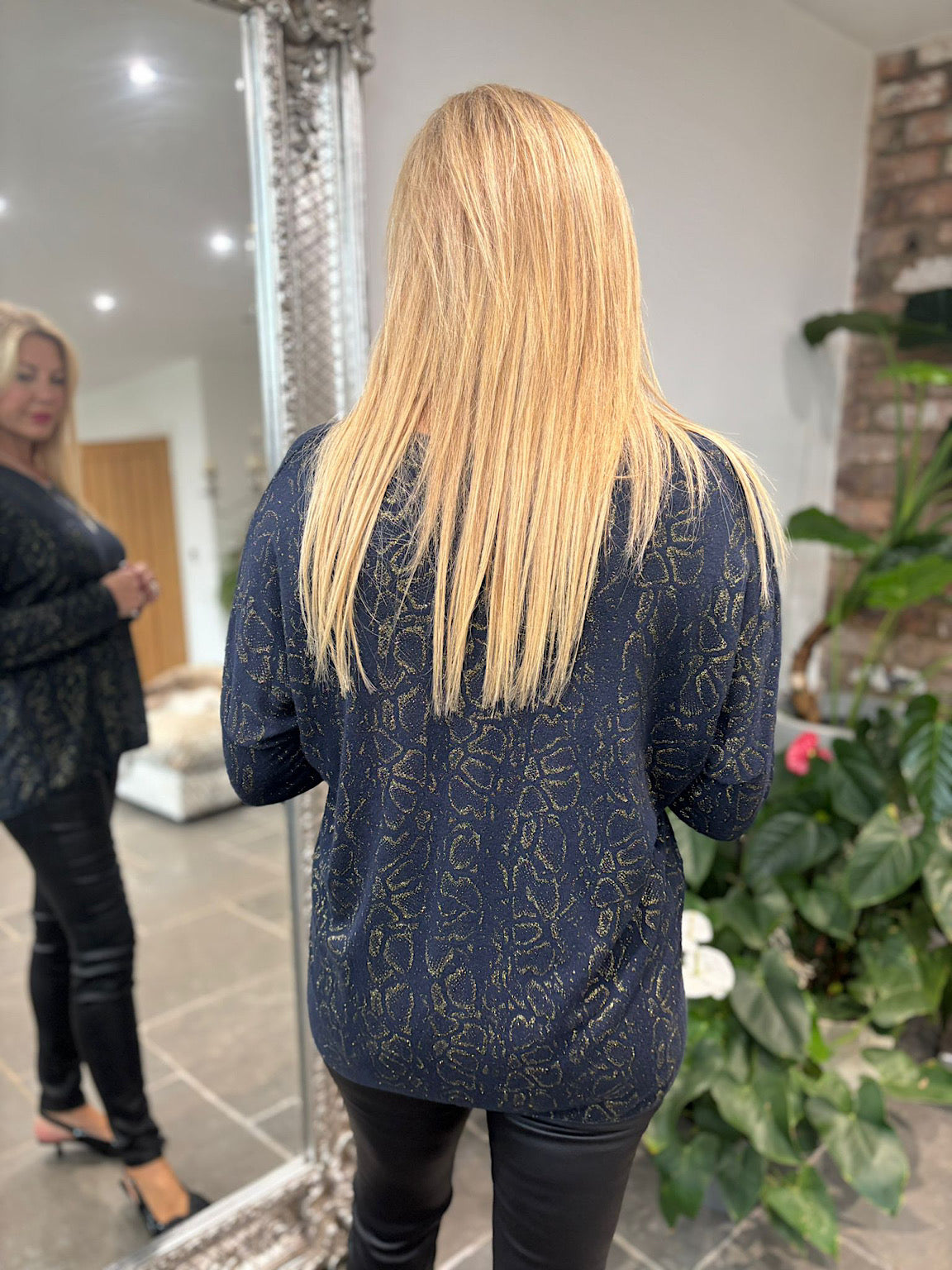 This fine-knit long sleeve top features a flattering V-neck and a sparkling animal design that adds subtle glamour to your look. The eye-catching detail offers a stylish touch perfect for both casual and dressier occasions.