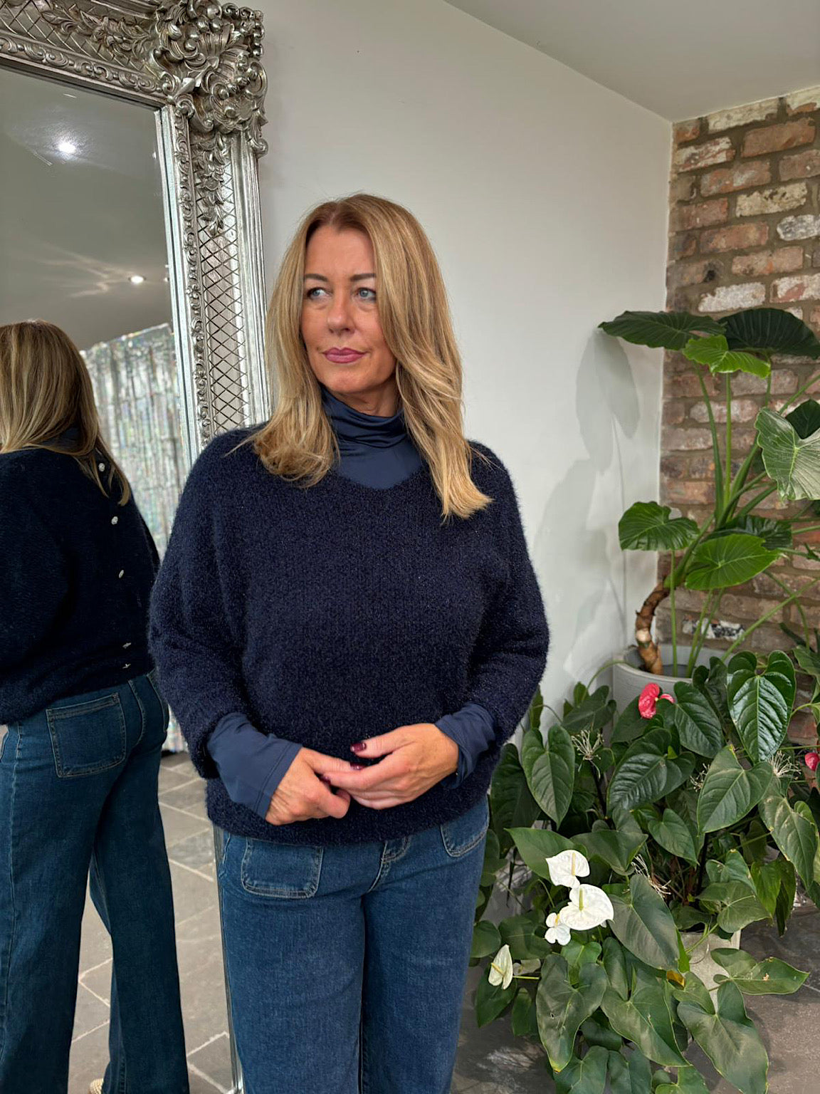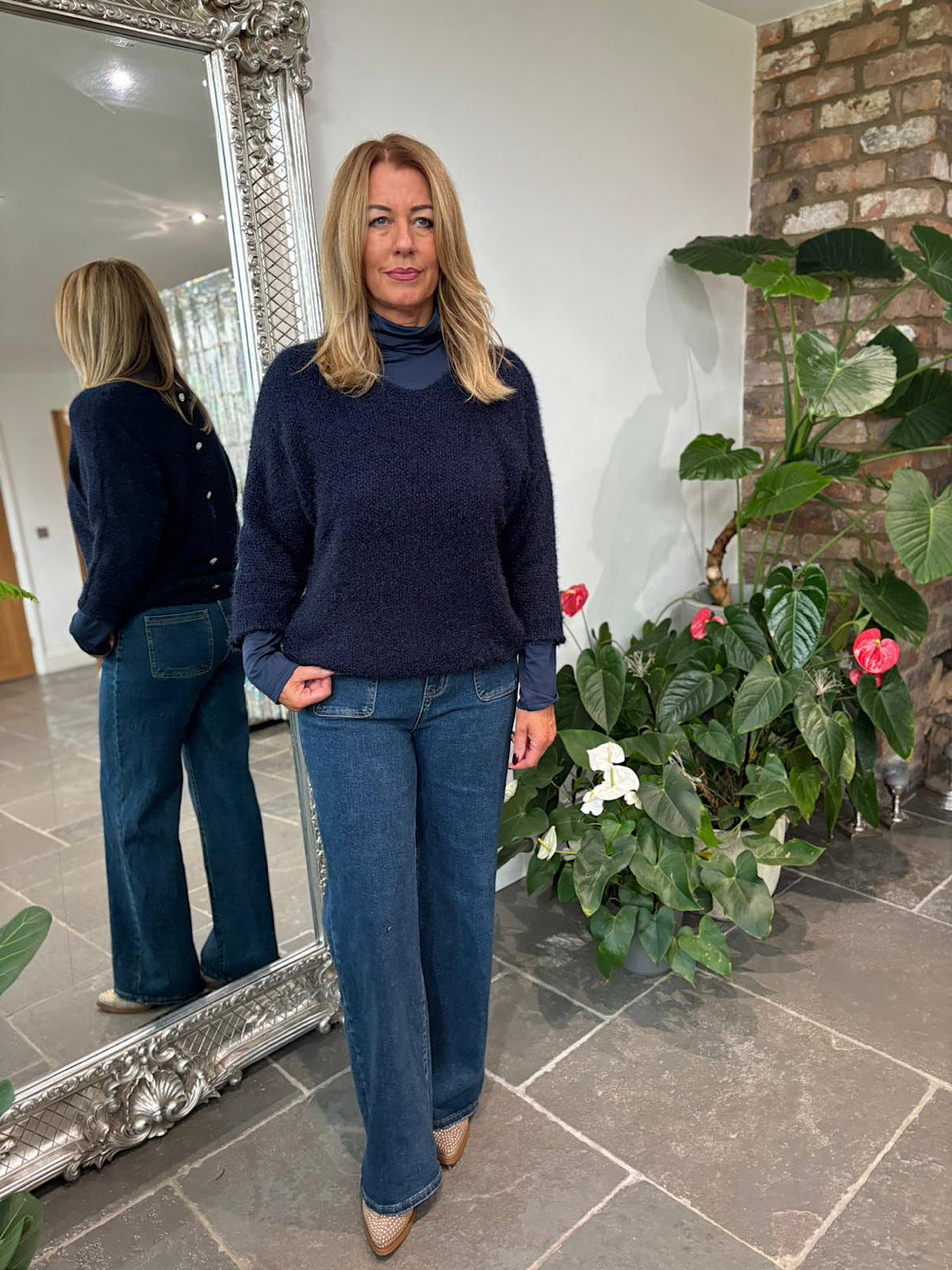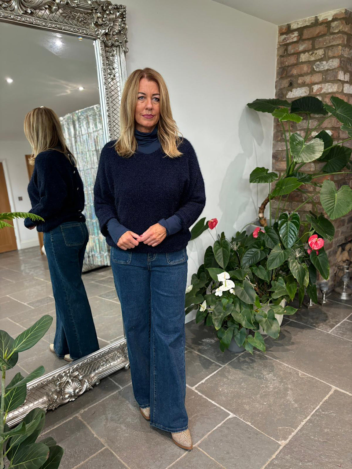 Styled with.....> Denim Button Pocket Wide Leg Jeans / Navy Roll Neck Top Julia / Chocolate Braid Fasten Shoulder Bag