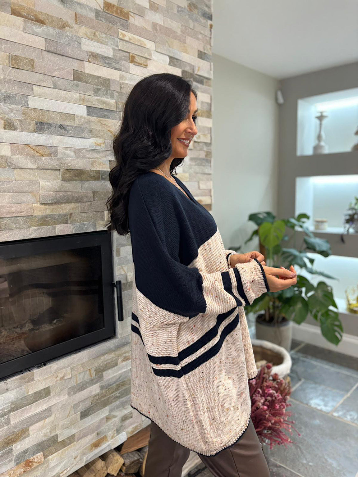 The Block Stripe Jumper Bethany features an oversized, relaxed fit for all-day comfort. Its cosy fabric is enhanced by a ribbed striped panel and subtle ribbed detailing on the sleeves, adding texture and style. Perfect for layering, this jumper combines warmth with a laid-back aesthetic.