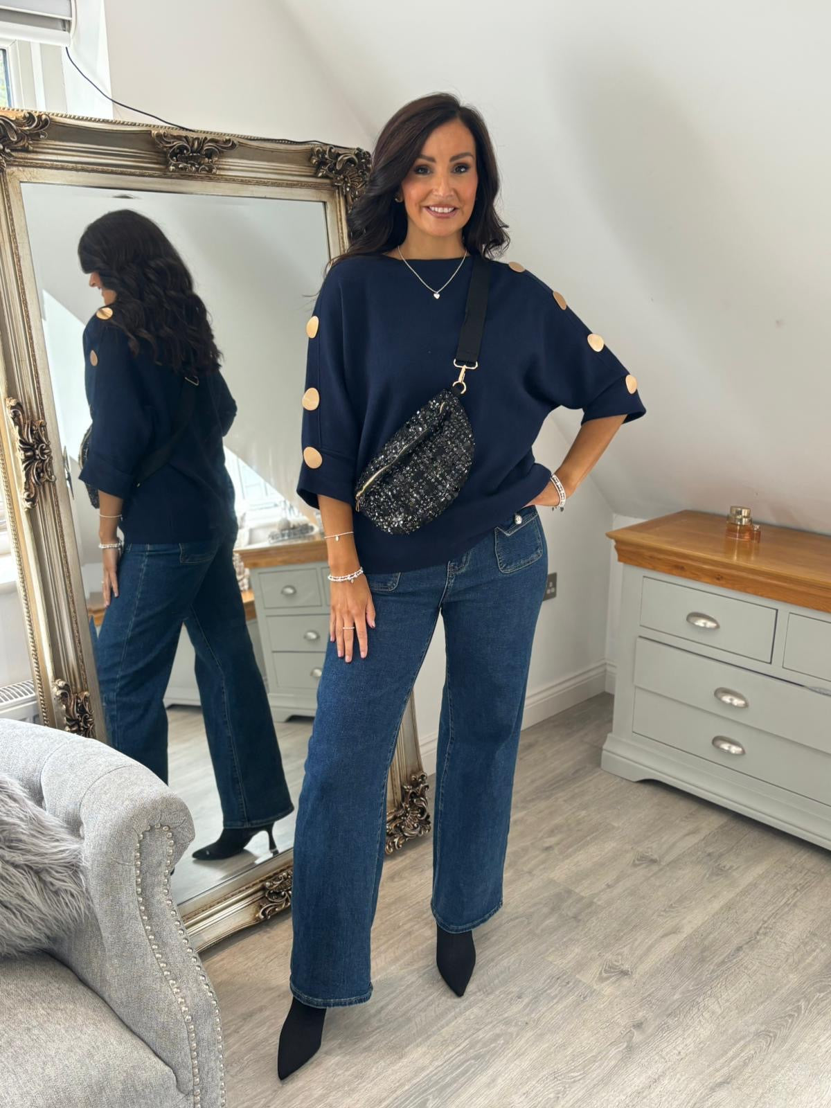 Styled with.....> Black Pointed High Heel Boots / Black Sequin Embellished Crossbody Bag / Denim Button Pocket Wide Leg Jeans