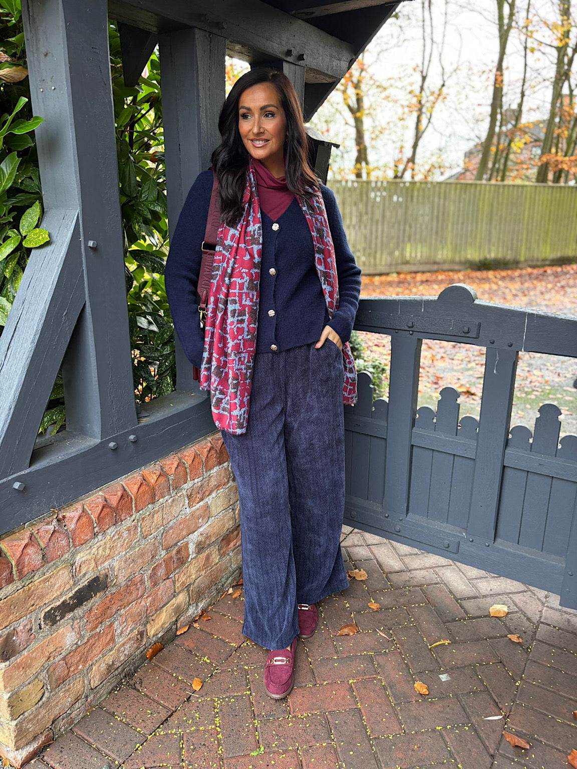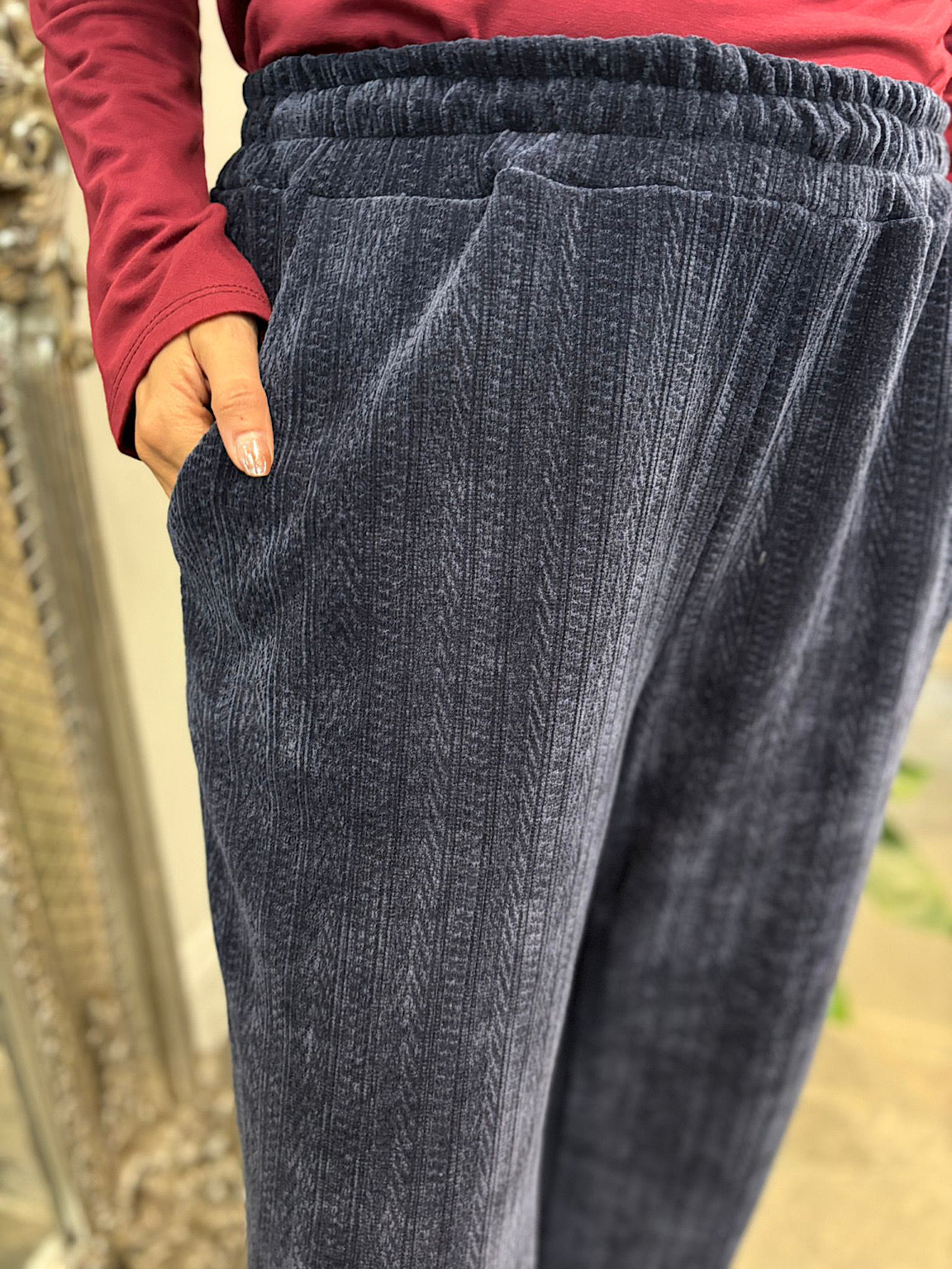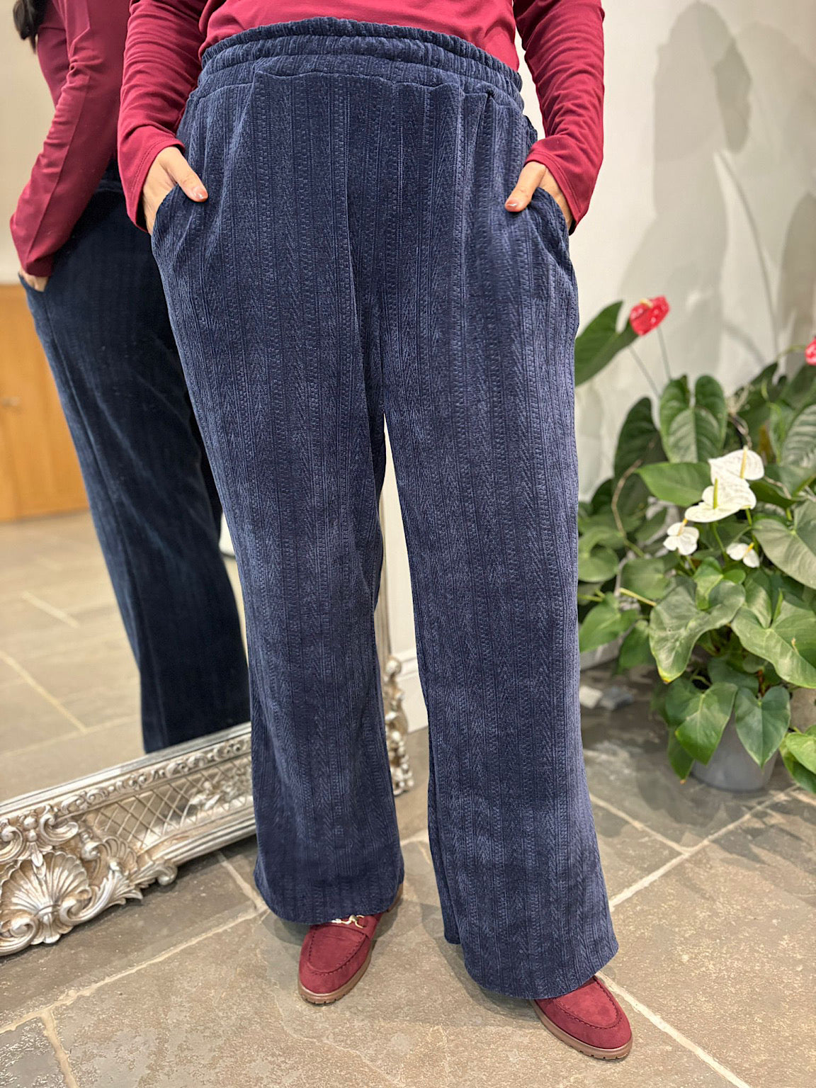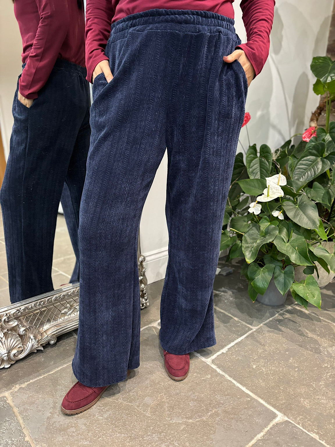 Slip into effortless comfort with these Chenille Textured Trousers Mia. Crafted from luxuriously soft chenille fabric, they feature a flattering wide-leg silhouette that moves with you throughout the day. The elasticated waist ensures a secure, comfortable fit, while the subtle textured finish adds visual interest to your everyday wardrobe. Perfect for relaxed styling or dressing up with your favourite pieces.
