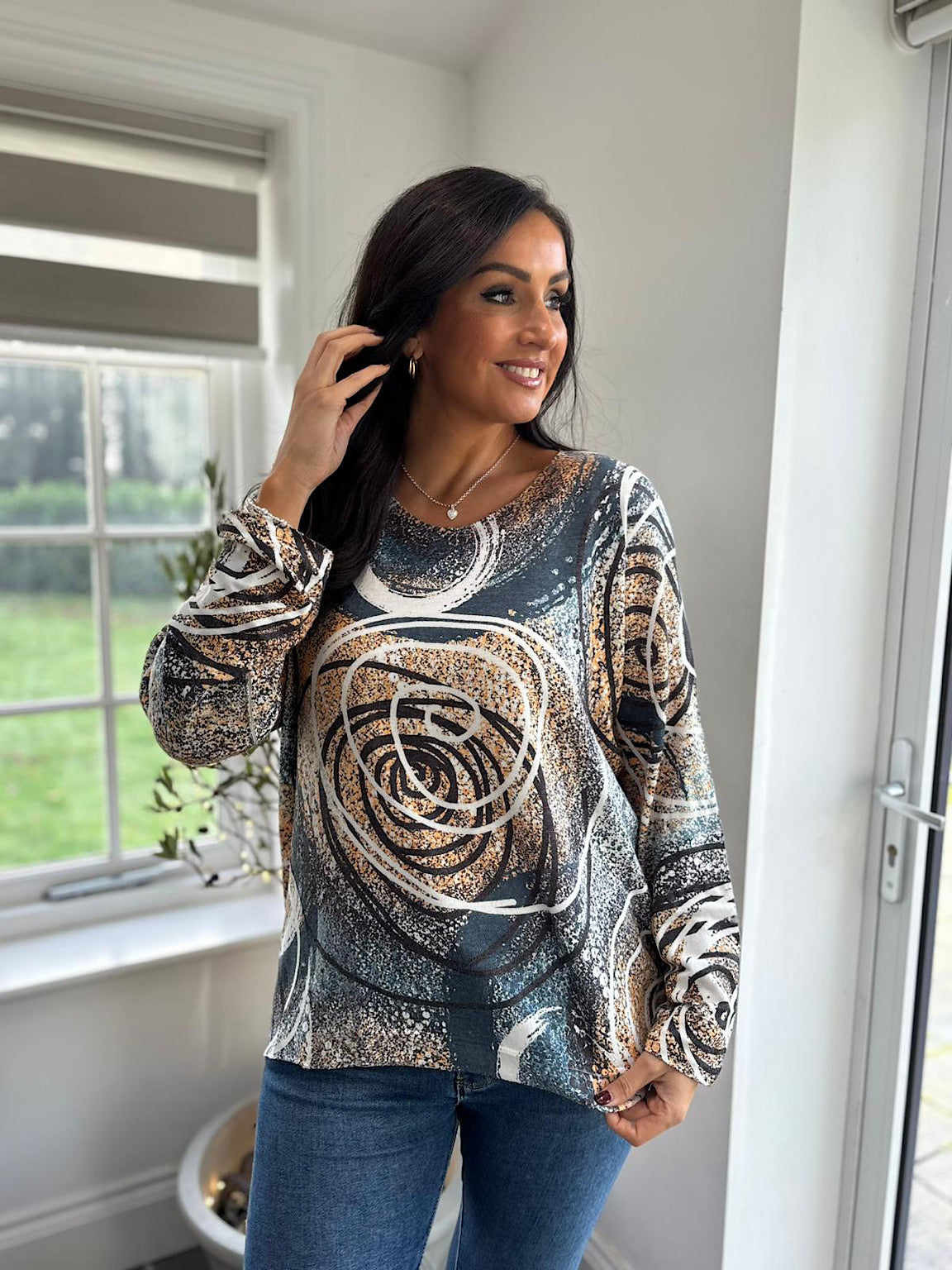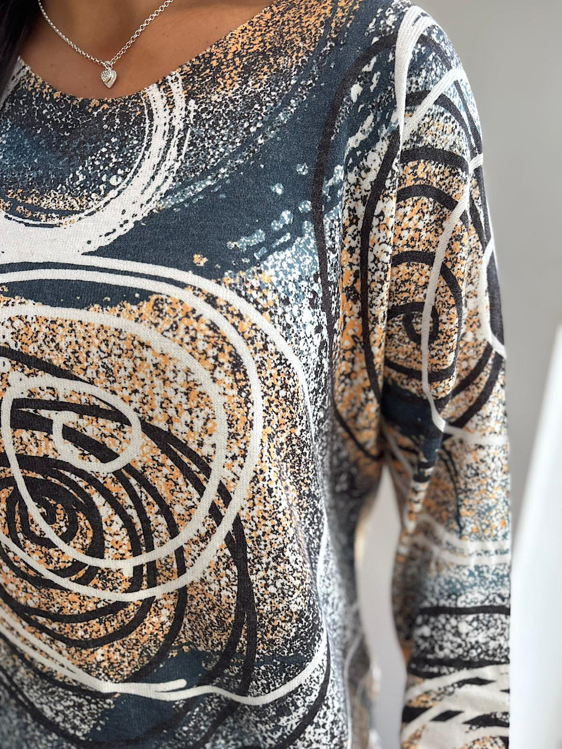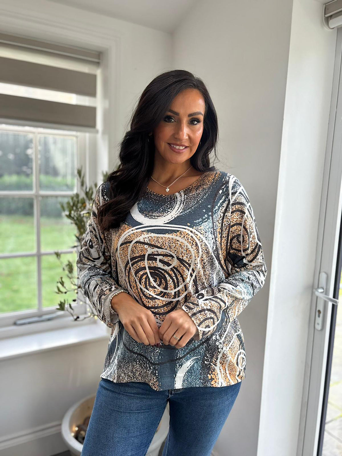 Embrace effortless style with this Navy Circle V Neck Top Amy. Crafted from soft, lightweight fabric, it's designed to keep you comfortable throughout your day. The eye-catching circular swirl pattern sits beautifully against a speckled yellow and navy background, creating a dynamic look that works wonderfully for casual outings or relaxed weekends. The flattering V neckline adds a touch of elegance, making this versatile piece perfect for layering or wearing solo. Whether you're dressing up or keeping things laid-back, this top offers the comfort and visual interest you'll love reaching for again and again.