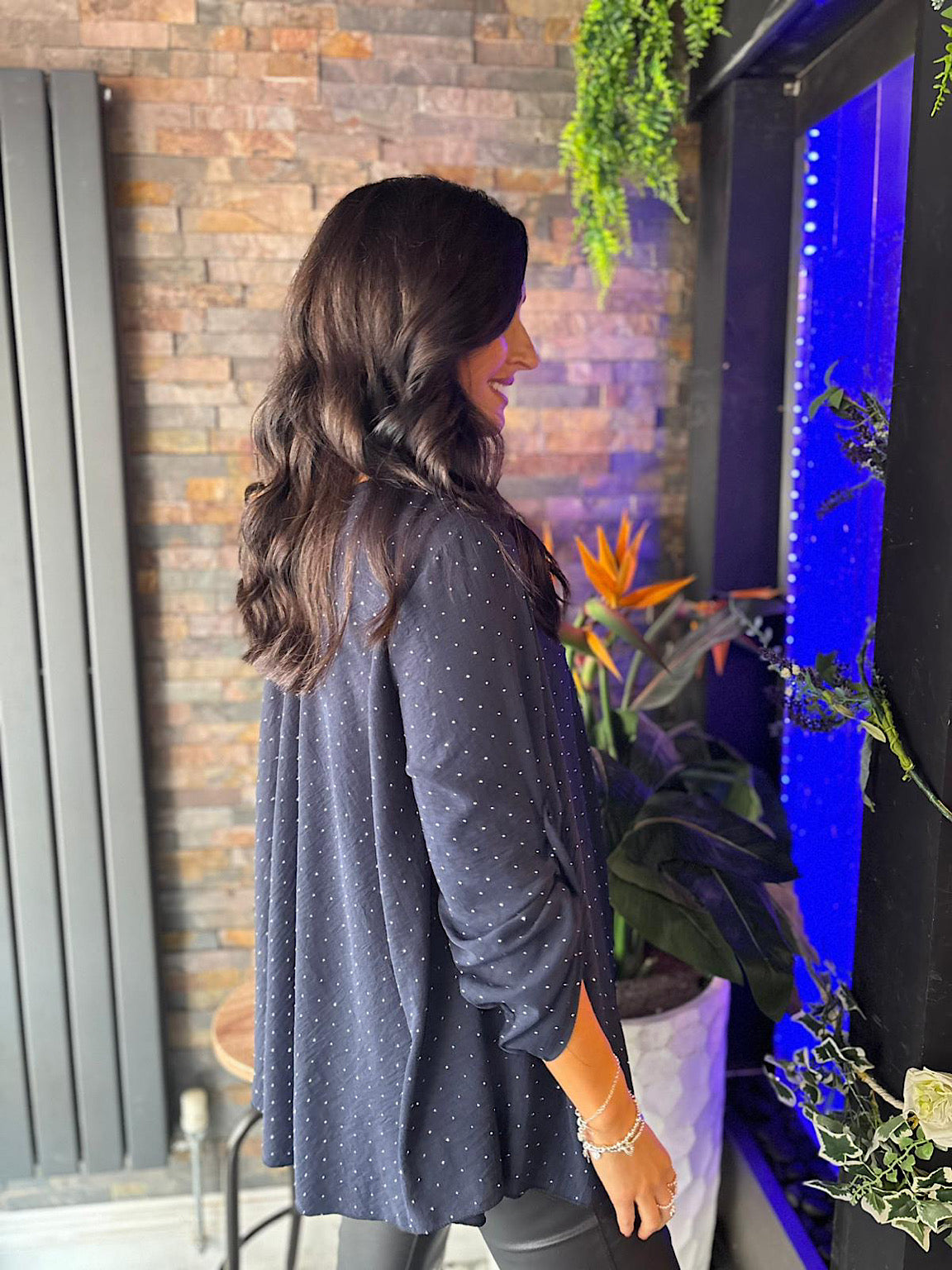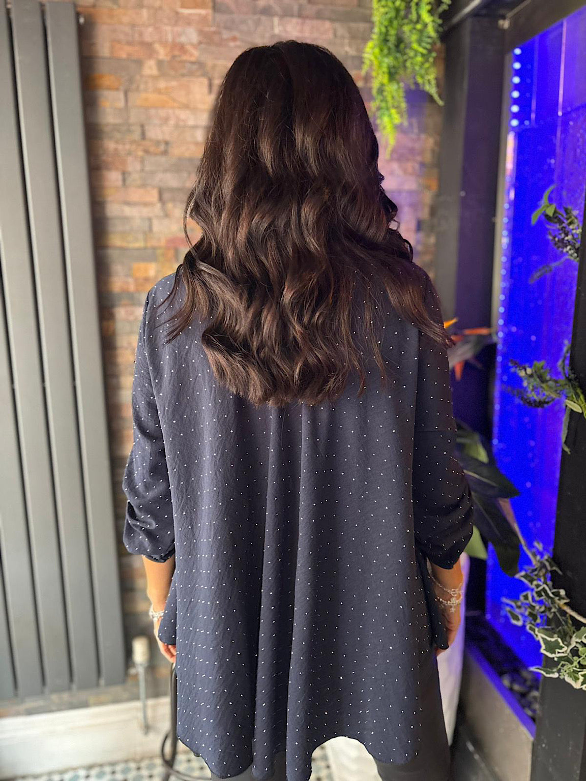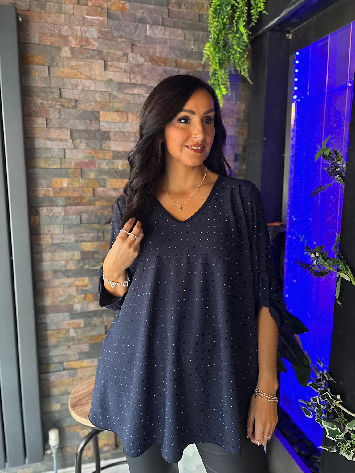 This Diamante V Neck Top Selina features a lightweight, flowy crepe fabric that drapes beautifully for comfortable all-night wear. Adorned with delicate, sparkling diamantes, it adds just the right touch of glam for any party or special occasion. The spacious fit allows for ease of movement, making it both stylish and practical. Perfect for those who want to shine with confidence while staying comfortable.