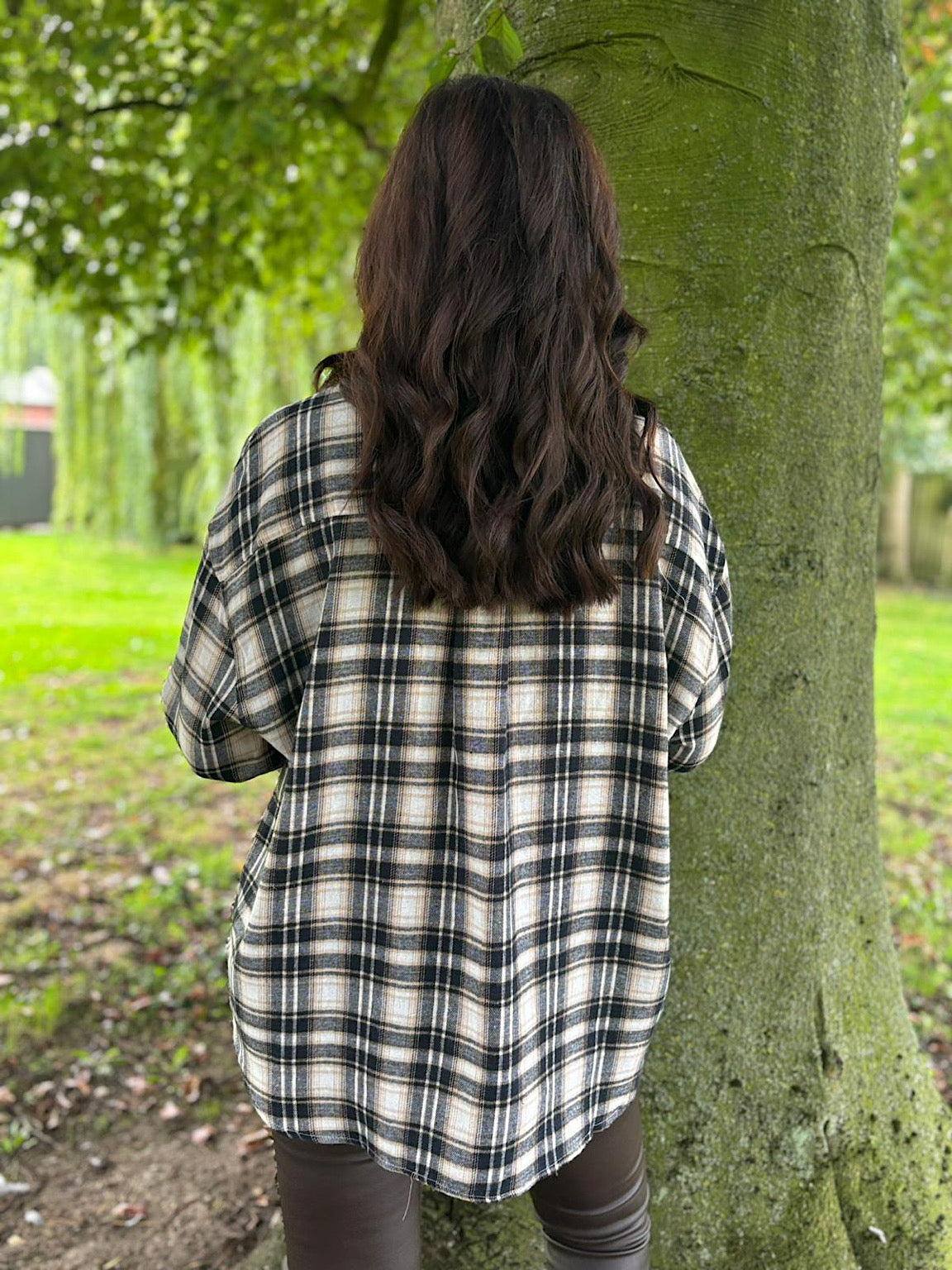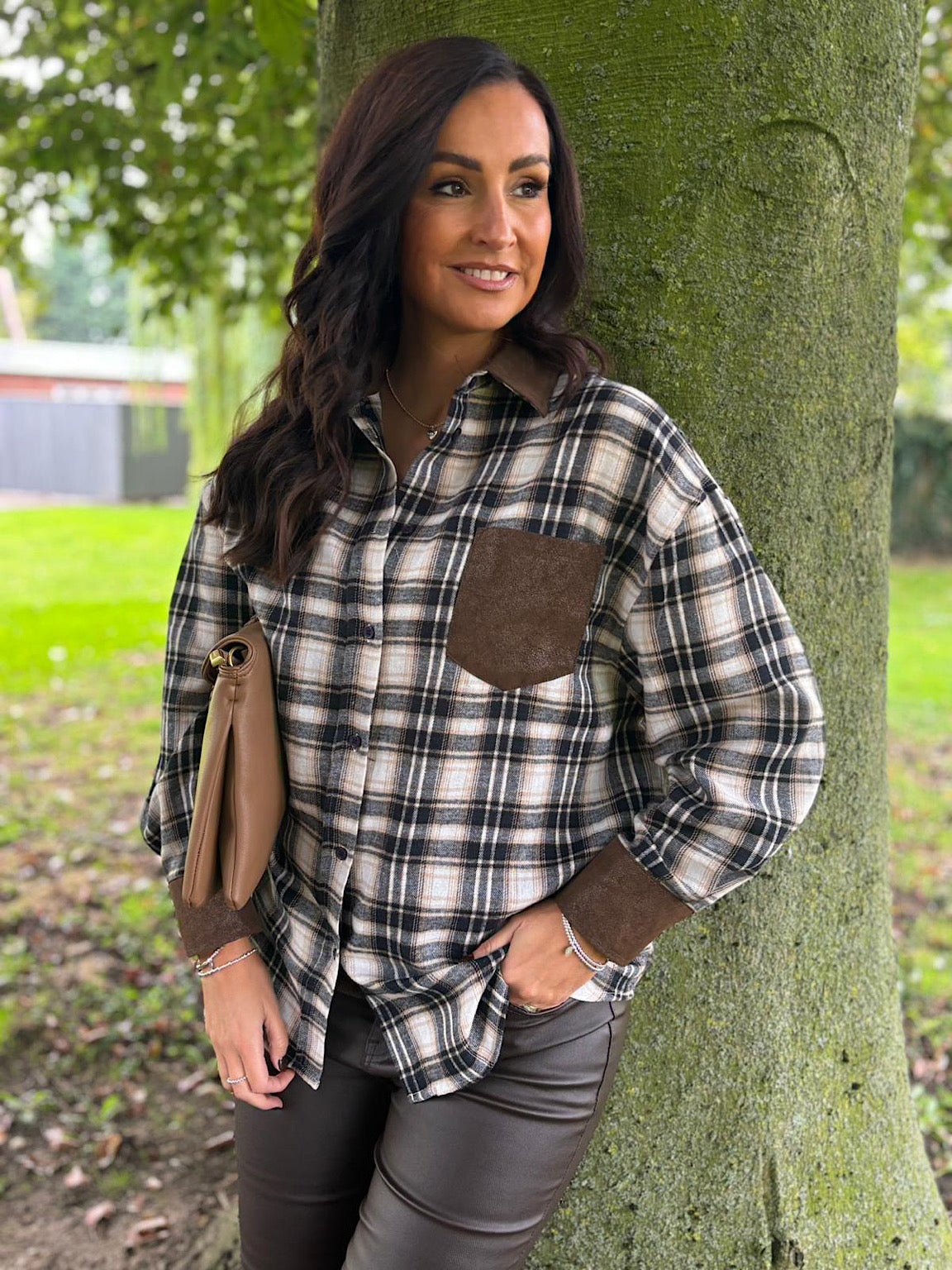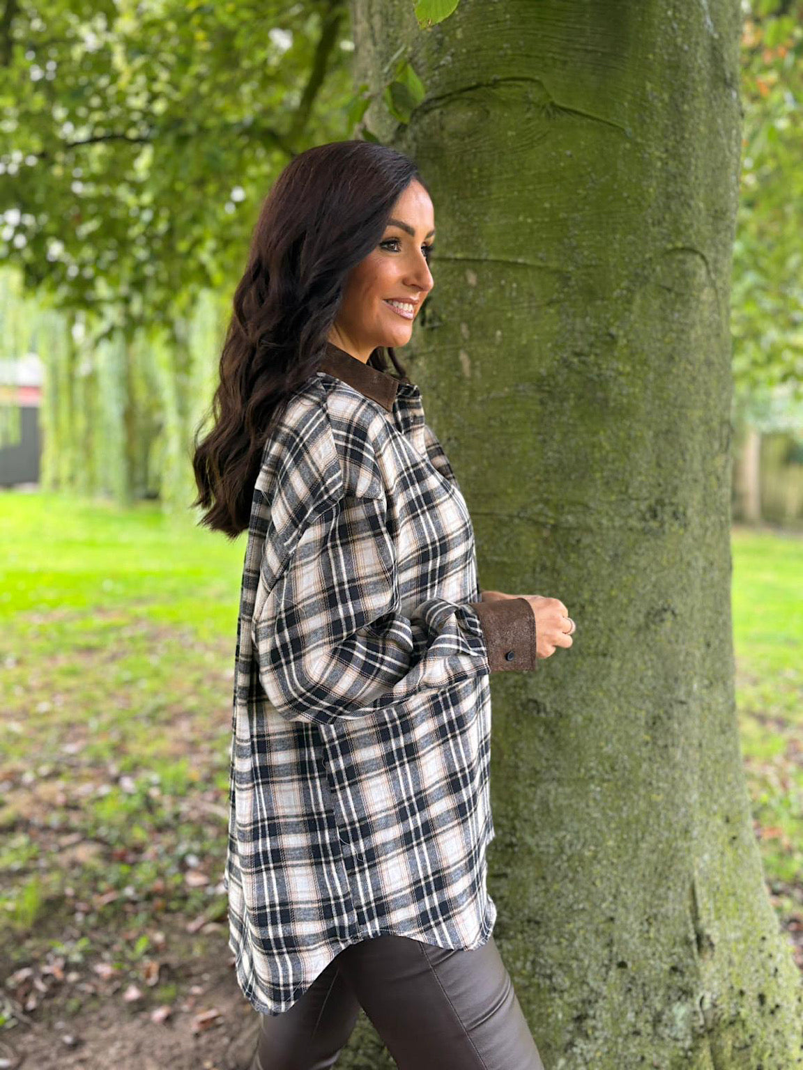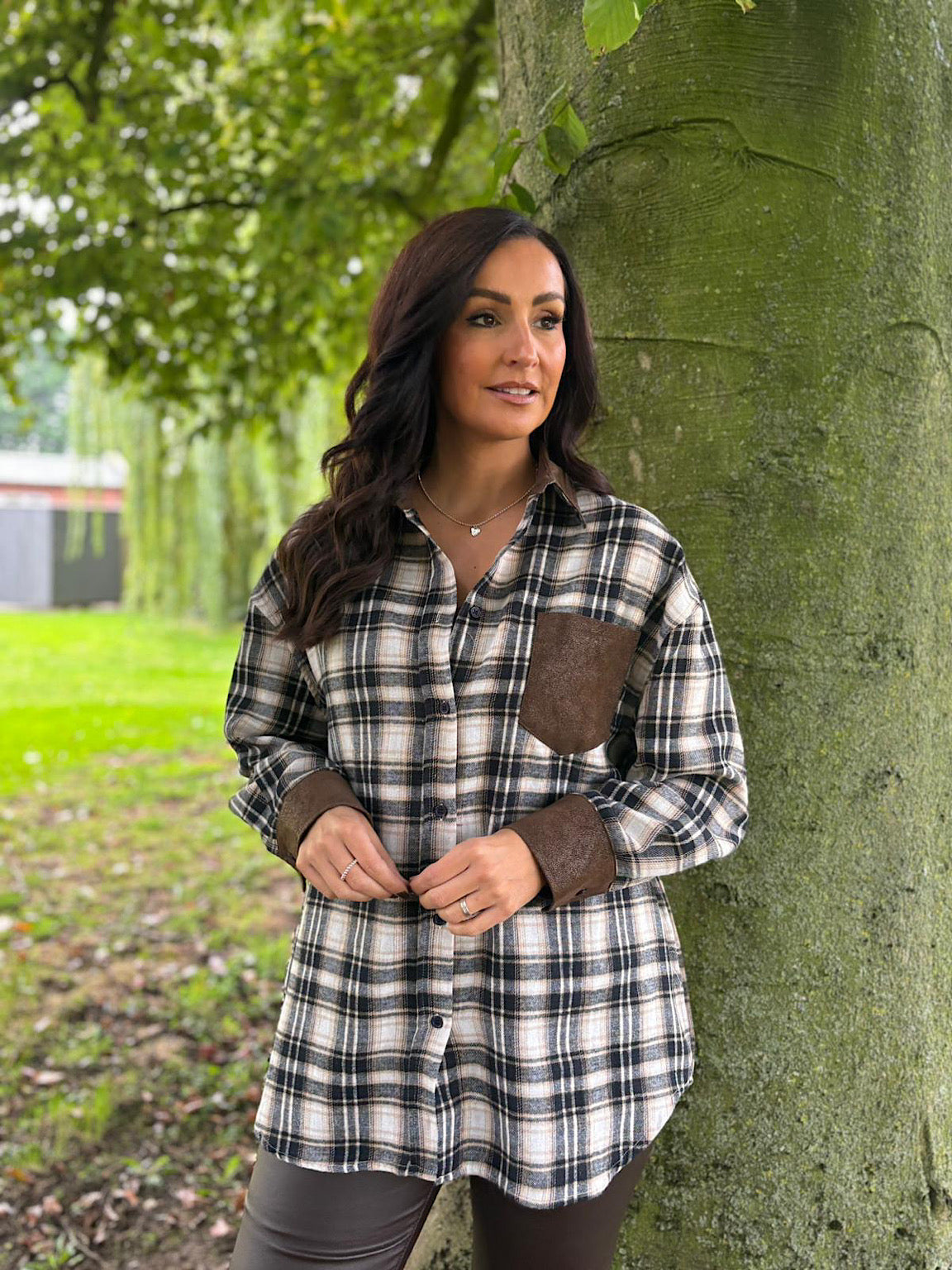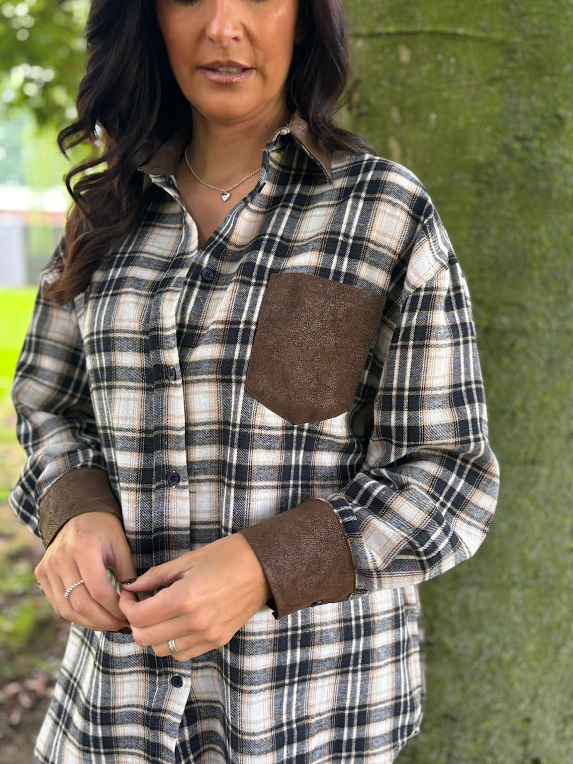 Navy Faux Leather Trim Checked Shirt Jess