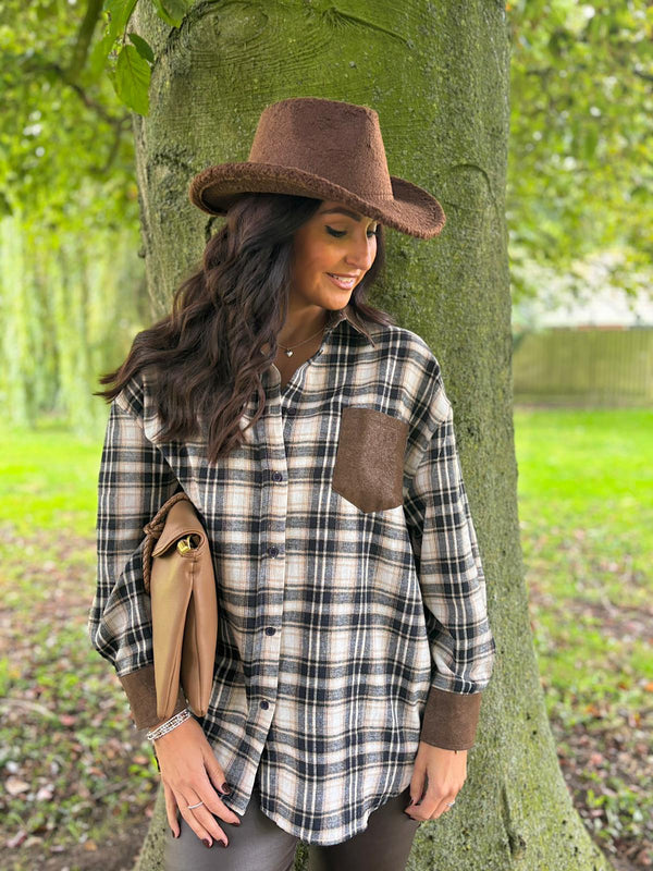 Styled with.....>Chocolate Boucle Cowboy Hat/ Camel Braid Fasten Shoulder Bag/ Mocha Floral Detail Western Boots/ Chocolate Coated Trousers