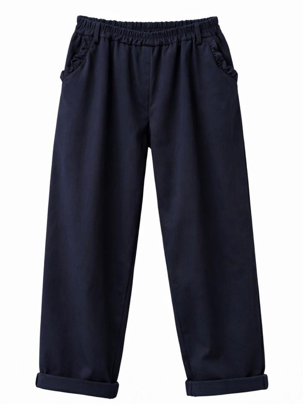 These Frill Pocket Trousers offer a comfortable, flattering fit thanks to their slight stretch fabric reminiscent of our magic trousers, adapting to your shape throughout the day. Featuring delicate frill detailing on the pockets and practical belt loops, they combine subtle style with everyday functionality. Perfect for adding a touch of refined charm to your wardrobe while ensuring all-day comfort