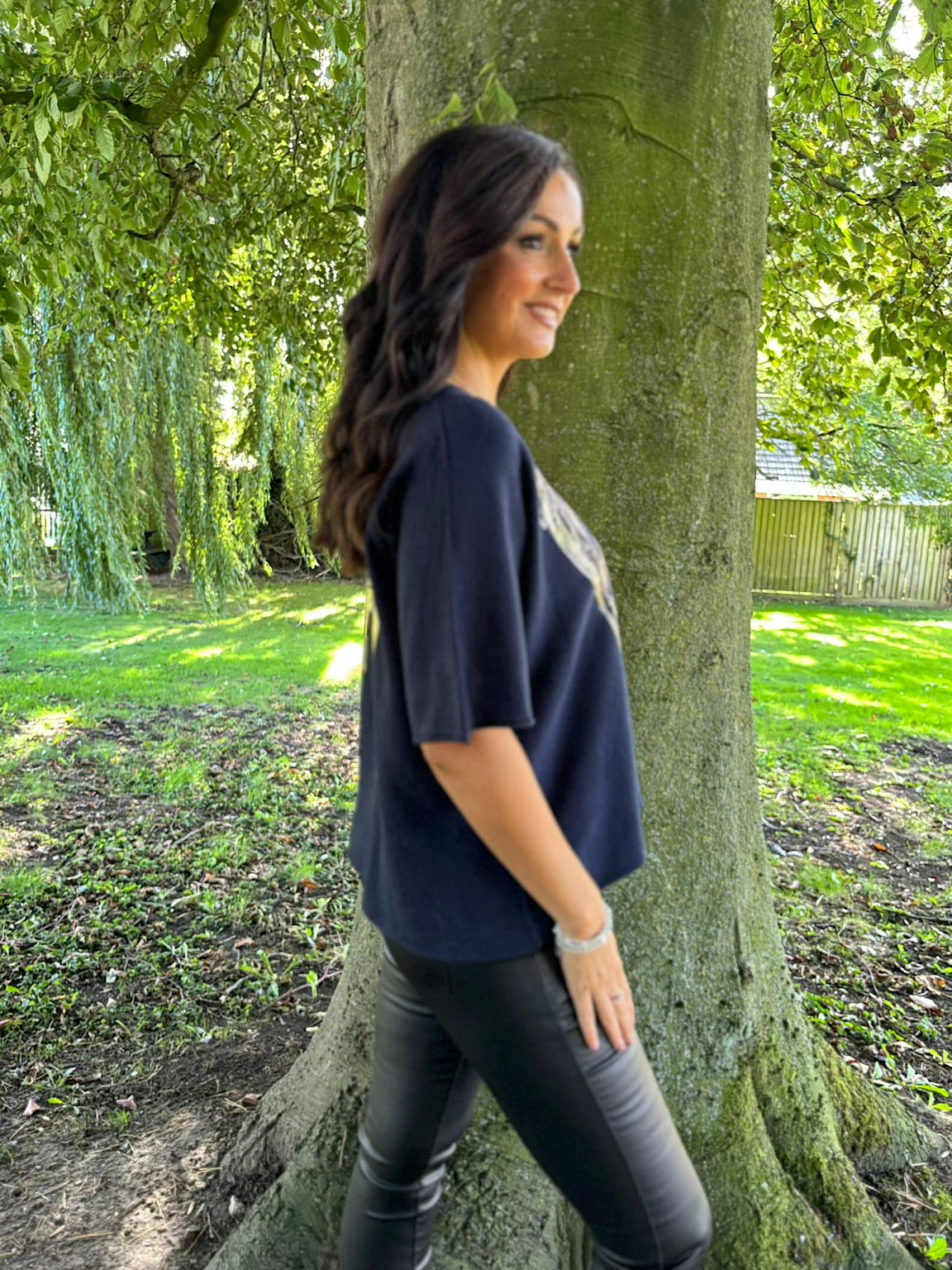 Elevate your wardrobe with the Gold Angel Wings Knit Florence, featuring a soft, knitted fabric that offers both comfort and elegance. This sophisticated top showcases striking gold wings printed on both sides, creating a unique and stylish statement piece perfect for refined casual wear.