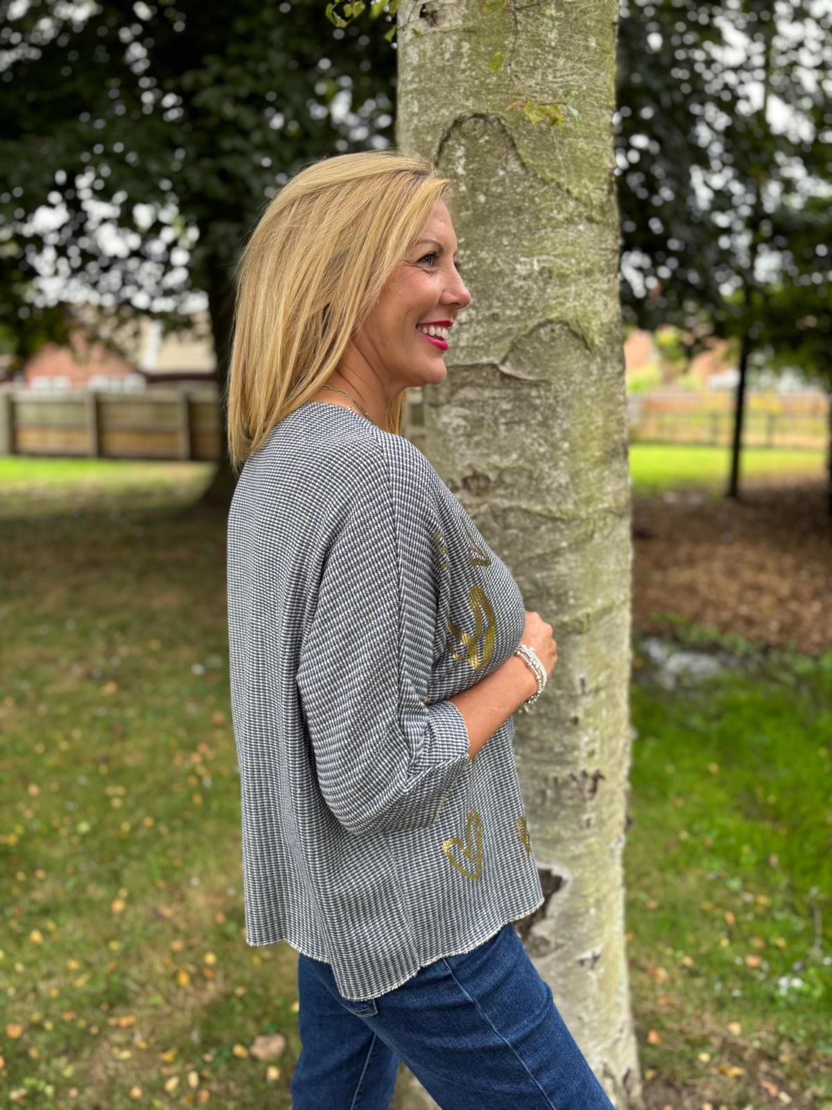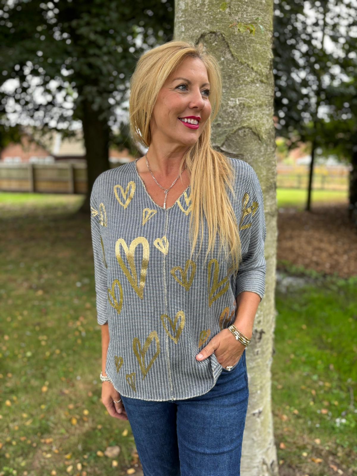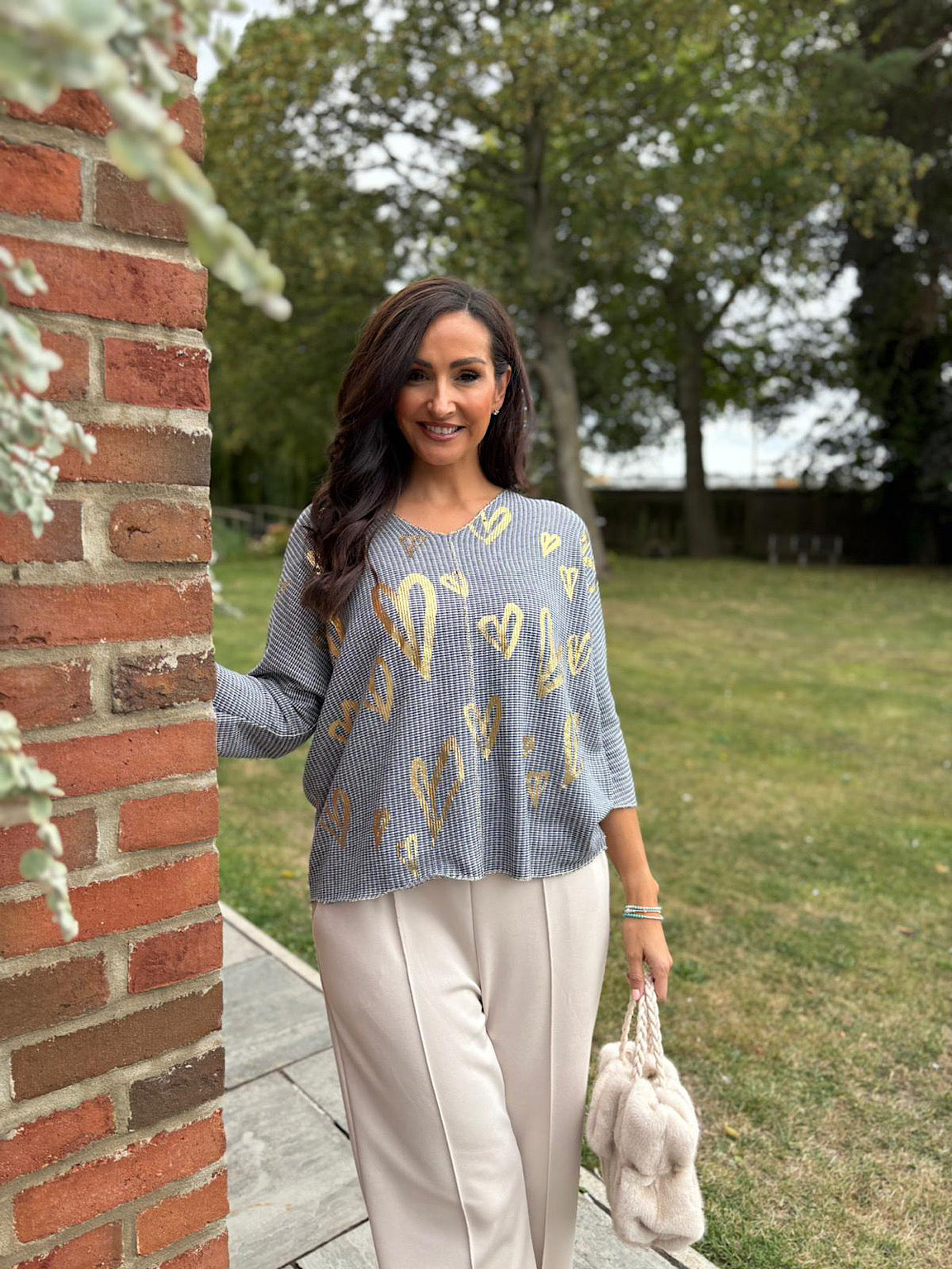 The Gold Heart Knit Top Jenna features delicate gold lurex woven throughout the fabric, adding a subtle shimmer to your look. Gold foil hearts create a charming detail that stands out beautifully. Lightweight and comfortable, this top is perfect for layering or wearing on its own, providing style and ease for everyday wear.
