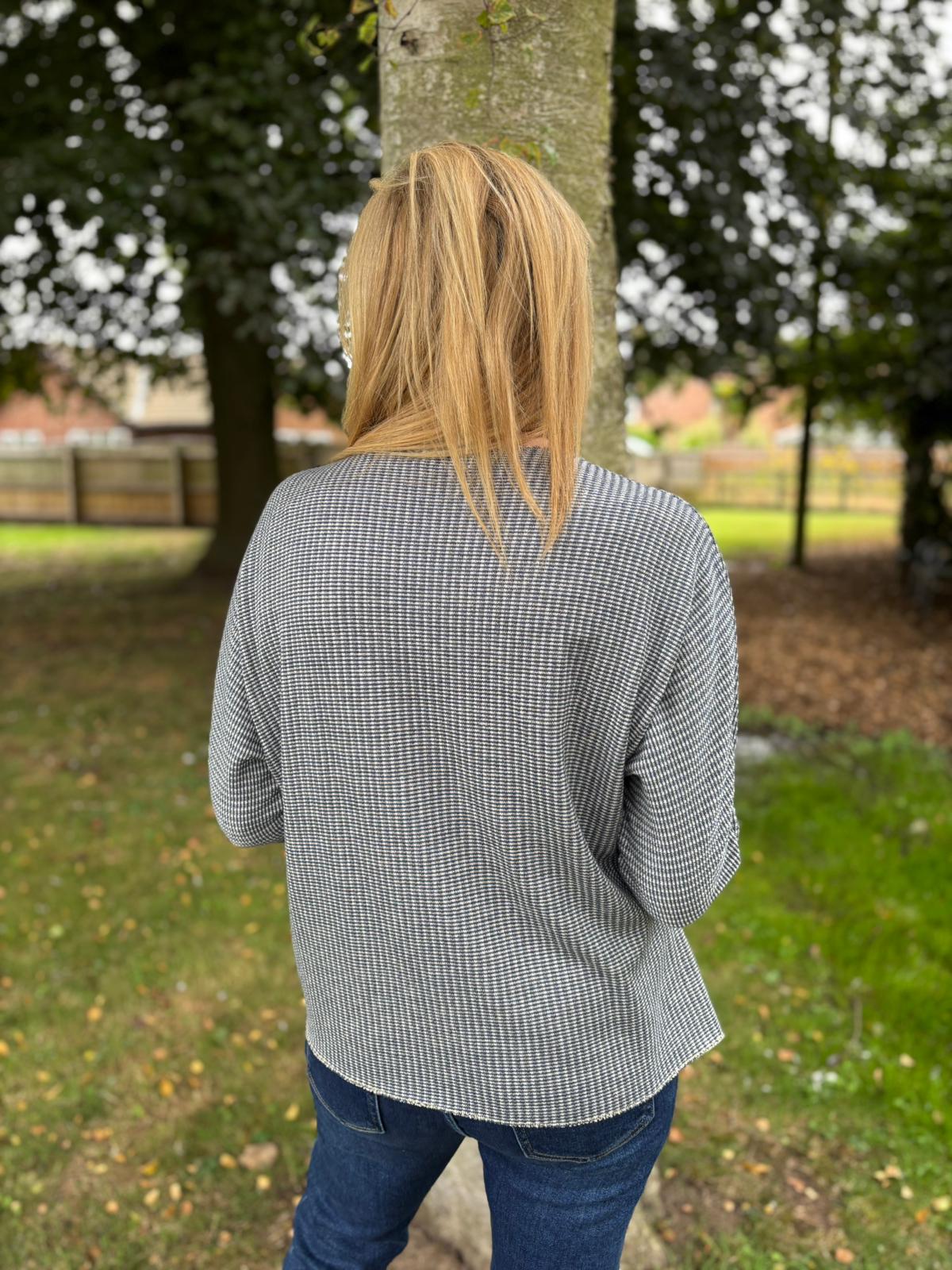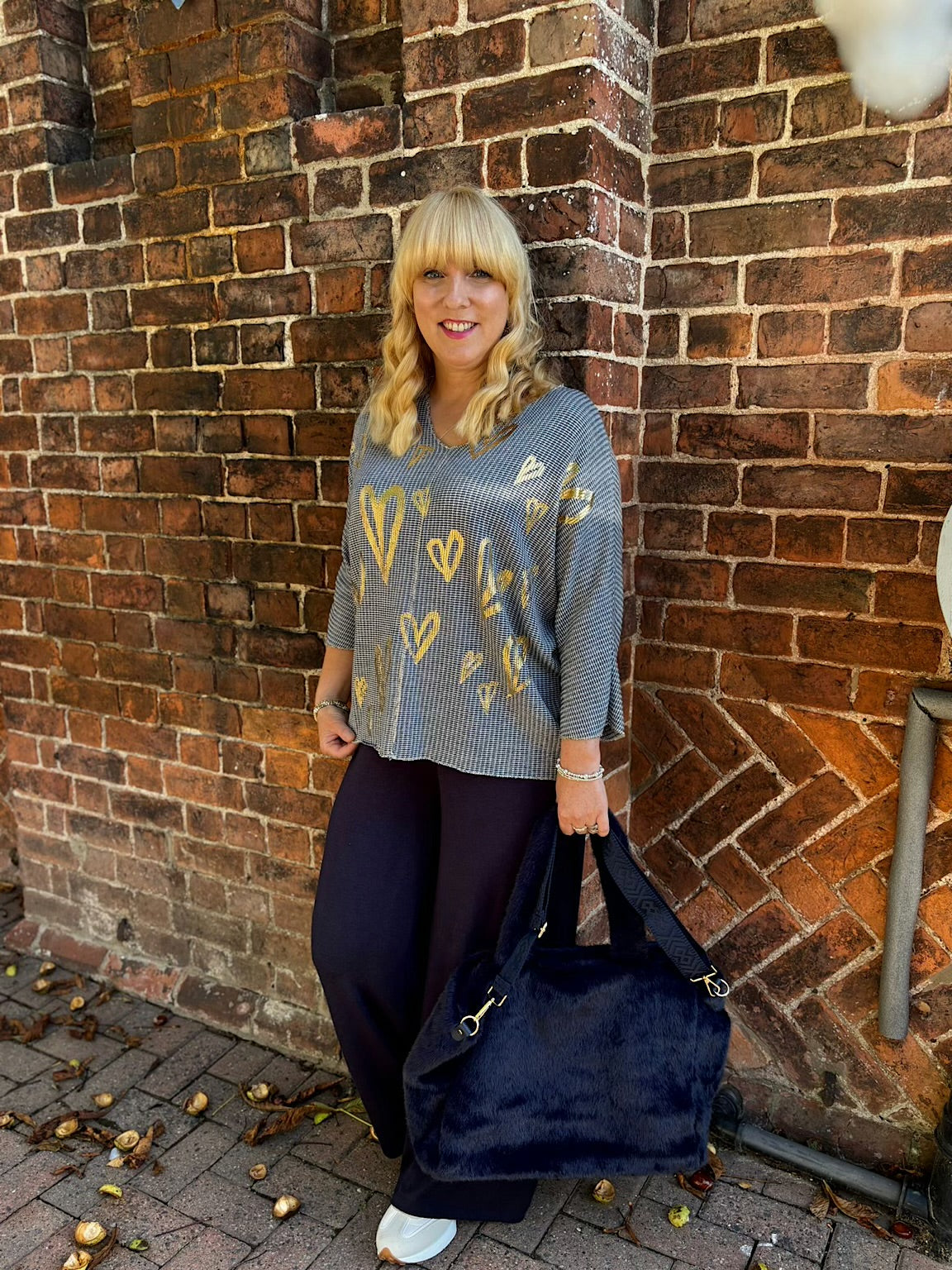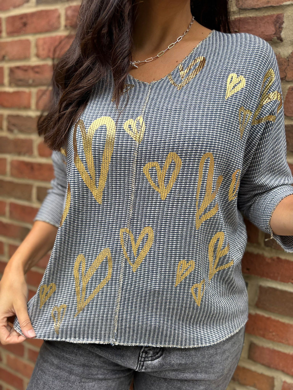 The Gold Heart Knit Top Jenna features delicate gold lurex woven throughout the fabric, adding a subtle shimmer to your look. Gold foil hearts create a charming detail that stands out beautifully. Lightweight and comfortable, this top is perfect for layering or wearing on its own, providing style and ease for everyday wear.