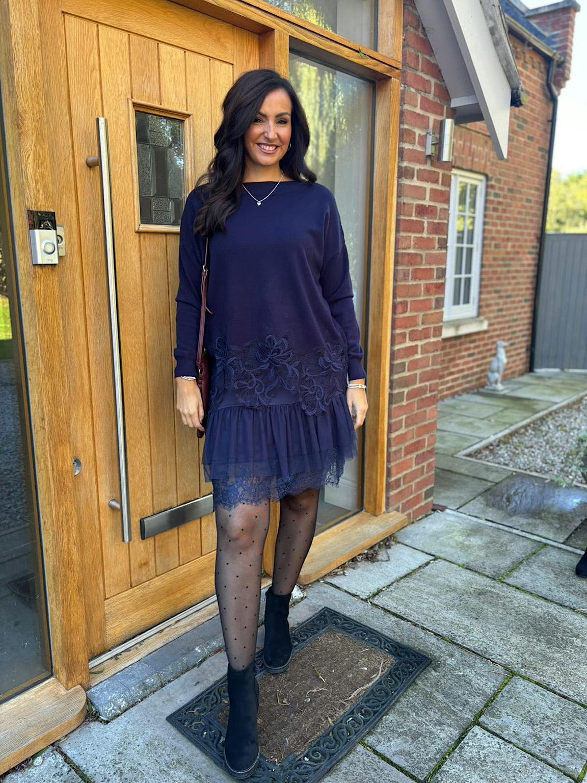 Styled with......> Navy Half Mesh Slip Olivia/ Black Polka Dot Tights/ Black Zip Wedge Boots