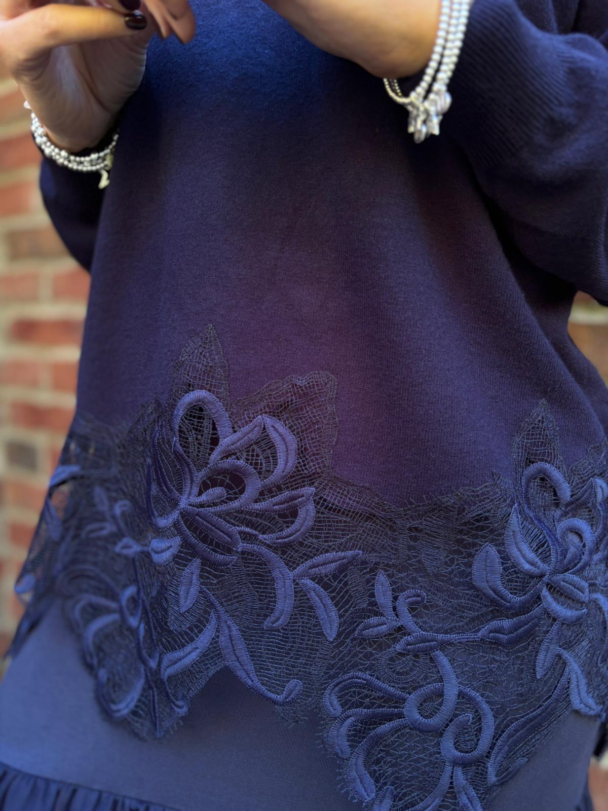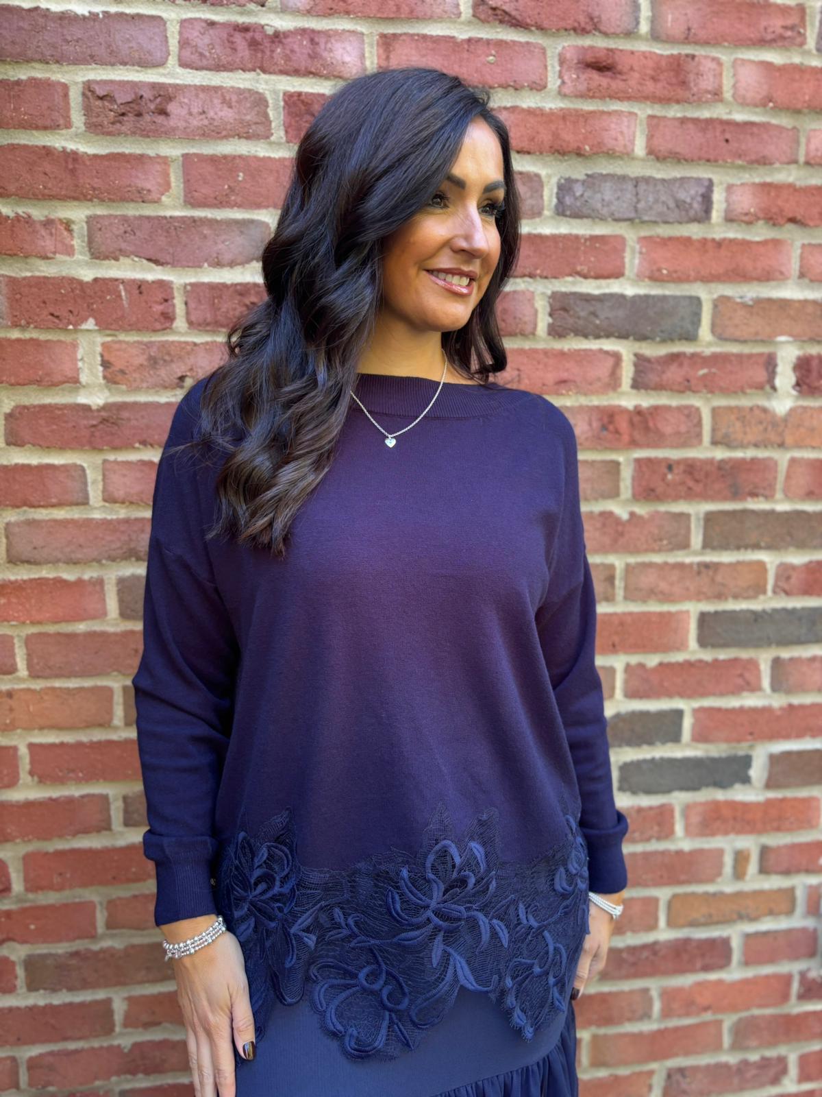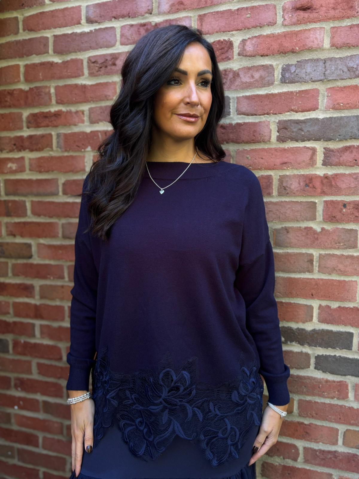 The Lace Detail Knit Rachel combines a luxuriously soft fabric with a refined lace trim along the bottom, adding an understated elegance. It features a spacious design, and a ribbed neckline that provides comfortable wear, making it an ideal choice for a sophisticated yet effortless look.
