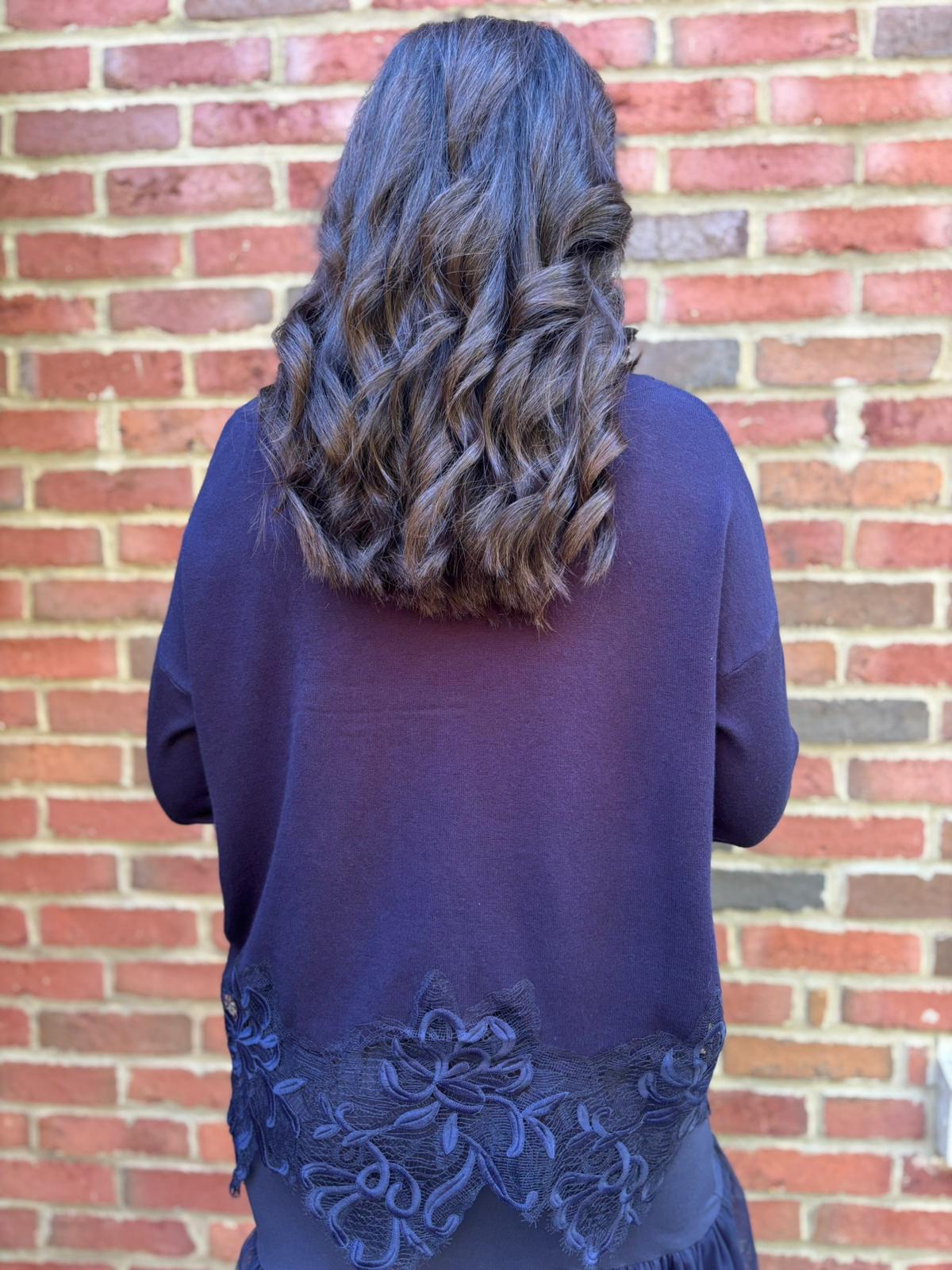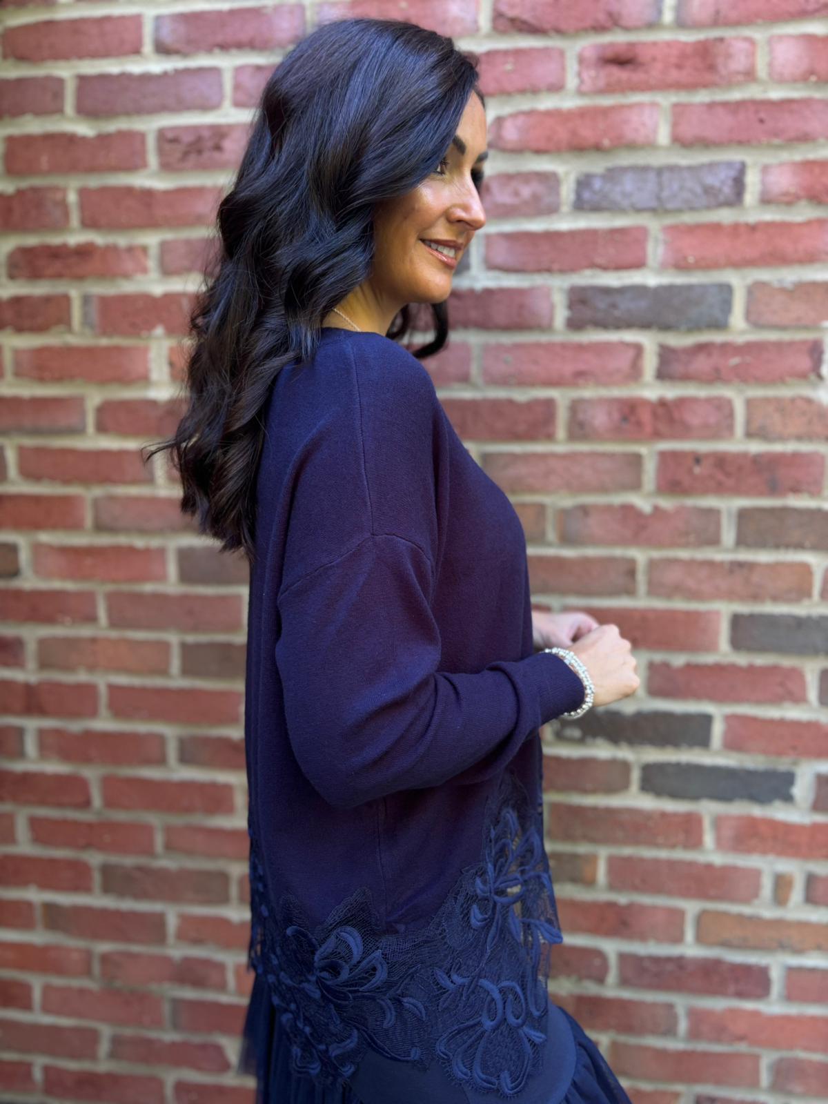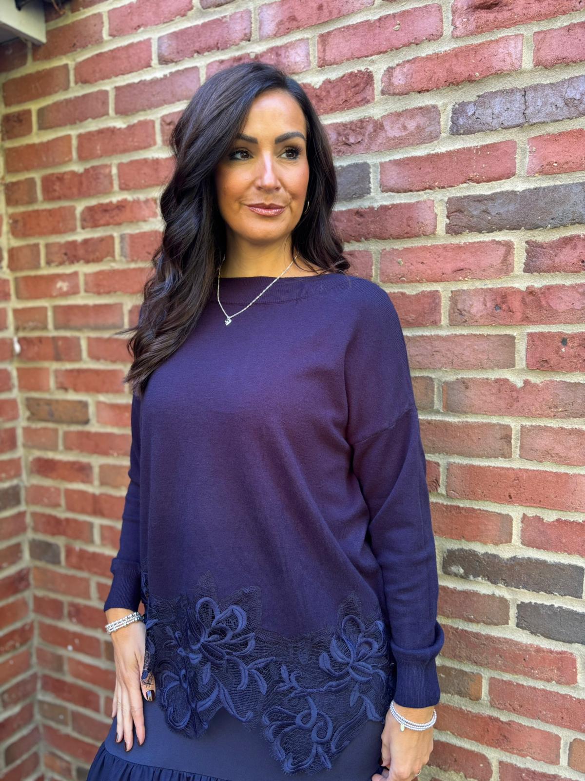 The Lace Detail Knit Rachel combines a luxuriously soft fabric with a refined lace trim along the bottom, adding an understated elegance. It features a spacious design, and a ribbed neckline that provides comfortable wear, making it an ideal choice for a sophisticated yet effortless look.