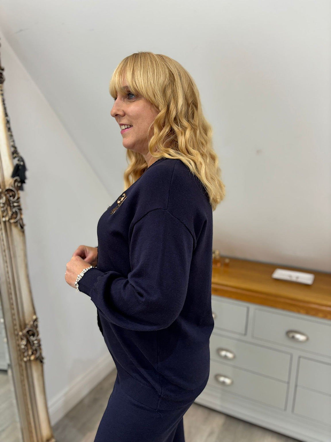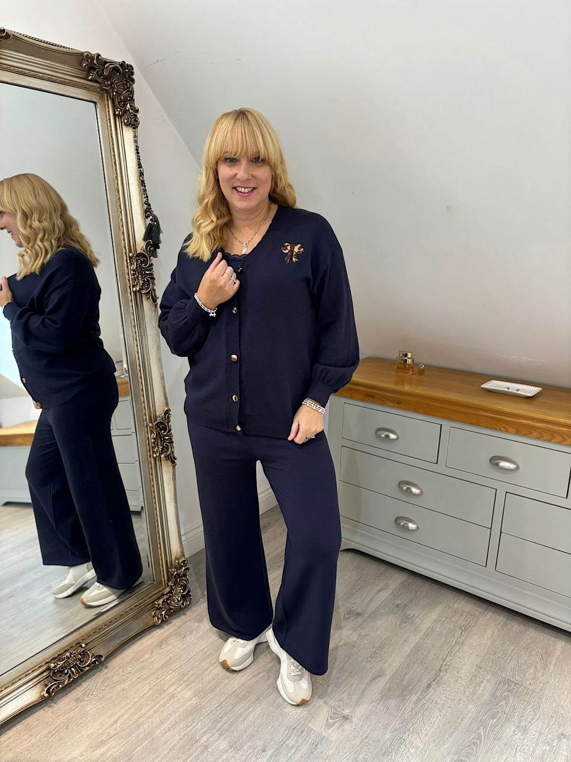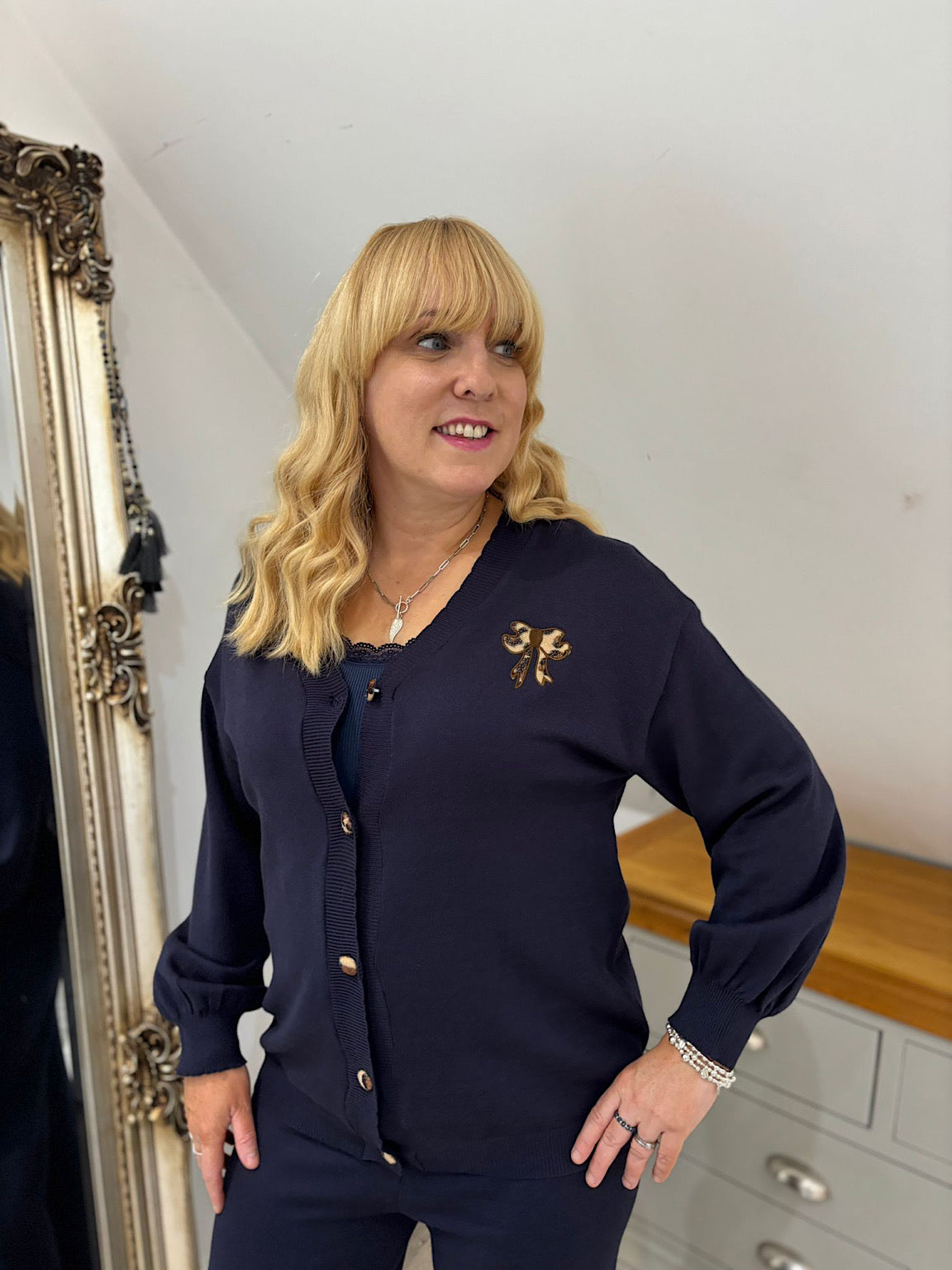 The Leopard Bow Cardi Georgina is made from quality fabric for a comfortable and durable wear. It features a button fastening for easy wear, complemented by an embroidered leopard print bow with gold fleck accents, adding a touch of stylish elegance. This cardigan is designed to support your wardrobe with both practicality and a refined look. Pair with our Georgina Trousers for a complete look.