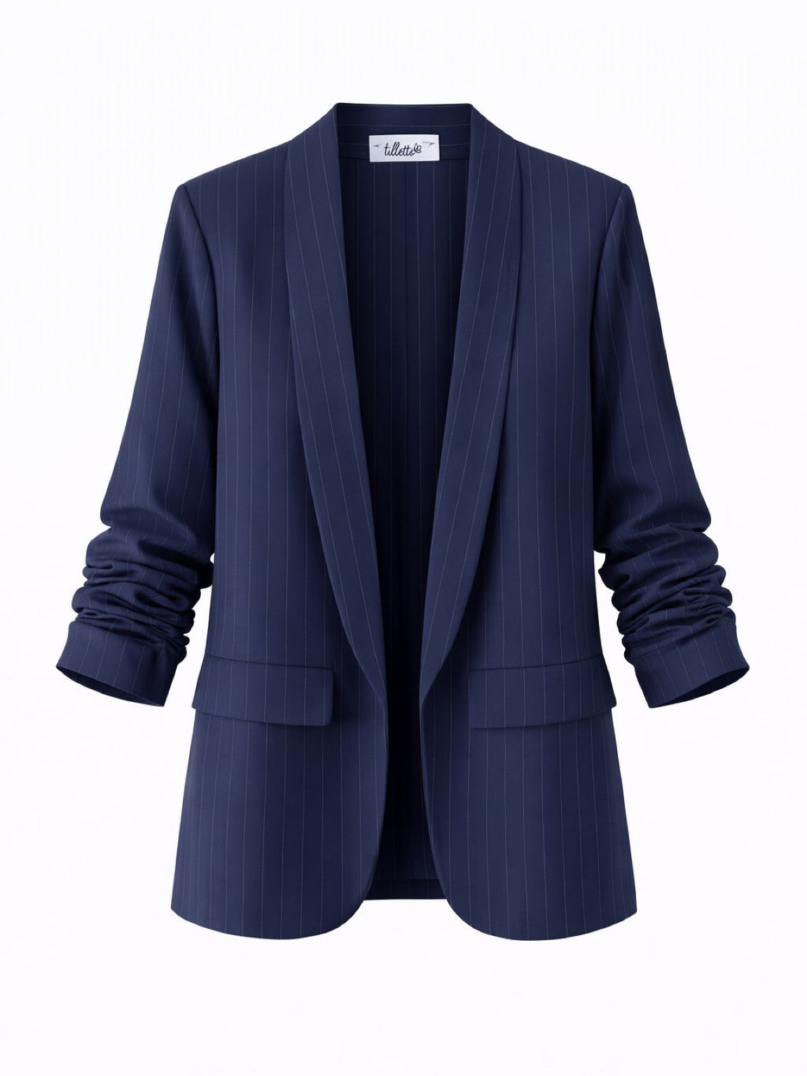 The Pinstripe Take You Anywhere Jacket combines classic tailoring with modern details for versatile wear. Featuring subtle pinstripes, ruched sleeves, and structured shoulder pads, it offers a refined silhouette with added comfort. Designed for effortless style, this jacket adapts seamlessly from professional settings to casual outings.