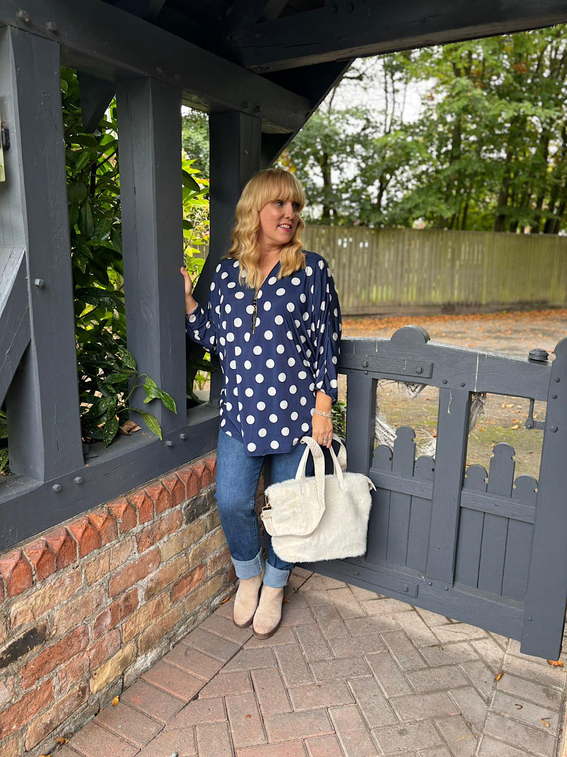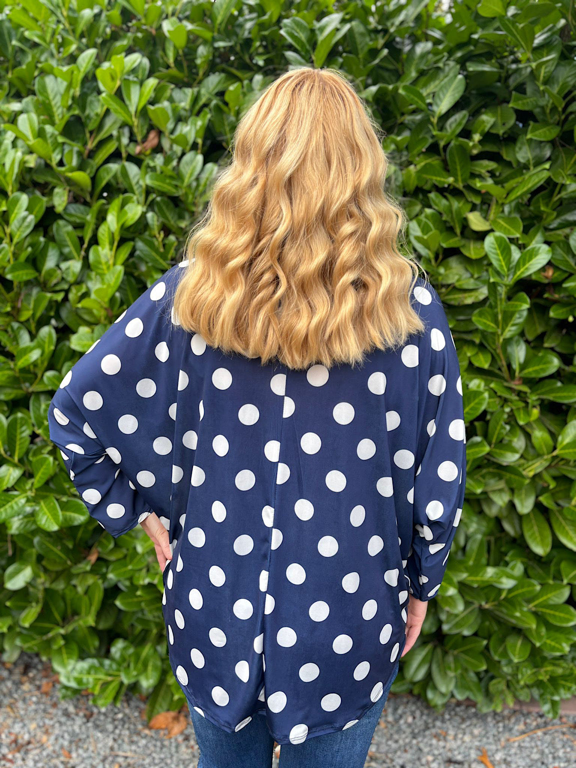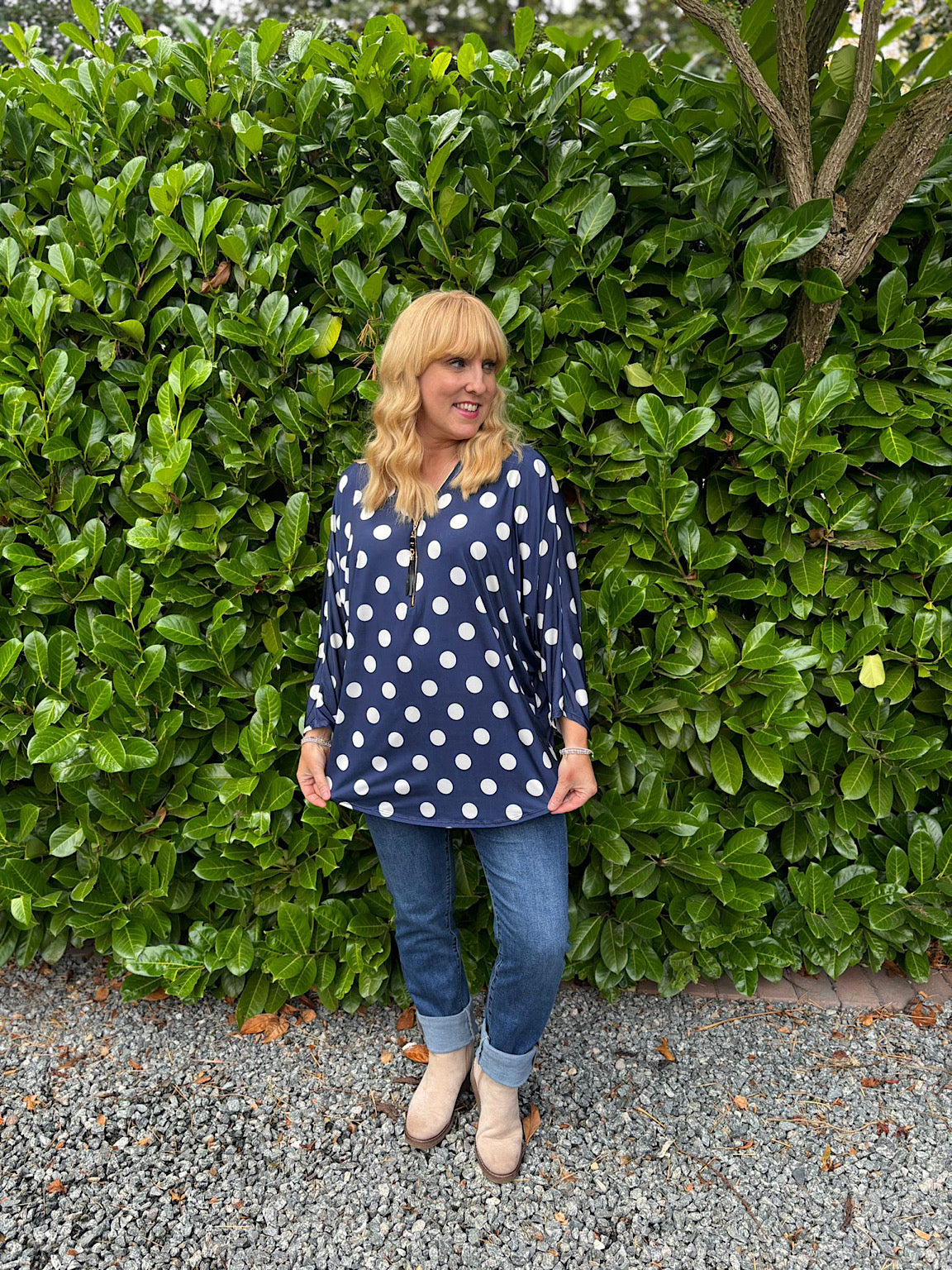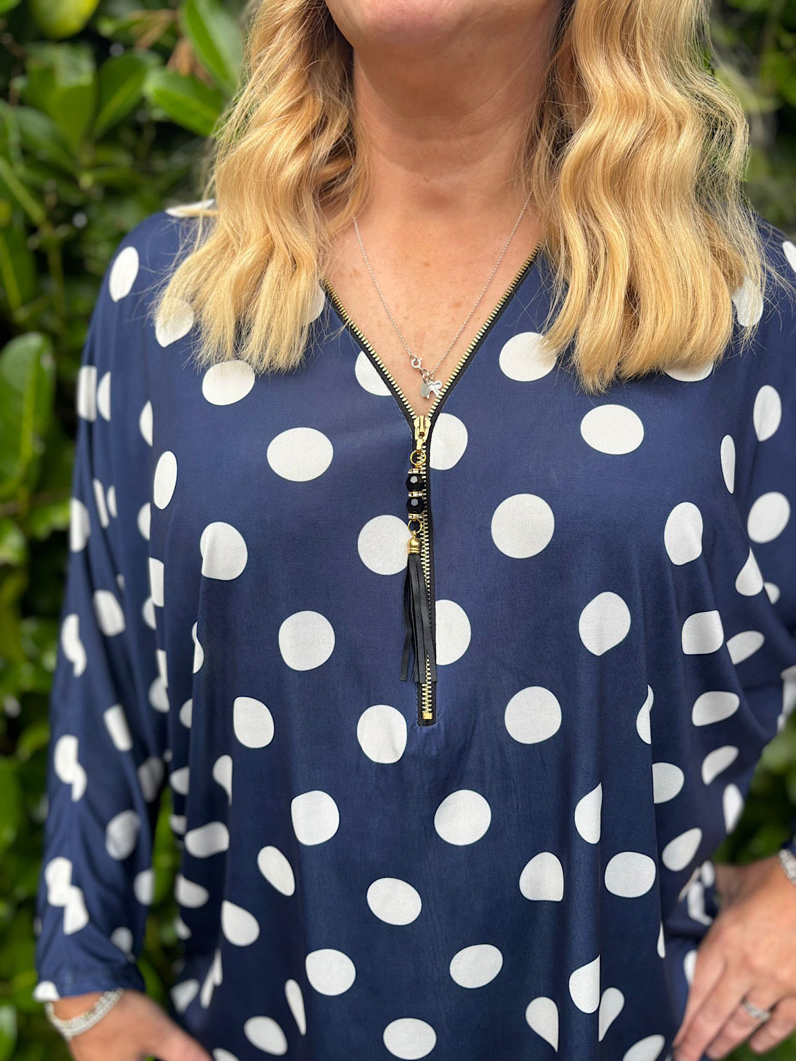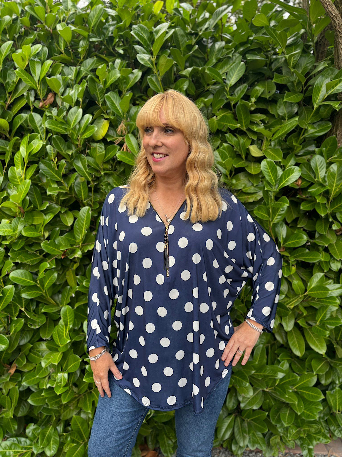 This Polka Dot Zip Top Poppy features elegant batwing sleeves that offer a flattering silhouette and comfortable fit. Crafted from smooth, flowing material, it drapes beautifully on the body. The zip closure is adorned with a stylish tassel detail, adding a subtle touch of charm to this versatile and supportive top. Perfect for adding sophistication and ease to your wardrobe.