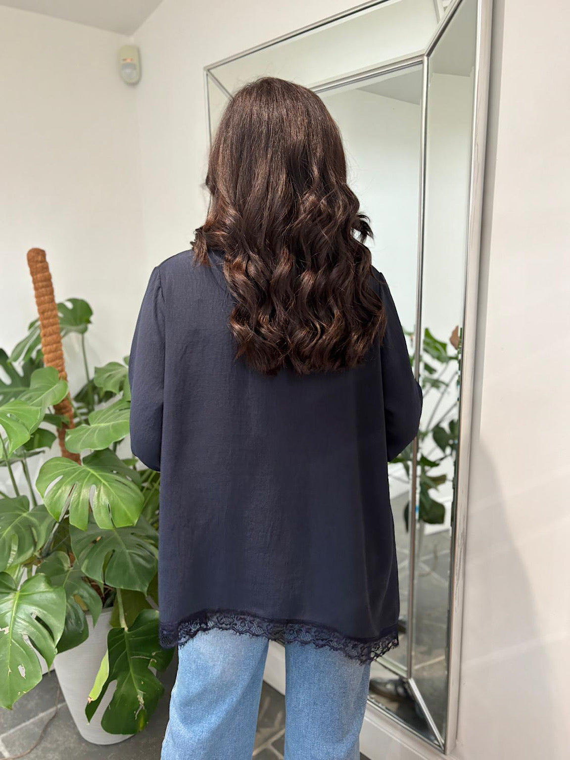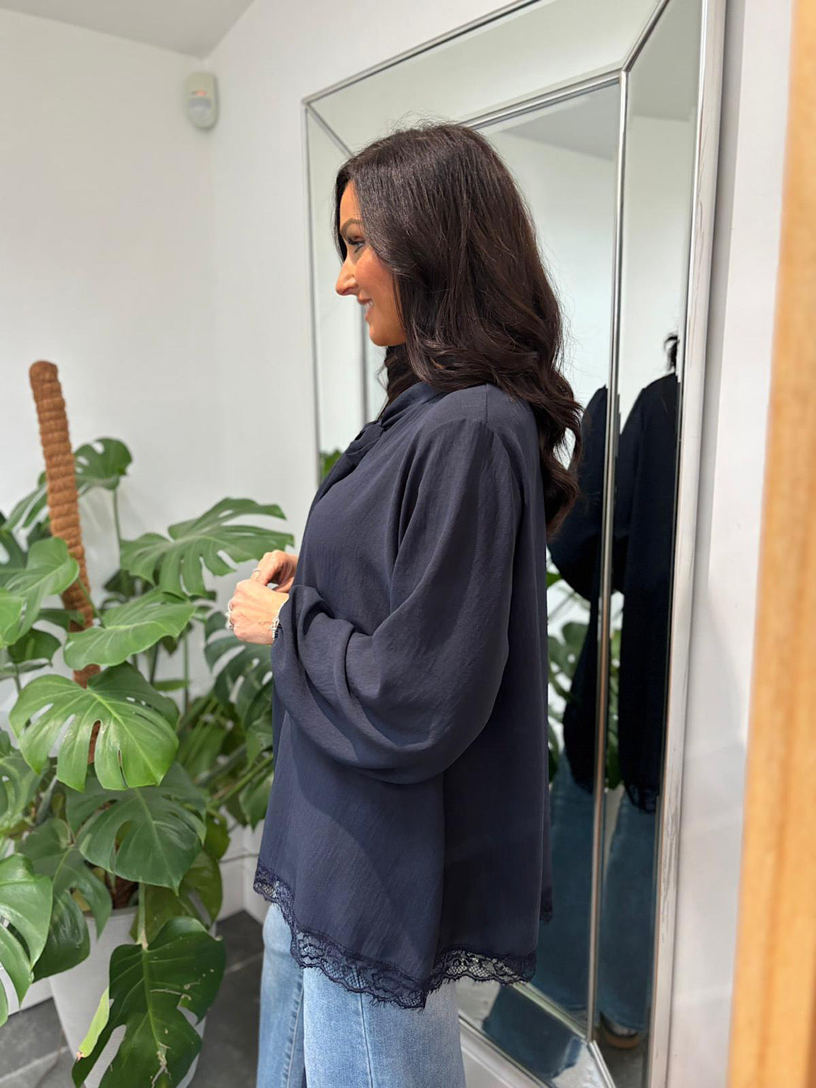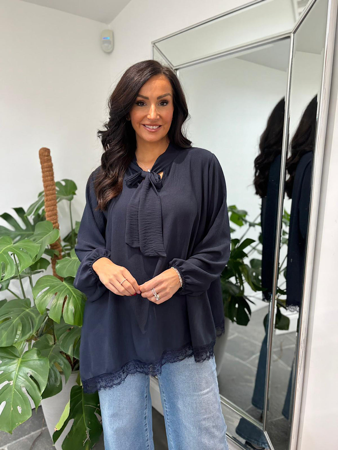 Pussy Bow Blouse Ellis Elevate your wardrobe with this sophisticated blouse, crafted from luxurious crepe-style material that drapes beautifully and moves with you throughout the day. The signature pussy bow at the neckline adds a touch of timeless elegance, while delicate lace detailing along the hem brings an extra layer of refinement. Perfect for both professional settings and special occasions, this versatile piece deserves a place in every woman's collection.