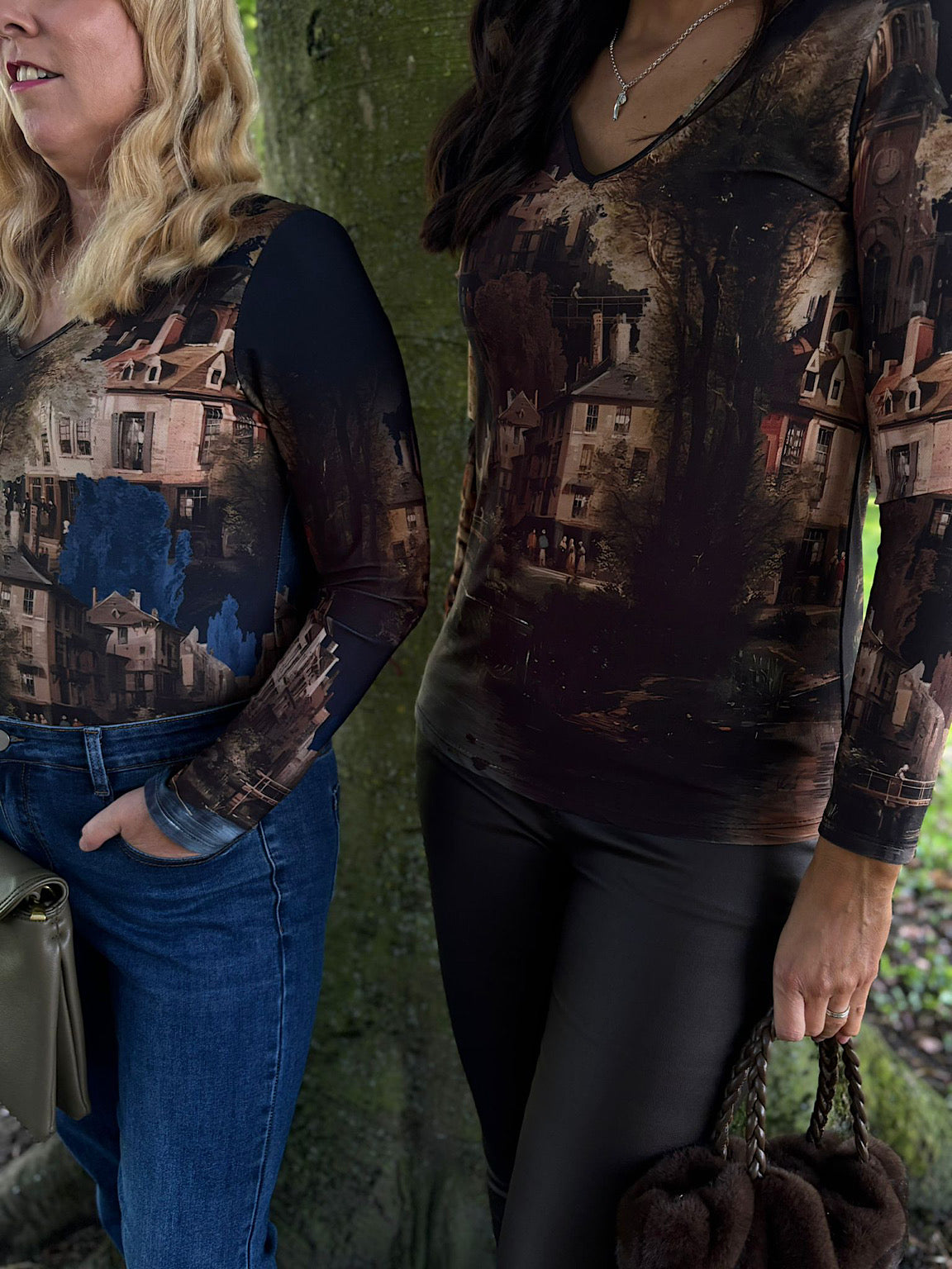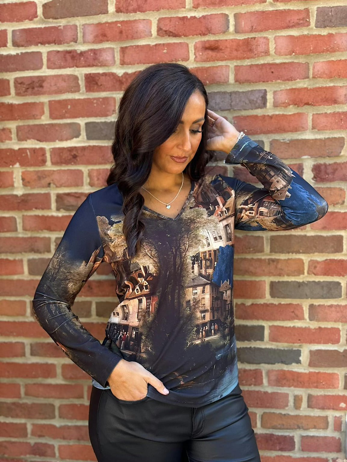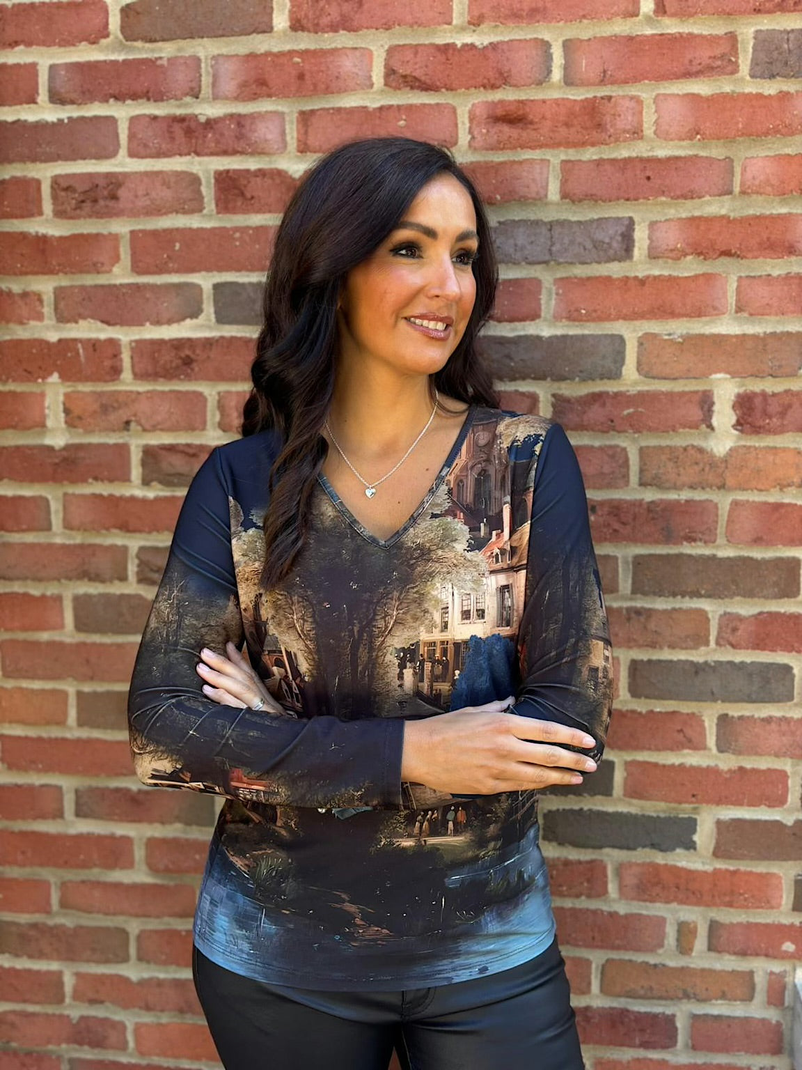 Elevate your wardrobe with the Scenic Printed Top River, featuring a refined long sleeve silhouette and an elegant V-neckline. The exquisite scenic print adds a subtle artistic touch, perfect for sophisticated casual or office wear. Crafted for both comfort and style, this top seamlessly blends classic design with contemporary flair.