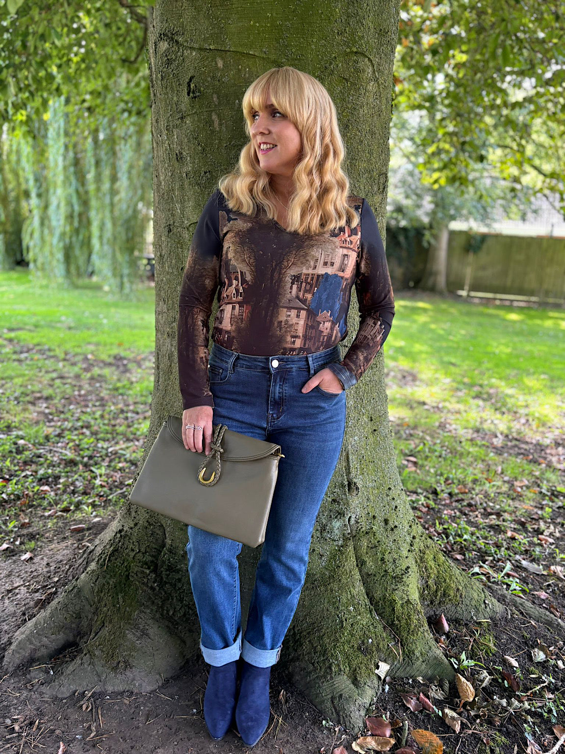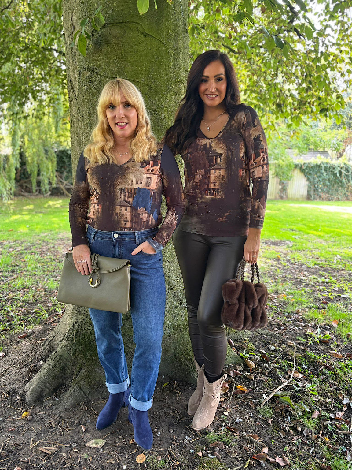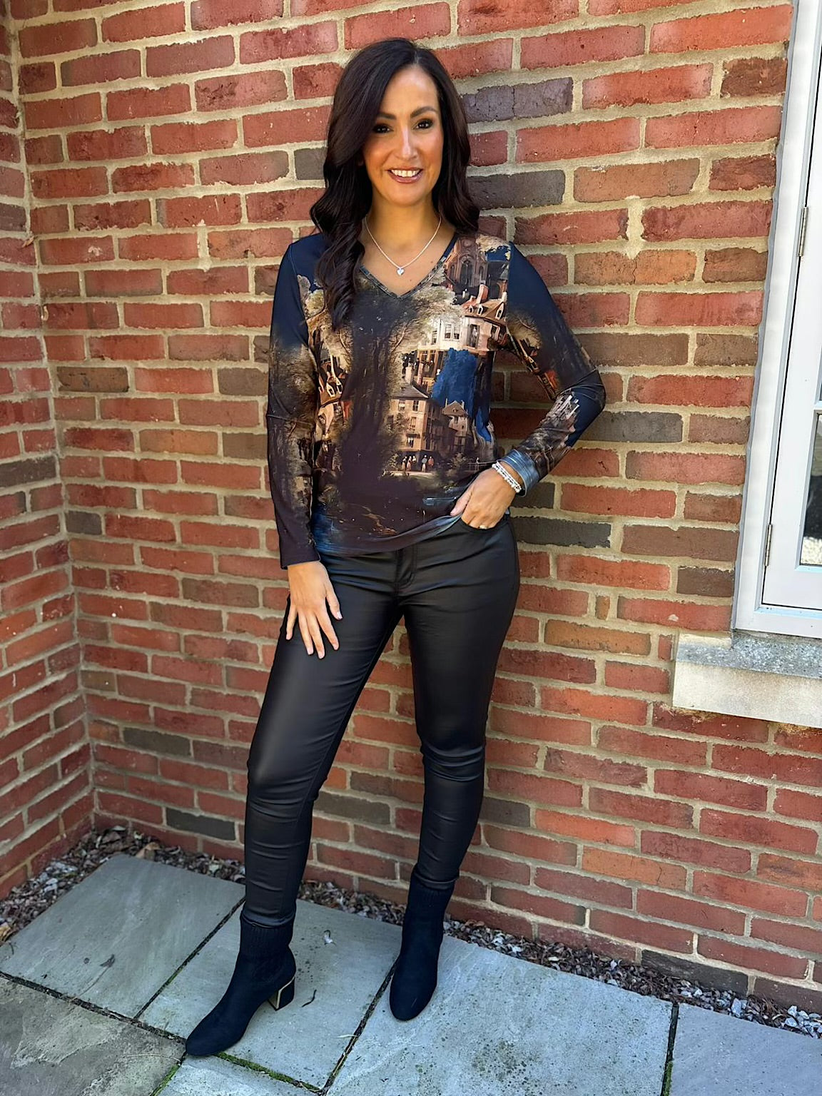 Elevate your wardrobe with the Scenic Printed Top River, featuring a refined long sleeve silhouette and an elegant V-neckline. The exquisite scenic print adds a subtle artistic touch, perfect for sophisticated casual or office wear. Crafted for both comfort and style, this top seamlessly blends classic design with contemporary flair.