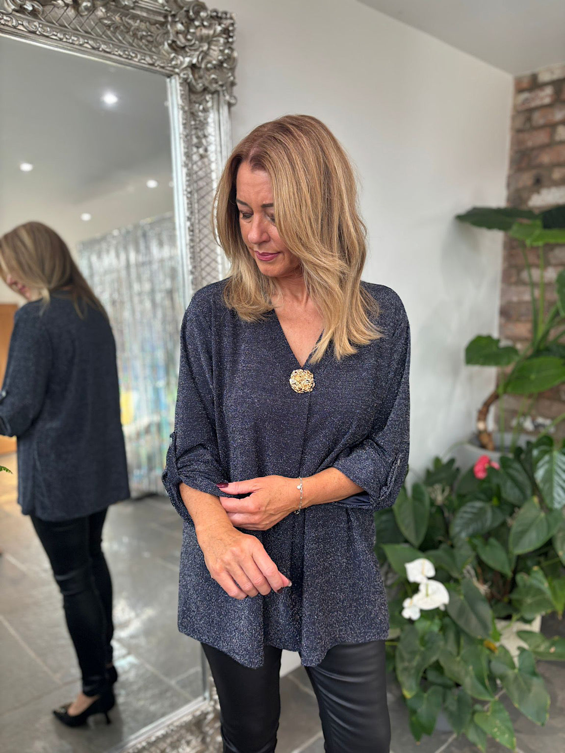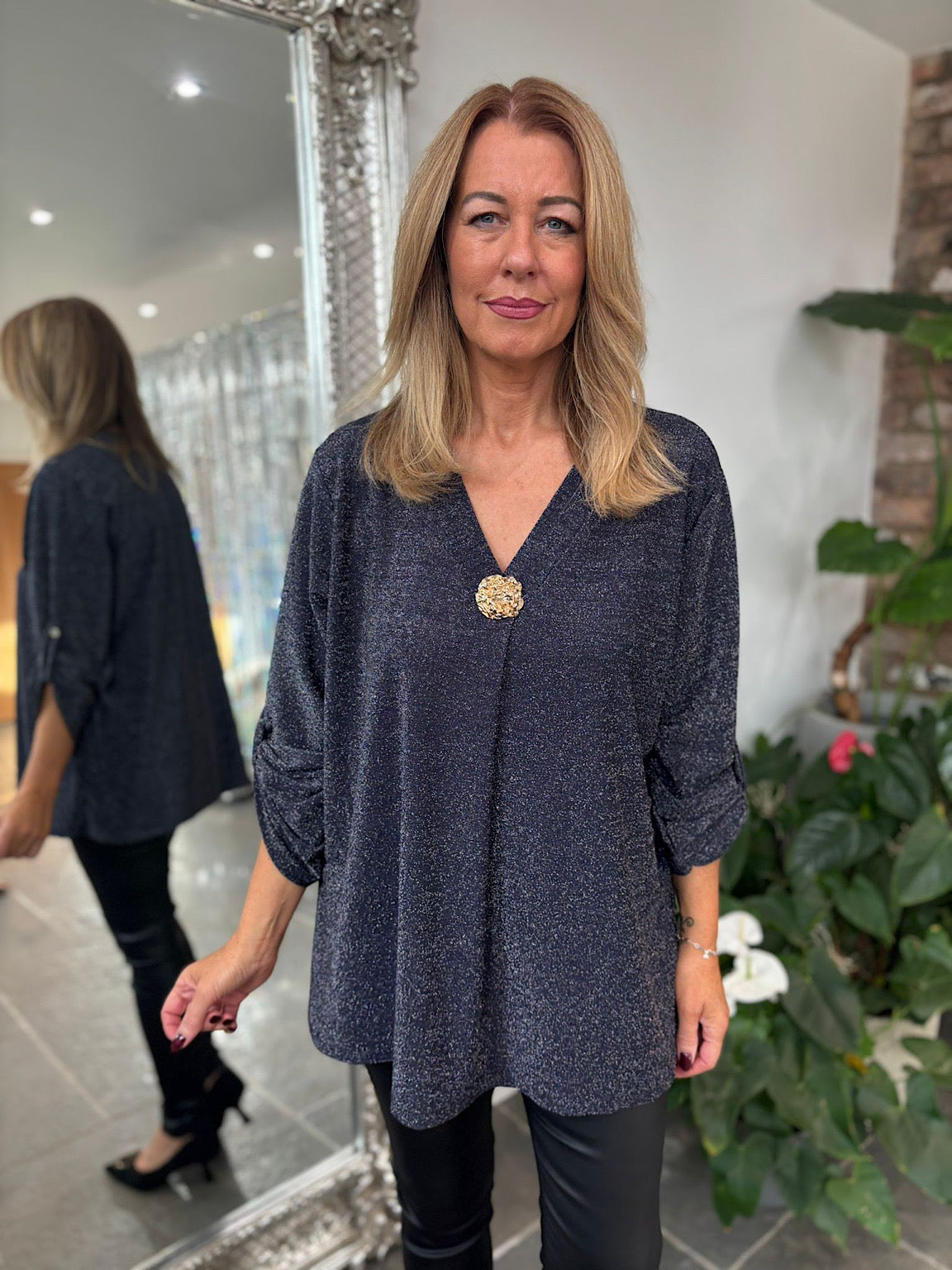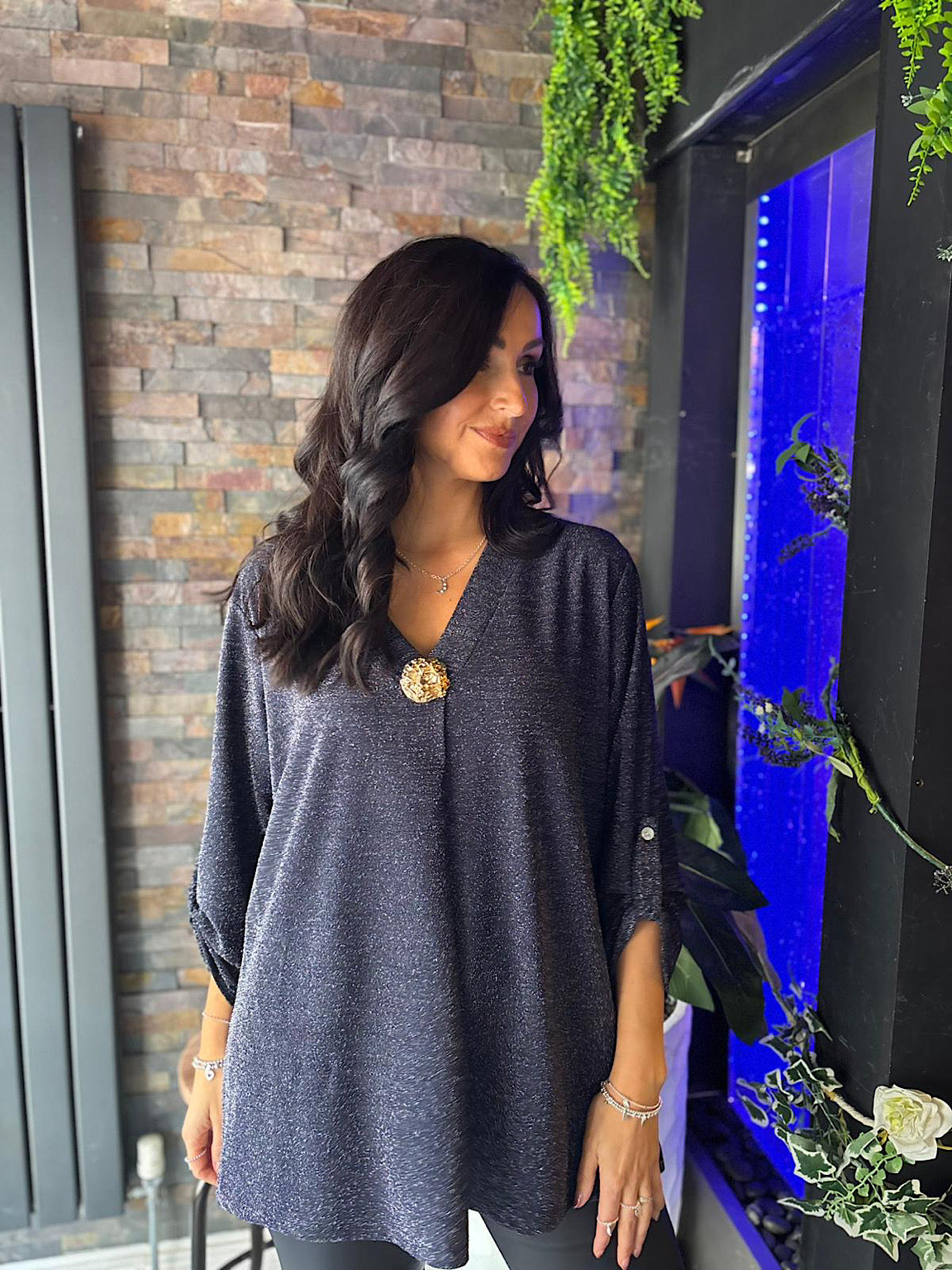 Discover the perfect blend of elegance and flexibility with this shimmer v-neck top. Featuring a detachable brooch, you can customise your look to suit any occasion—add the brooch for a polished, dressed-up finish or wear it solo for effortless sophistication. The shimmering fabric creates a captivating glow that works beautifully for evening events or when you want to feel special during your day. A thoughtfully designed piece that grows with your style.