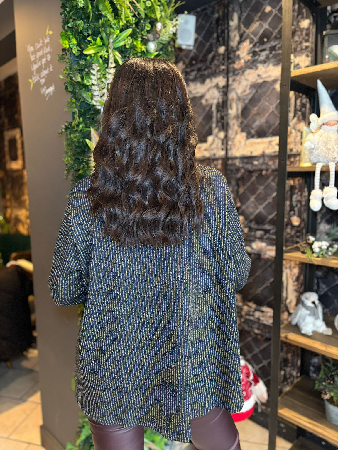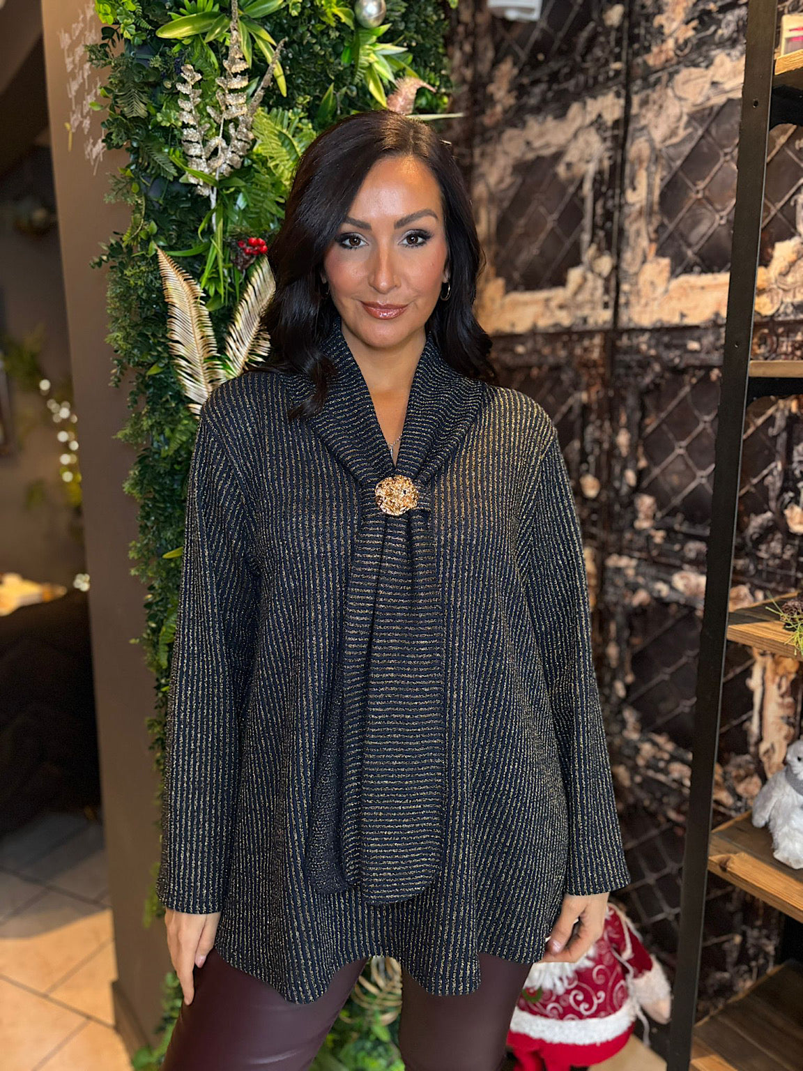 Elevate your everyday style with this sophisticated gathered top, featuring a luxurious gold lurex stripe that catches the light beautifully. The flattering gathered silhouette creates a graceful drape, while the detachable gold brooch adds a touch of elegance you can wear or remove to suit any occasion. Perfect for layering or wearing solo, this versatile piece transitions effortlessly from day to evening wear.