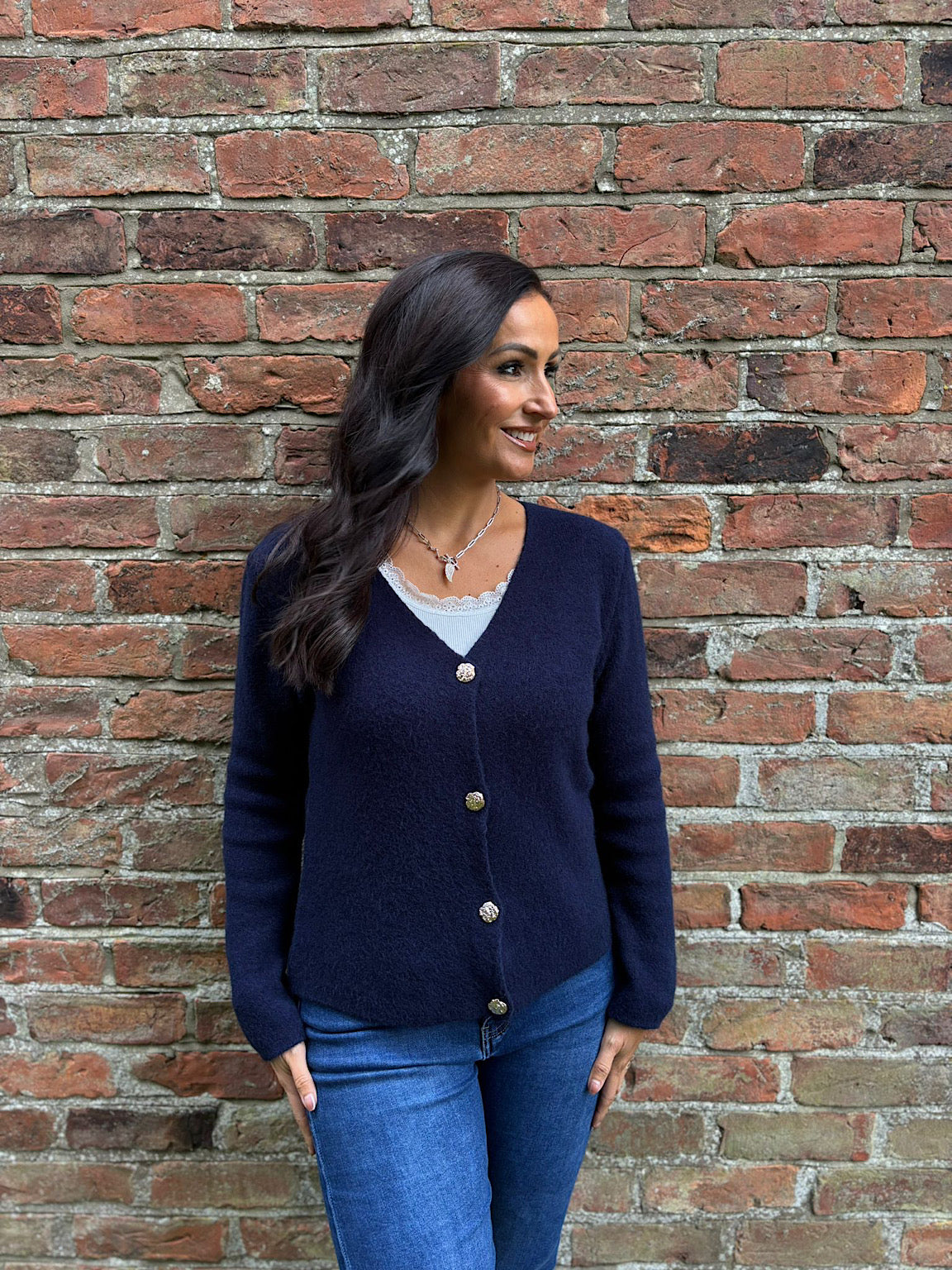 Stay cosy and stylish with the Soft Knit Cardi Kesha. Crafted from warm, chunky knit fabric, this cardigan features a unique textured button design that adds charm and character to your outfit. Perfect for layering on chilly days, it offers both comfort and a flattering fit to keep you snug throughout the season.