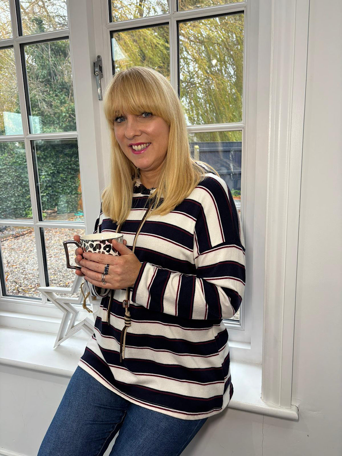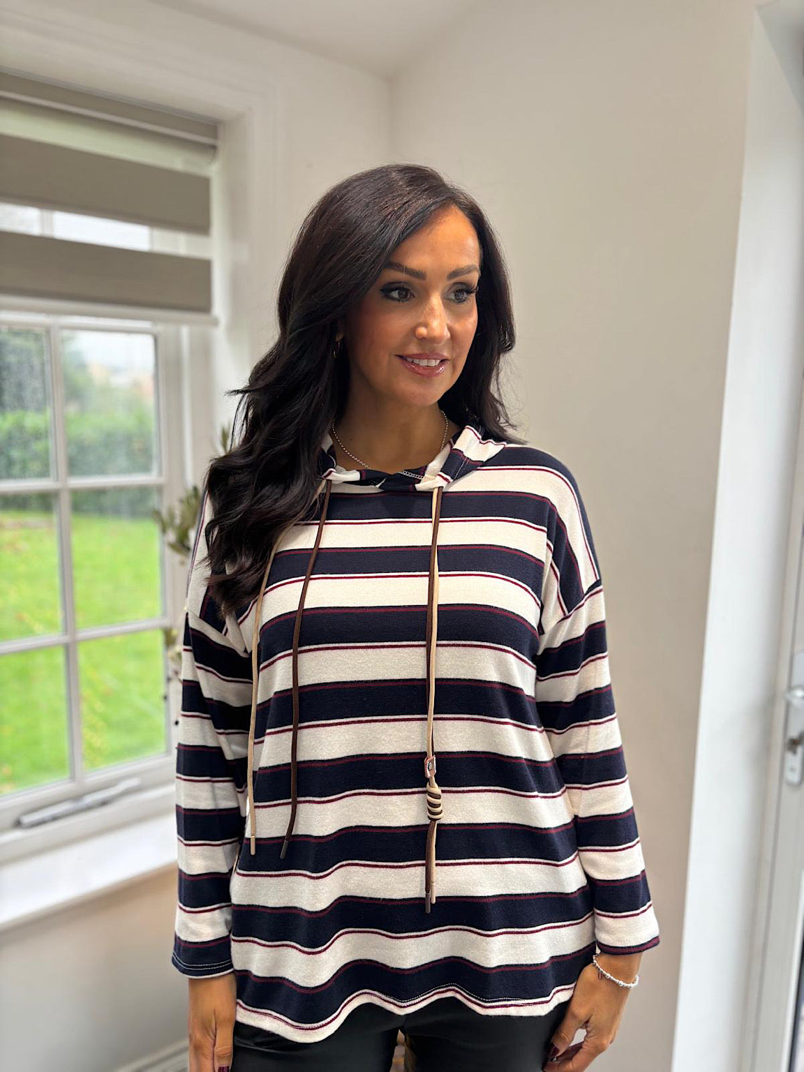 Wrap yourself in comfort with this classic striped hooded top, crafted from a soft, gently stretchy fabric that moves with you throughout the day. The charming lace drawstring hood adds a delicate touch, while the timeless stripe pattern ensures effortless styling versatility. Perfect for layering or wearing solo, this piece combines cosy warmth with understated elegance.