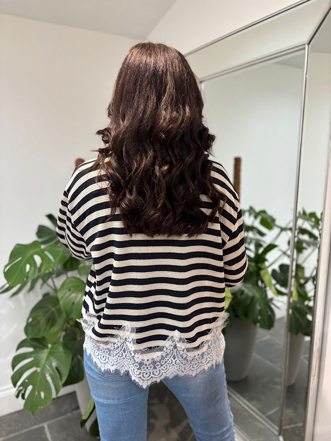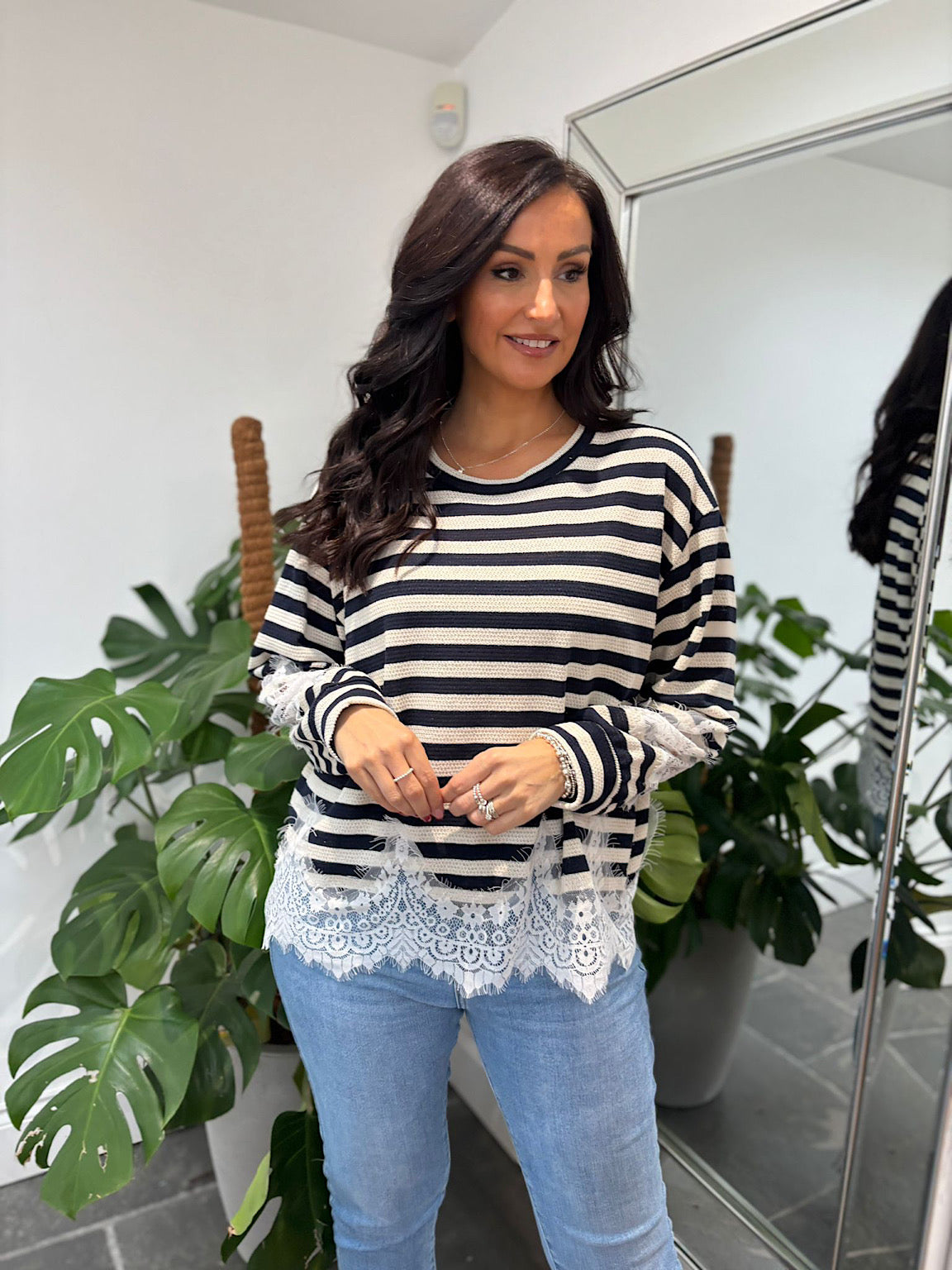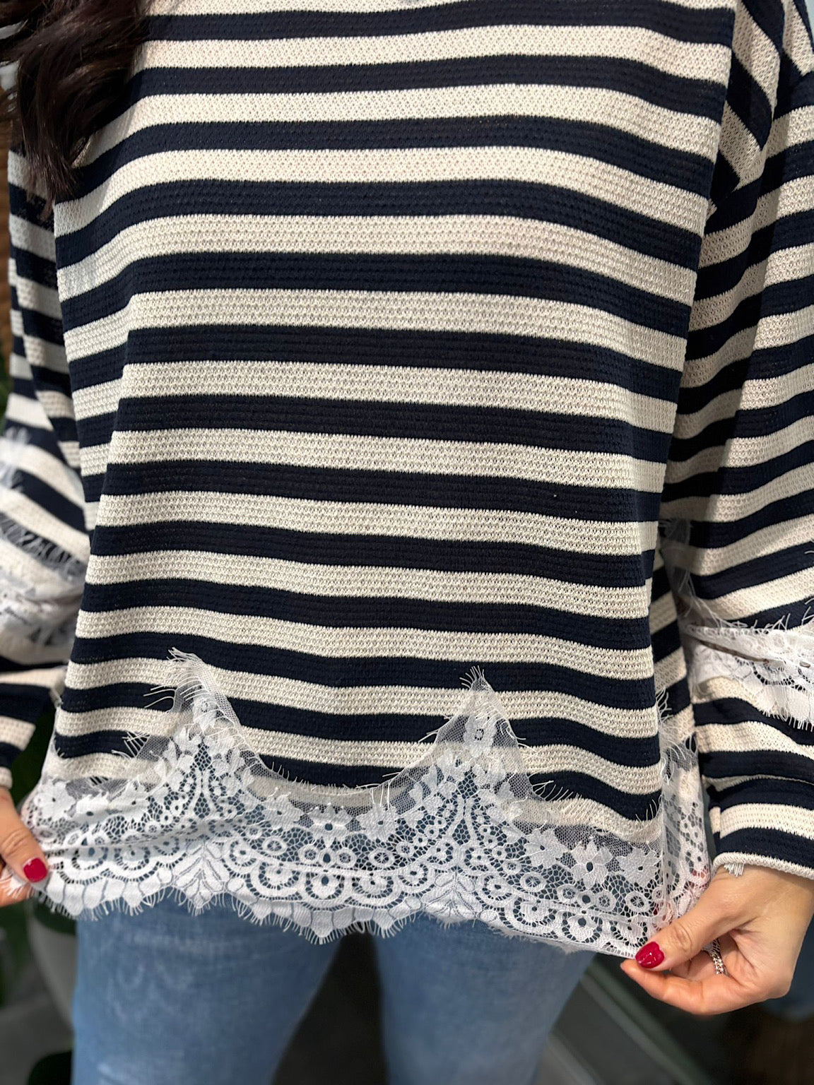Introducing the Navy Striped Lace Knitted Top Marcie – a versatile piece that effortlessly transitions through your wardrobe. Crafted from lightweight knit fabric with gentle stretch, this top moves with you for all-day comfort. Delicate lace detailing adorns the hem and sleeves, adding an elegant touch to the classic striped design. Perfect for layering or wearing solo, Marcie brings understated sophistication to casual and dressed-up looks alike.