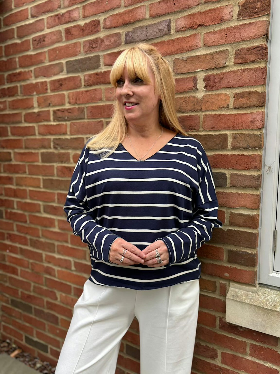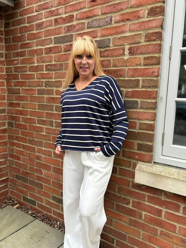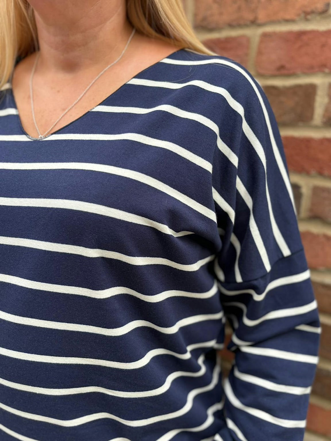 Elevate your wardrobe with the V Neck Stripe Top Tess, crafted from 100% pure cotton for exceptional softness and breathability. Its classic navy and white stripes paired with a refined V-neckline create a timeless, sophisticated silhouette that effortlessly complements any outfit. Ideal for layering or wearing alone, this top offers both comfort and style for a polished, everyday look.