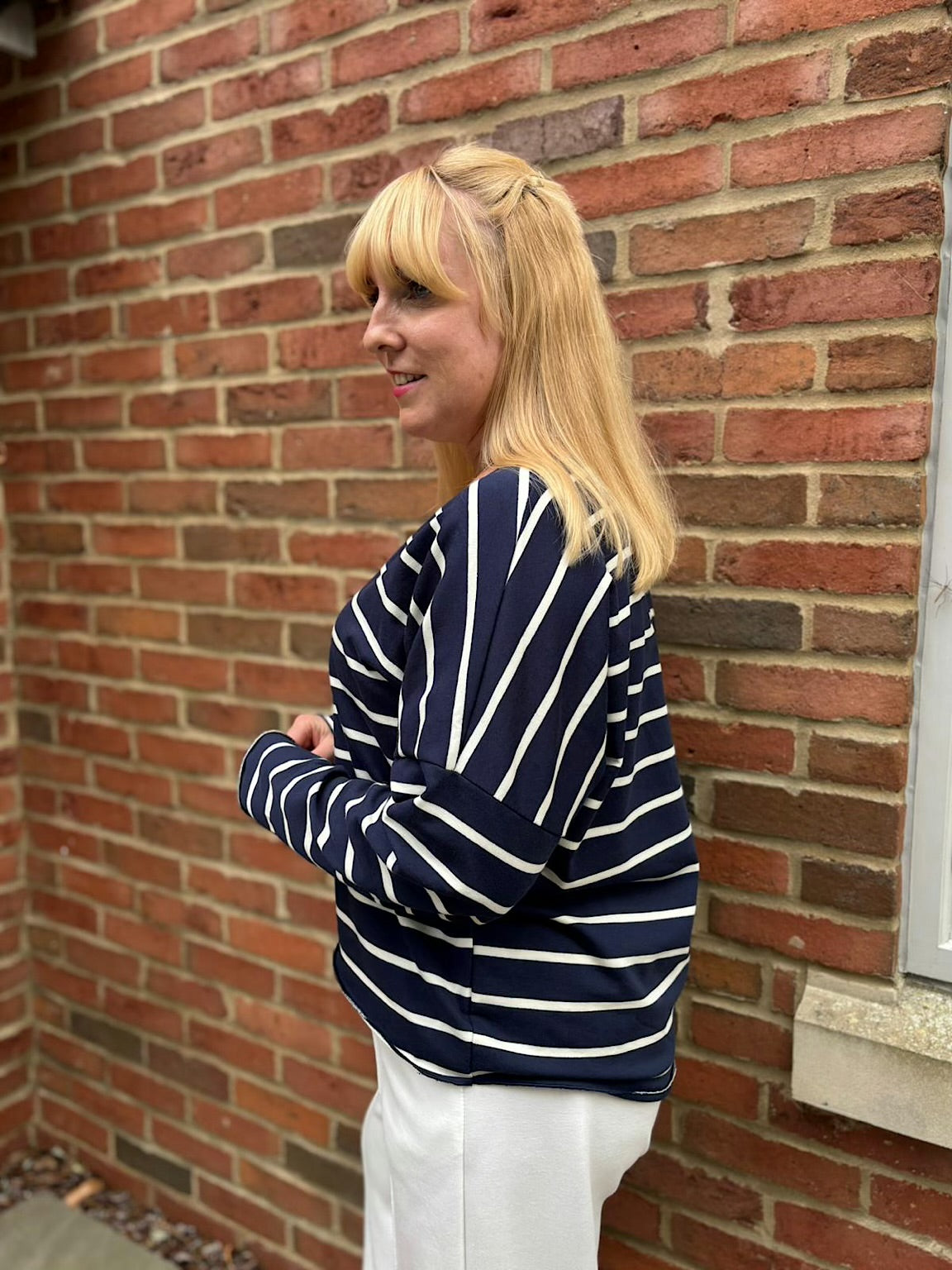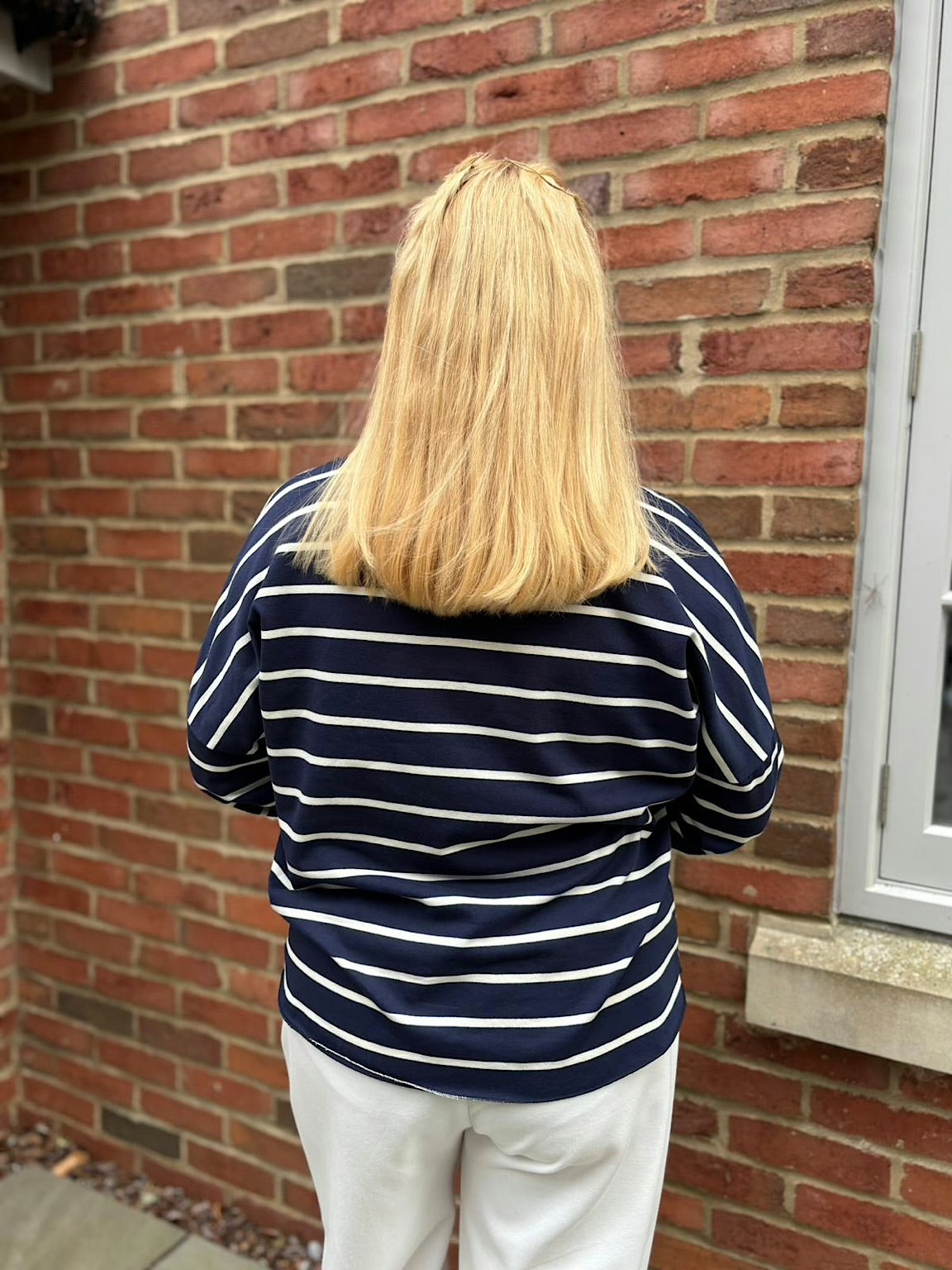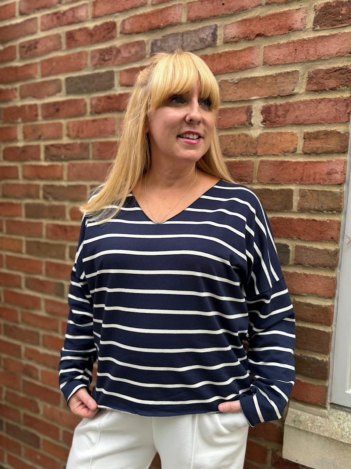 Elevate your wardrobe with the V Neck Stripe Top Tess, crafted from 100% pure cotton for exceptional softness and breathability. Its classic navy and white stripes paired with a refined V-neckline create a timeless, sophisticated silhouette that effortlessly complements any outfit. Ideal for layering or wearing alone, this top offers both comfort and style for a polished, everyday look.
