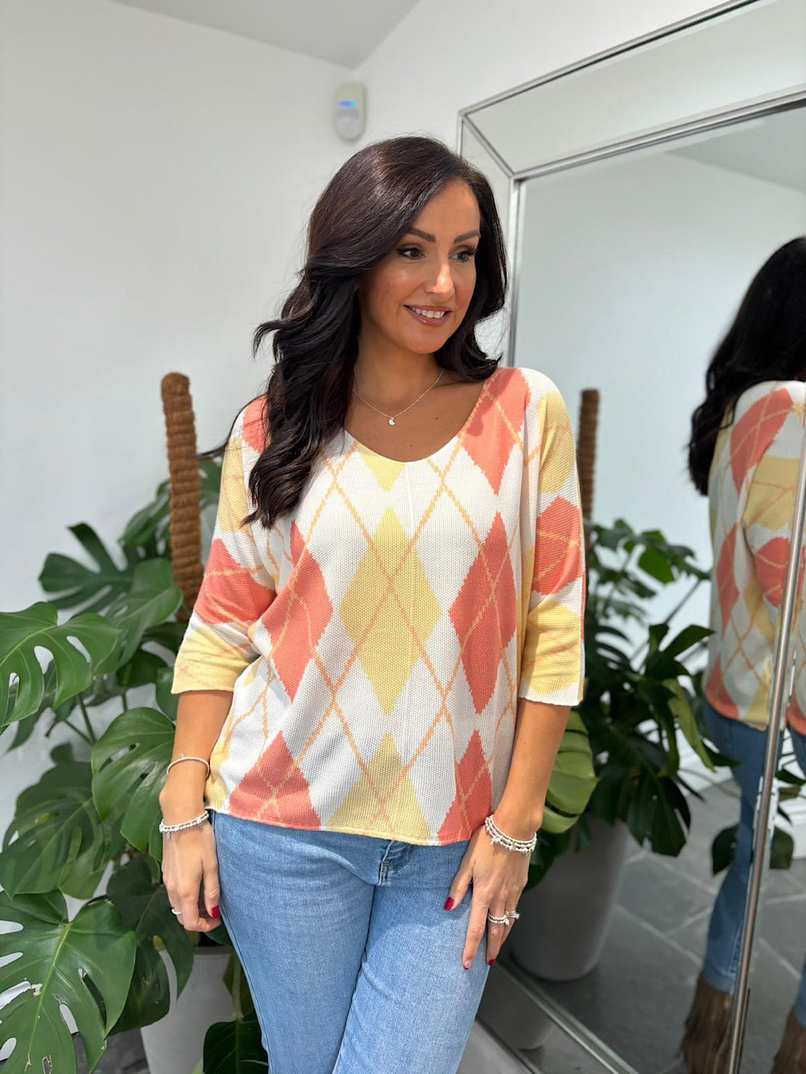 Introducing the Argyle Top Izzy – a versatile piece that effortlessly transitions through your wardrobe. This lightweight knit top features a stylish argyle pattern that adds visual interest and depth, while the flattering V-neckline offers a timeless silhouette. Perfect for layering or wearing solo, this comfortable knit is ideal for creating relaxed, everyday looks with understated elegance.