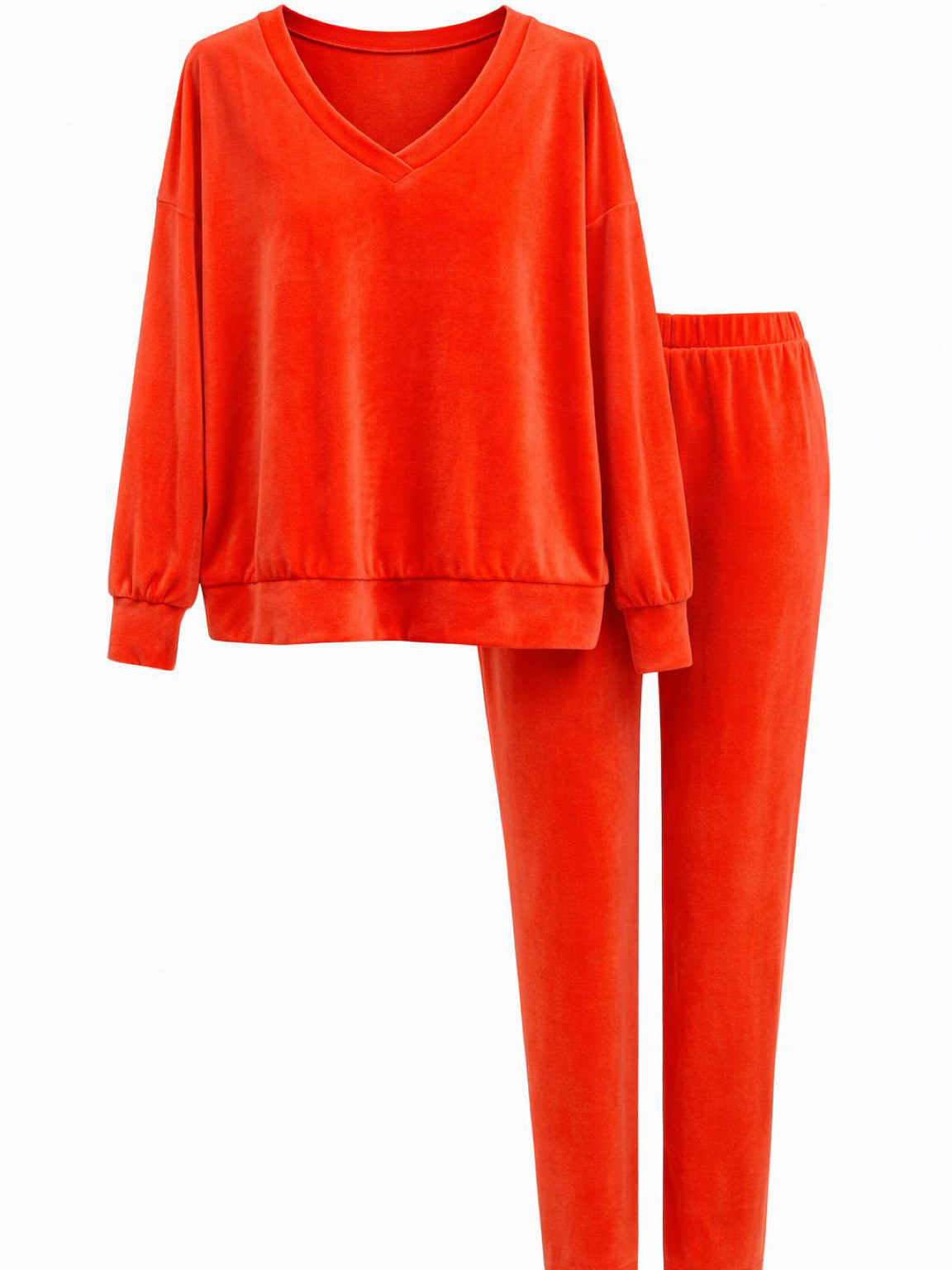 Indulge in ultimate comfort with our Velour Leisure Set Carmen. This luxuriously soft two-piece set features a classic block colour design with a flattering V-neck top. The coordinating trousers boast an elasticated waist and convenient pull-on design, making them effortless to slip into whenever you need to unwind. Perfect for relaxing at home or casual outings, this set combines softness with style for a look you'll love wearing again and again.