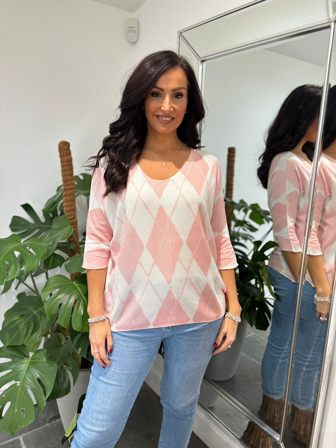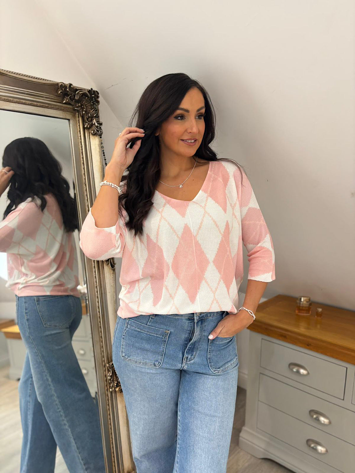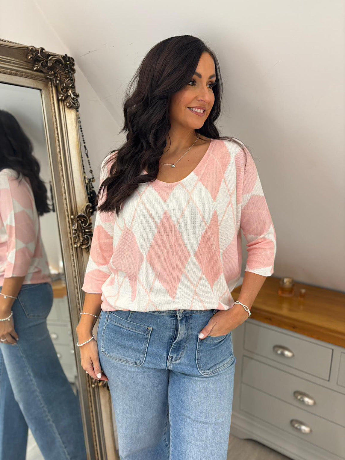 Peach V Neck Argyle Print Top Izzy