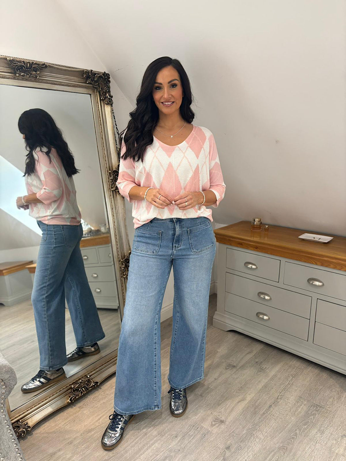 Introducing the Argyle Top Izzy – a versatile piece that effortlessly transitions through your wardrobe. This lightweight knit top features a stylish argyle pattern that adds visual interest and depth, while the flattering V-neckline offers a timeless silhouette. Perfect for layering or wearing solo, this comfortable knit is ideal for creating relaxed, everyday looks with understated elegance.