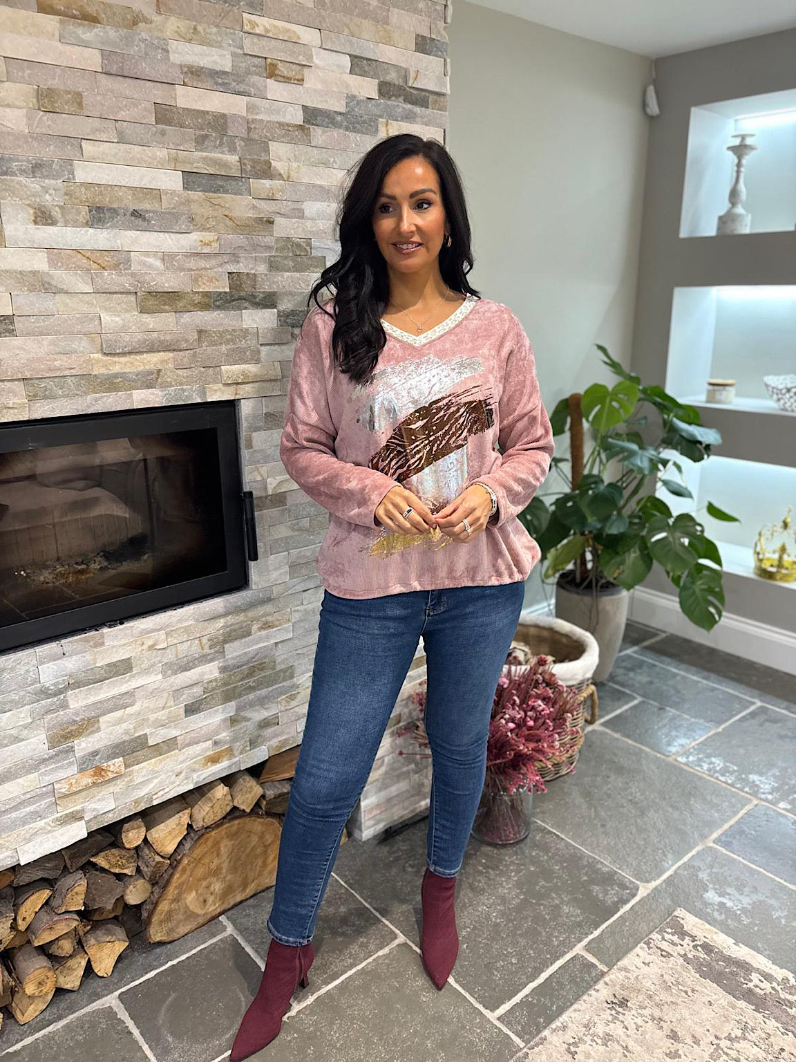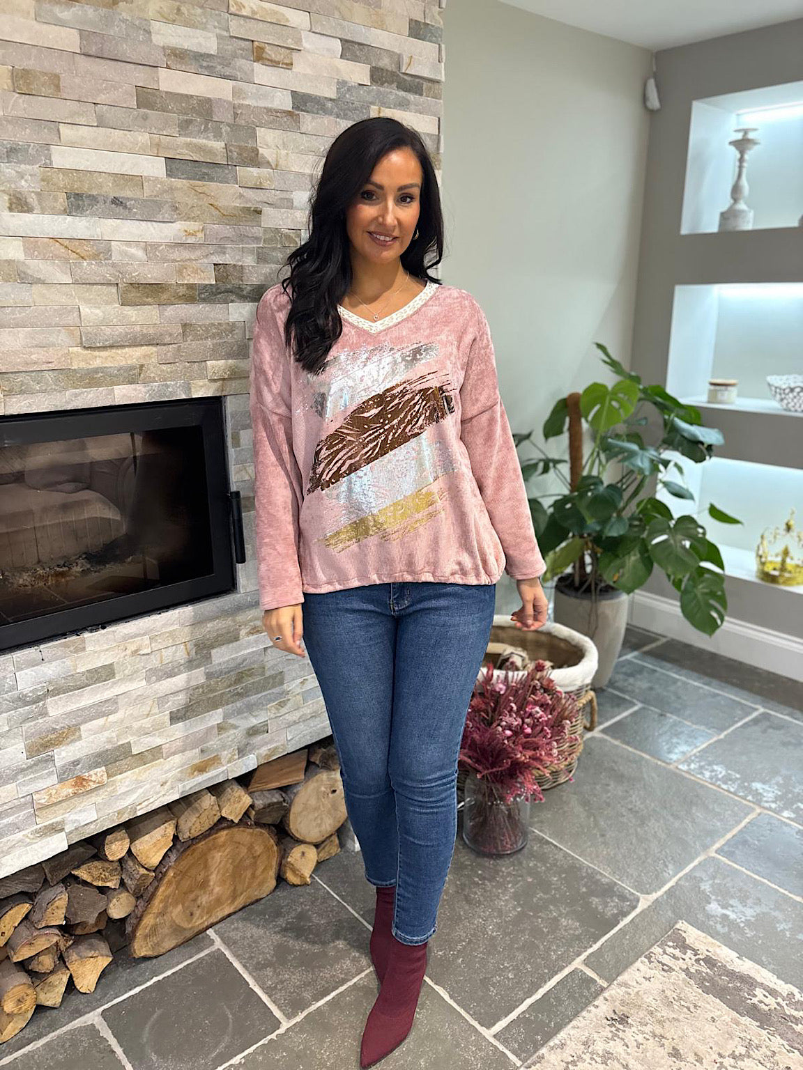 Pink Chenille Leopard V Neck Sweatshirt Elle