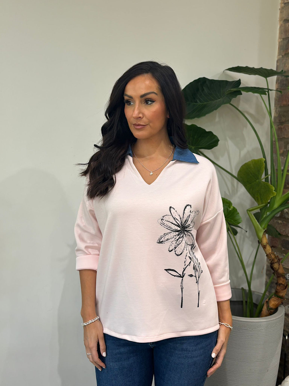 Embrace cosy elegance with this Collared Flower Sweatshirt. Crafted from soft, smooth fabric that feels wonderful against your skin, it features a distinctive denim-look collar that adds a touch of casual sophistication. The charming floral design is beautifully embellished with tiny diamantes, creating subtle sparkle and visual interest. Perfect for layering or wearing solo, this piece brings together comfort and style for those moments when you want to feel both relaxed and put-together.
