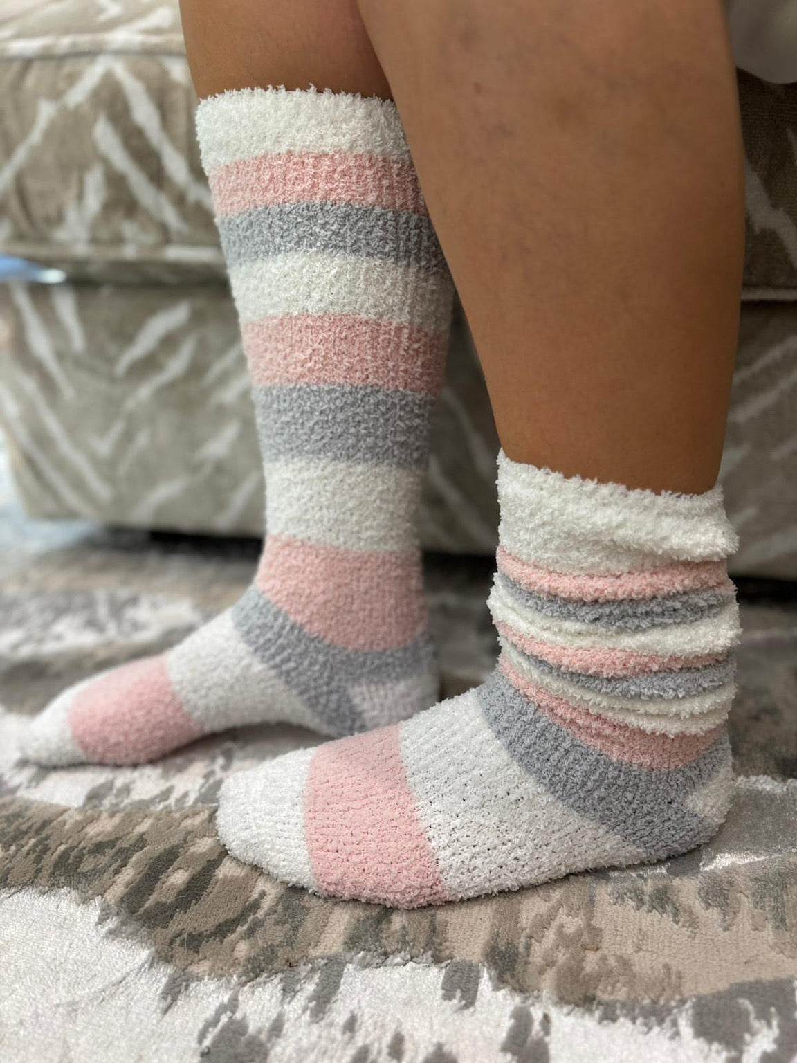 These Cosy Striped Knee High Socks offer gentle warmth and softness with their plush fleece fabric. The striped design adds a charming touch to your outfit, while the knee-high length ensures extra coverage for cooler days. Perfect for keeping your feet comfortable and cosy throughout the day.