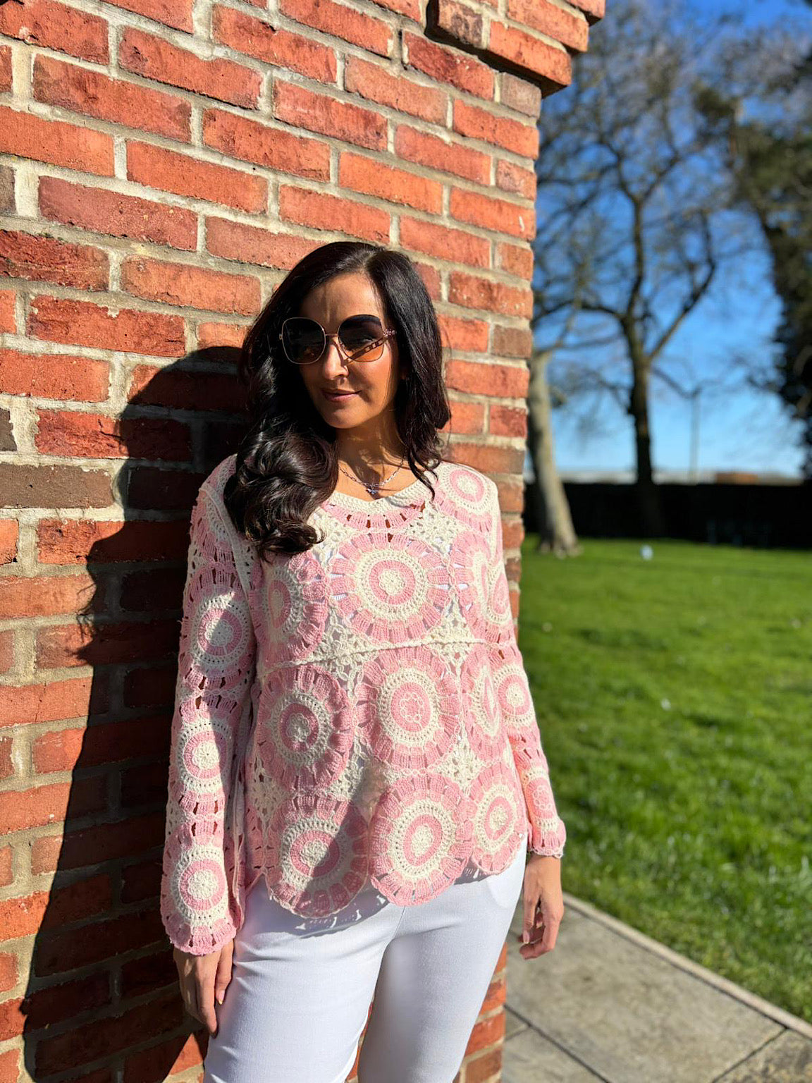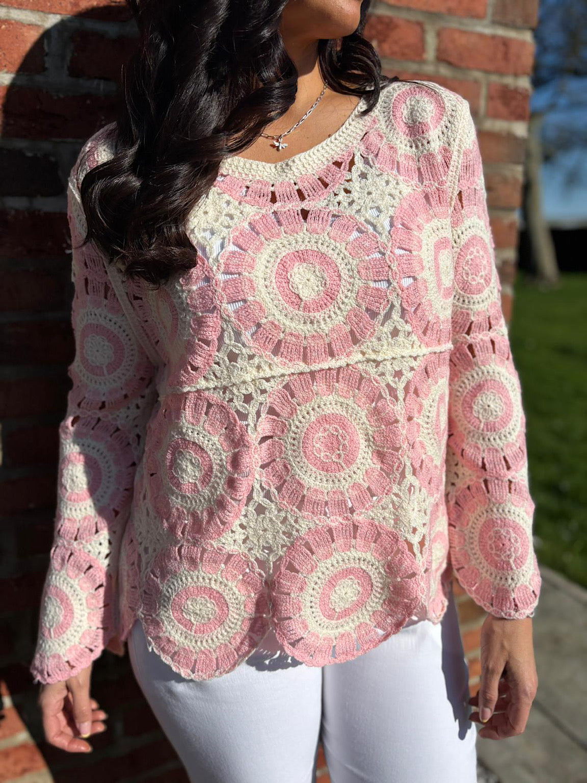 Effortlessly chic, this pink crochet knit features a flattering scoop neckline and beautiful loose weave design. Crafted from 100% cotton, it's perfect for layering or wearing solo.