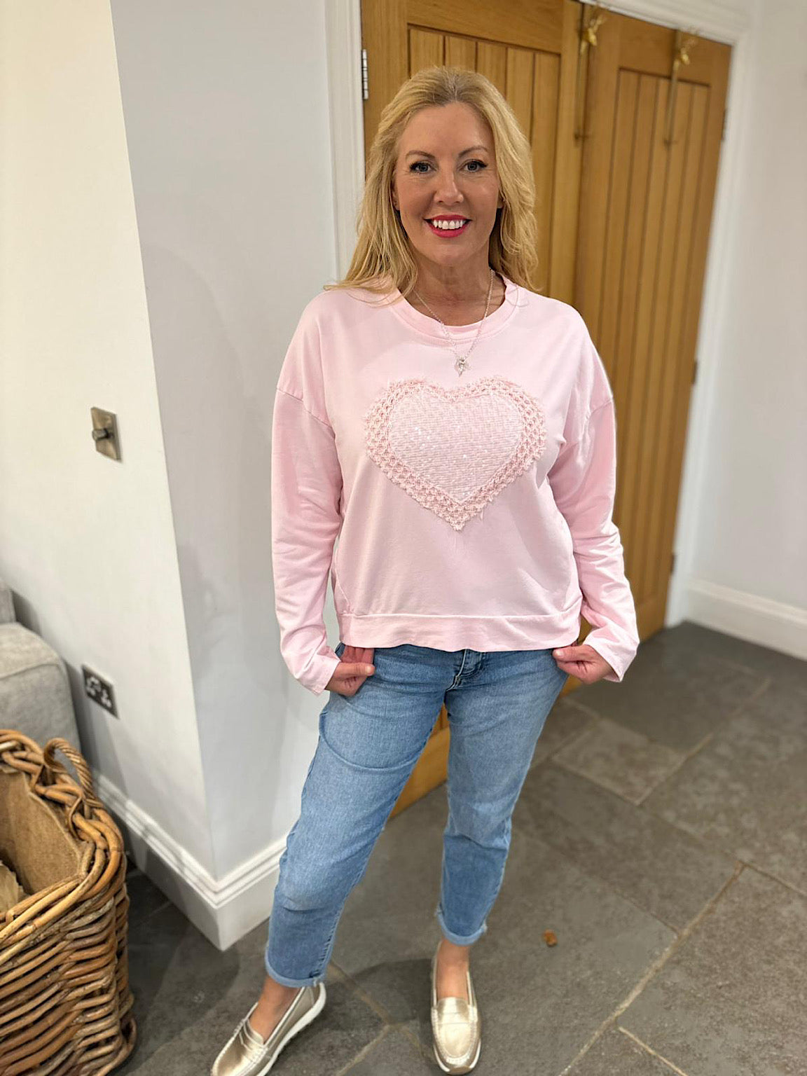 Elevate your everyday style with this charming sweatshirt featuring a textured crochet heart adorned with clear sequins in the centre that catch the light beautifully. The soft, comfortable sweater material makes it perfect for all-day wear, whether you're relaxing at home or out and about. A delightful piece that brings a touch of sparkle and personality to your wardrobe.