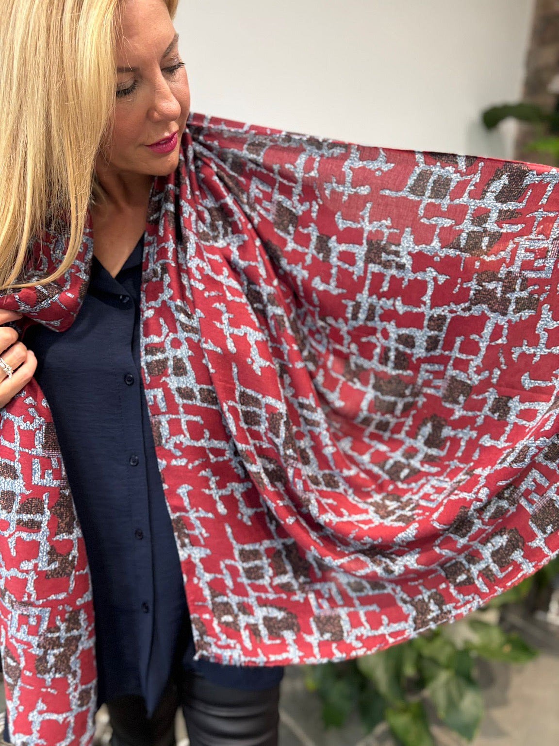 Wine Block Print Raw Edge Scarf