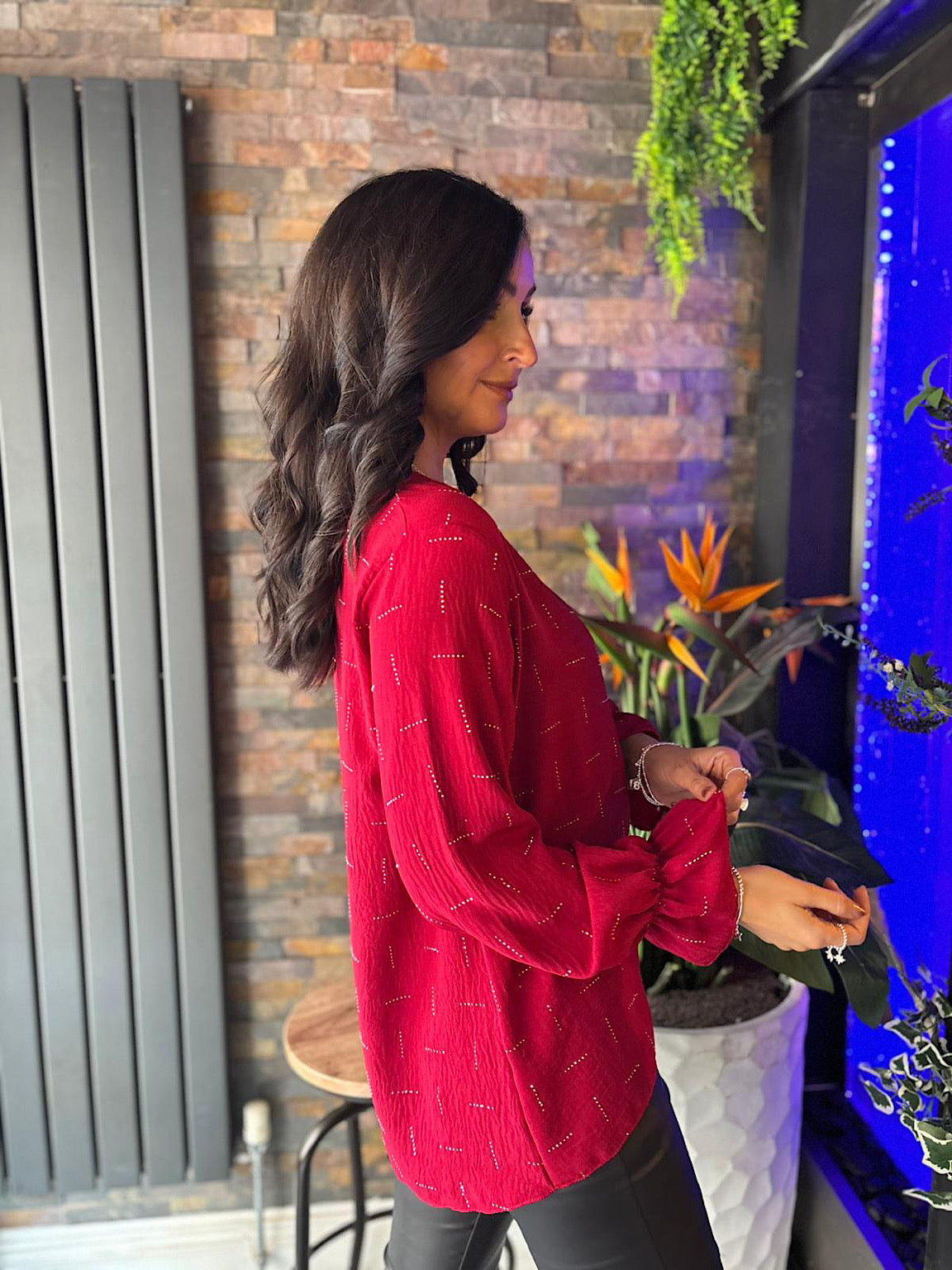 This Crossover Diamante Top Ruth features a delicate crepe-style fabric adorned with tiny diamantes for subtle sparkle. Its crossover design flatters your silhouette while the flowy material ensures comfortable movement. Elasticated sleeves with ruffle details add a feminine touch, making this top versatile for both casual and dressier occasions.