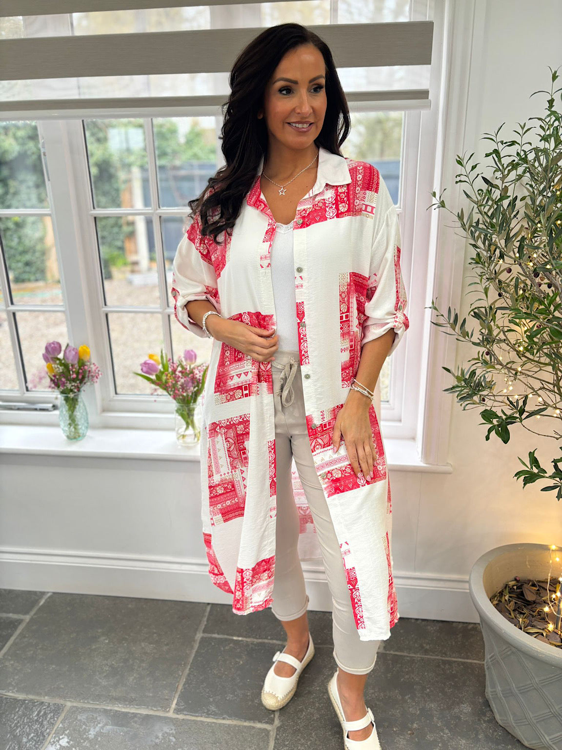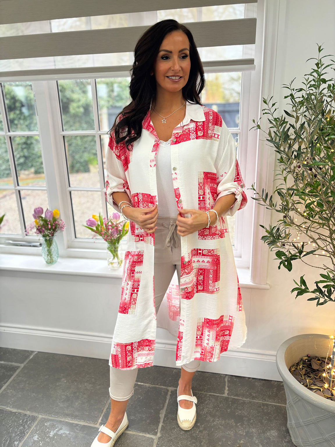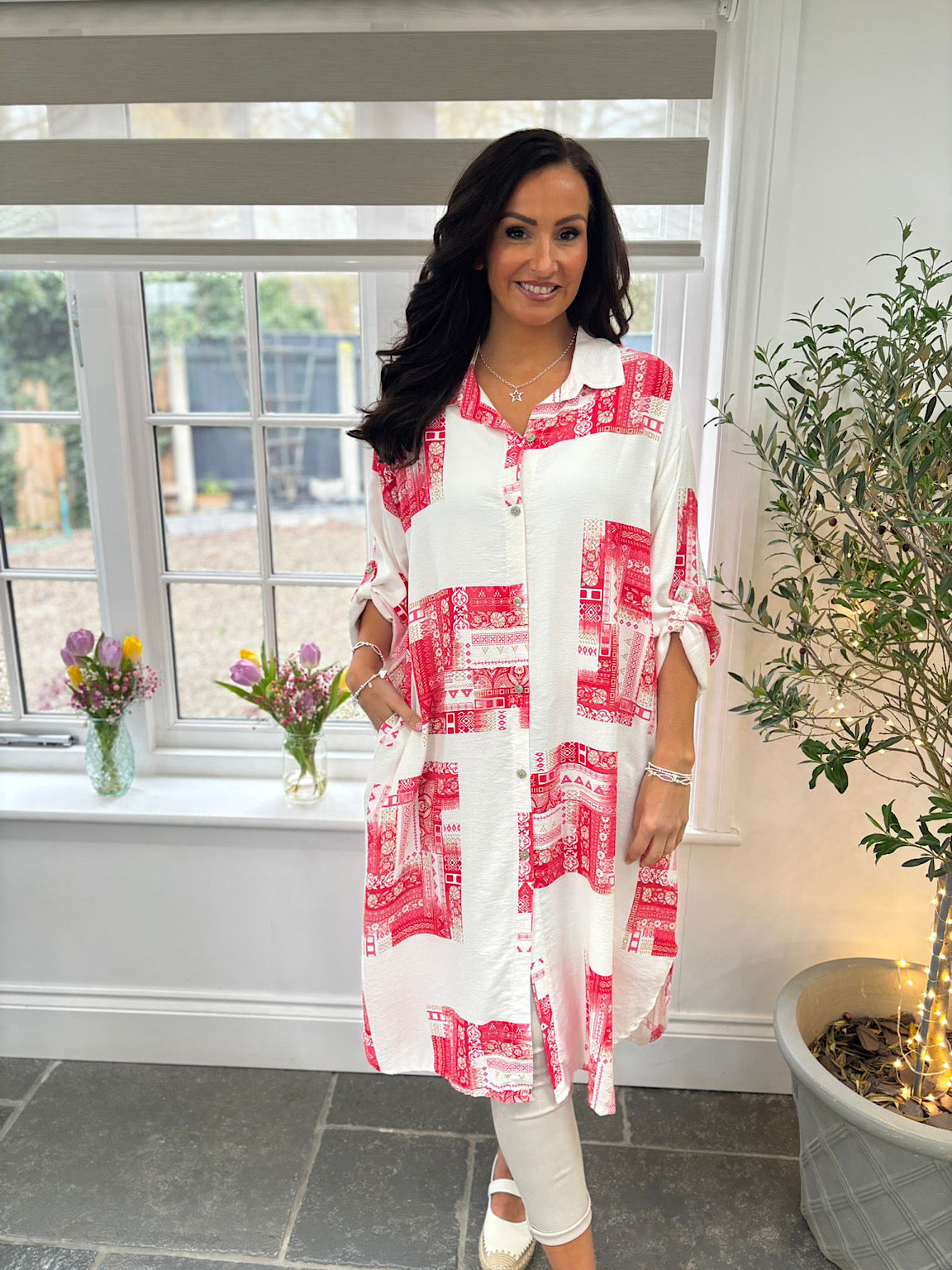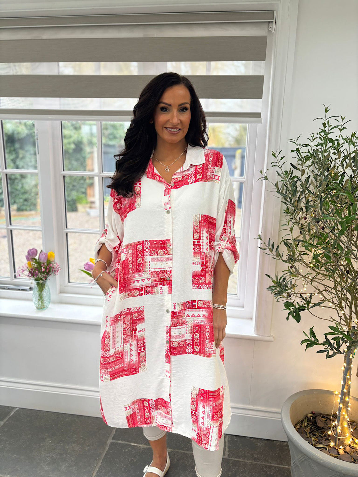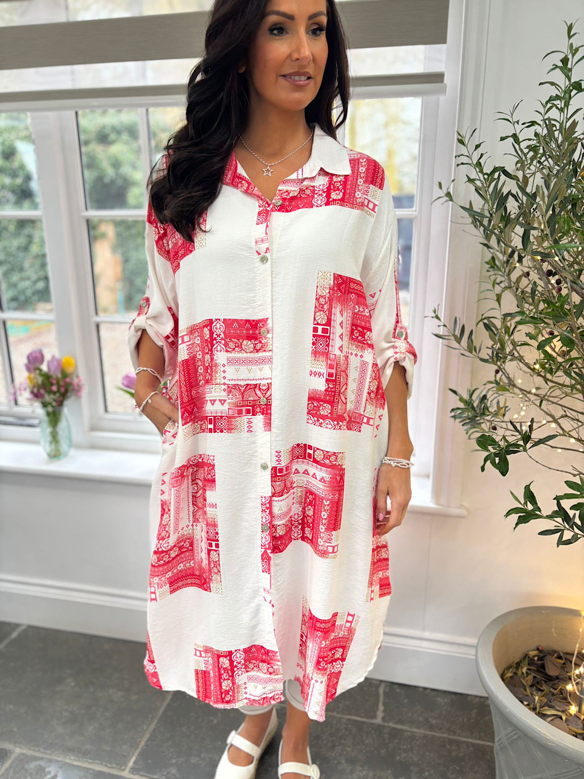 Embrace effortless style with this Floral Aztec Shirt Dress Gemma. Crafted from cool viscose fabric, it's perfect for warm weather wear while keeping you comfortable throughout the day. The classic shirt dress silhouette features charming button-detail sleeves and a striking Aztec floral design that adds character to your wardrobe. Practical pockets make this piece as functional as it is fashionable, ideal for those who value both style and convenience.