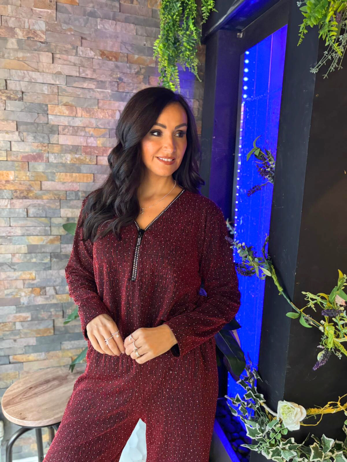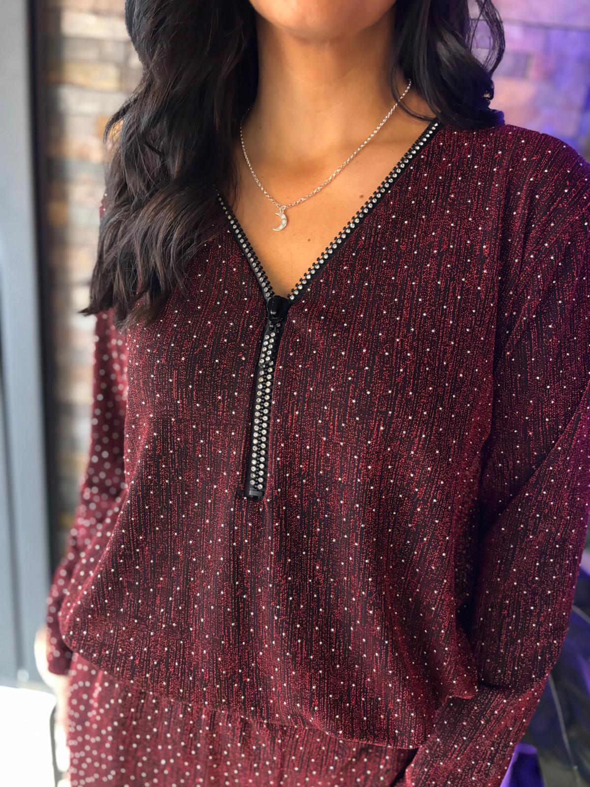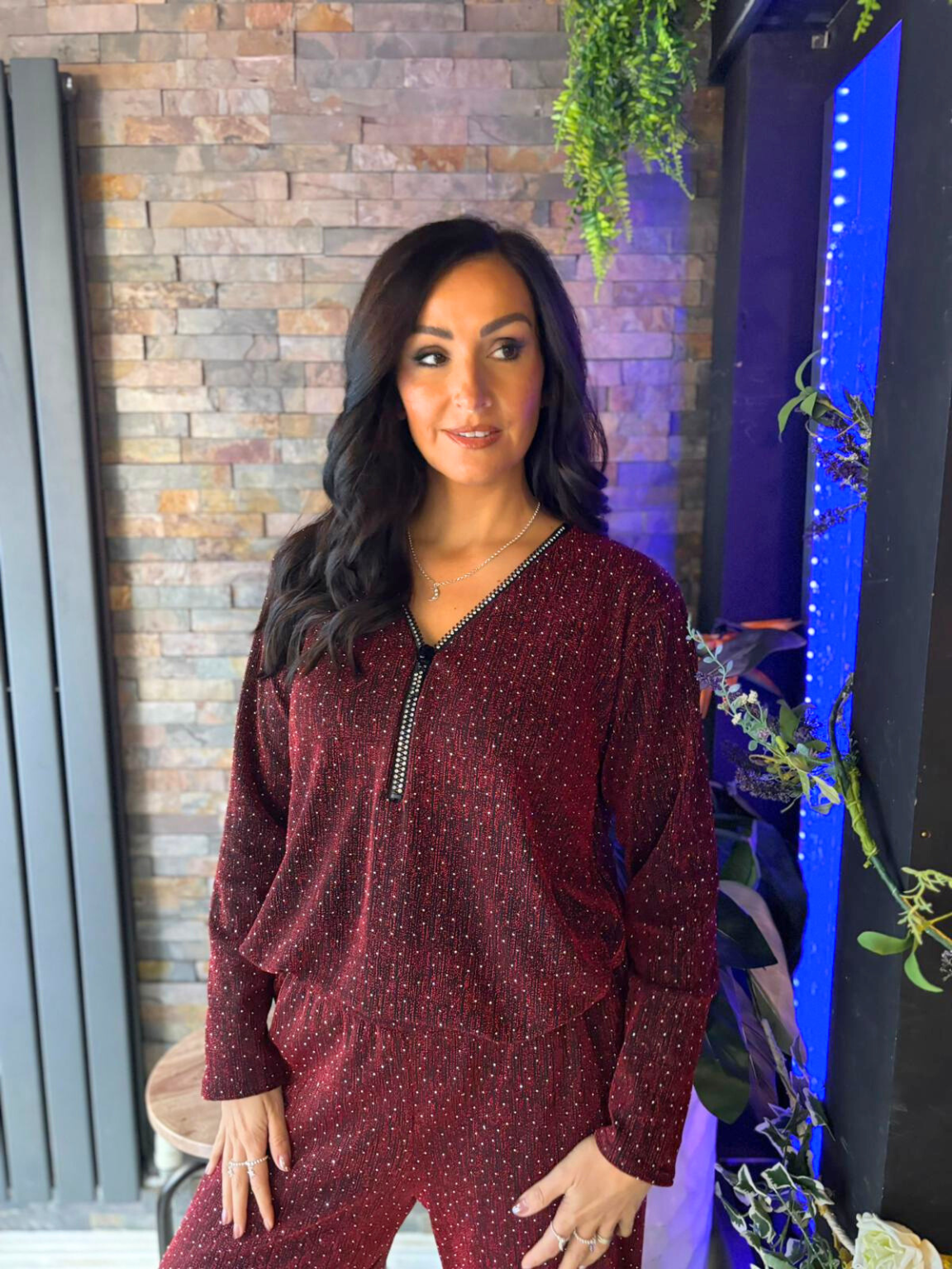 Elevate your party wardrobe with our classic Cassie top, now crafted in a shimmering metallic fibre. The sparkle fabric and diamantes catch the light beautifully, while delicate diamante detailing along the neckline adds a touch of glamour. Featuring a smooth zip for easy wear, this top combines comfort with festive sparkle, making it the perfect choice to celebrate in style.
