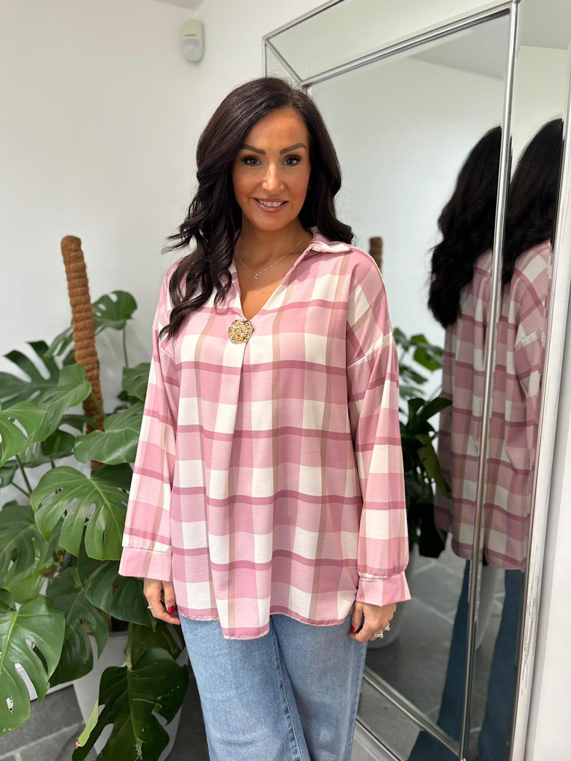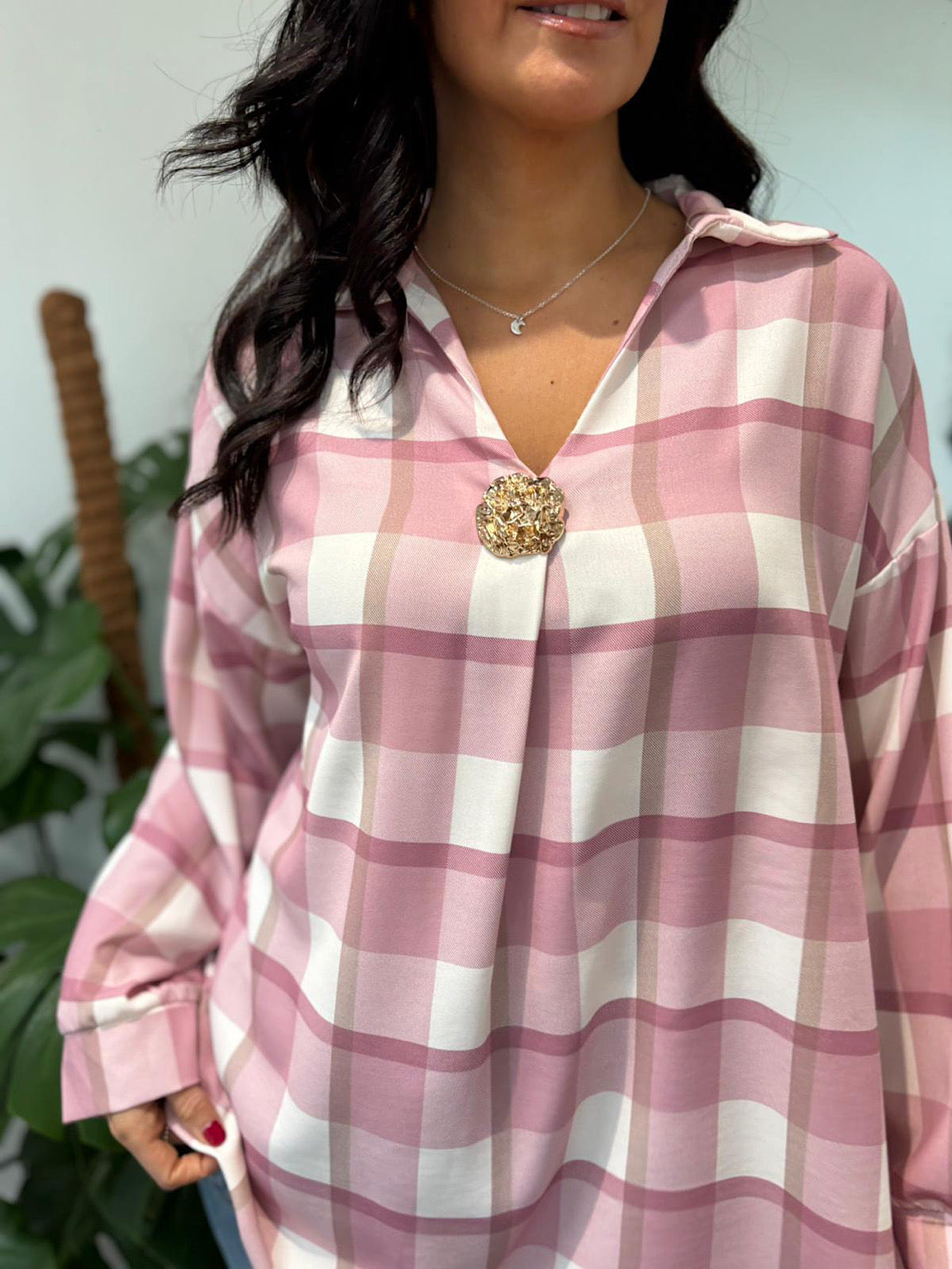 Discover effortless style with this checked blouse, featuring a graceful V-neckline and convenient slip-on design for quick, hassle-free dressing. The included detachable gold brooch adds a touch of elegance—simply pin it to the neckline when you want to dress up, or leave it off for a relaxed, understated look. The timeless checked pattern ensures this piece works beautifully with your existing wardrobe, from smart trousers to casual denim. Whether you're heading to the office or out for the weekend, this versatile blouse adapts to your day with ease and confidence.