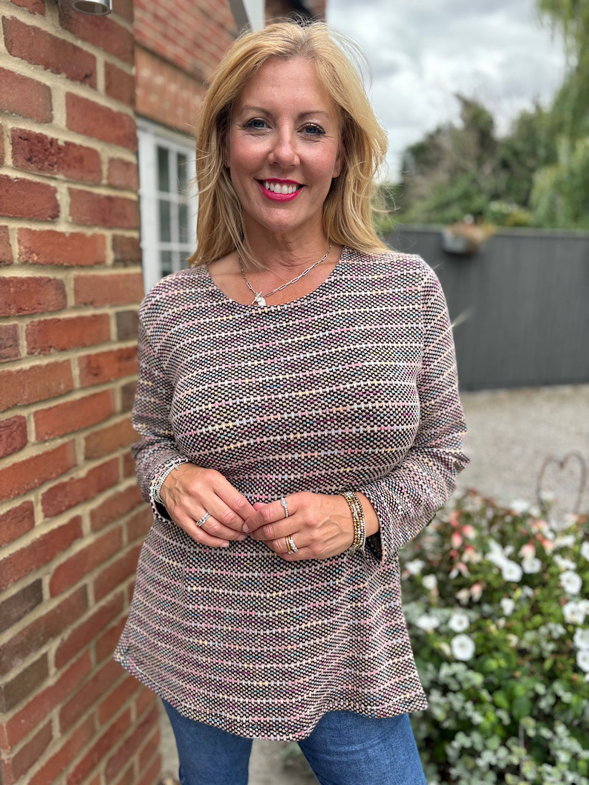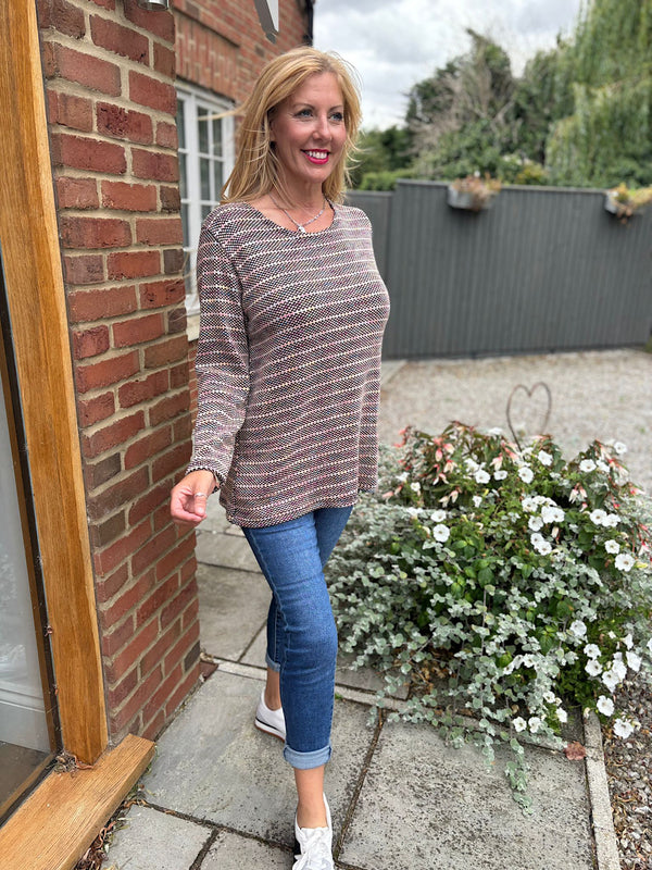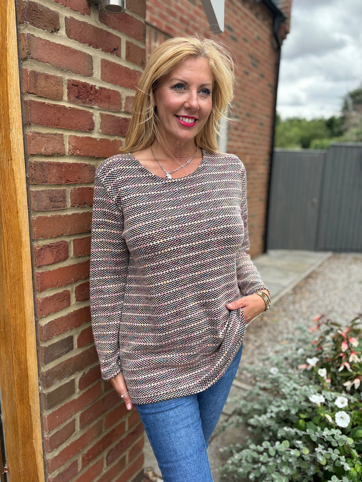 This soft, long-sleeve knit top features delicate rainbow stitch detailing, adding a subtle pop of colour to your wardrobe. Crafted for comfort and warmth, it pairs effortlessly with casual or layered looks, making it a versatile staple you'll reach for again and again.