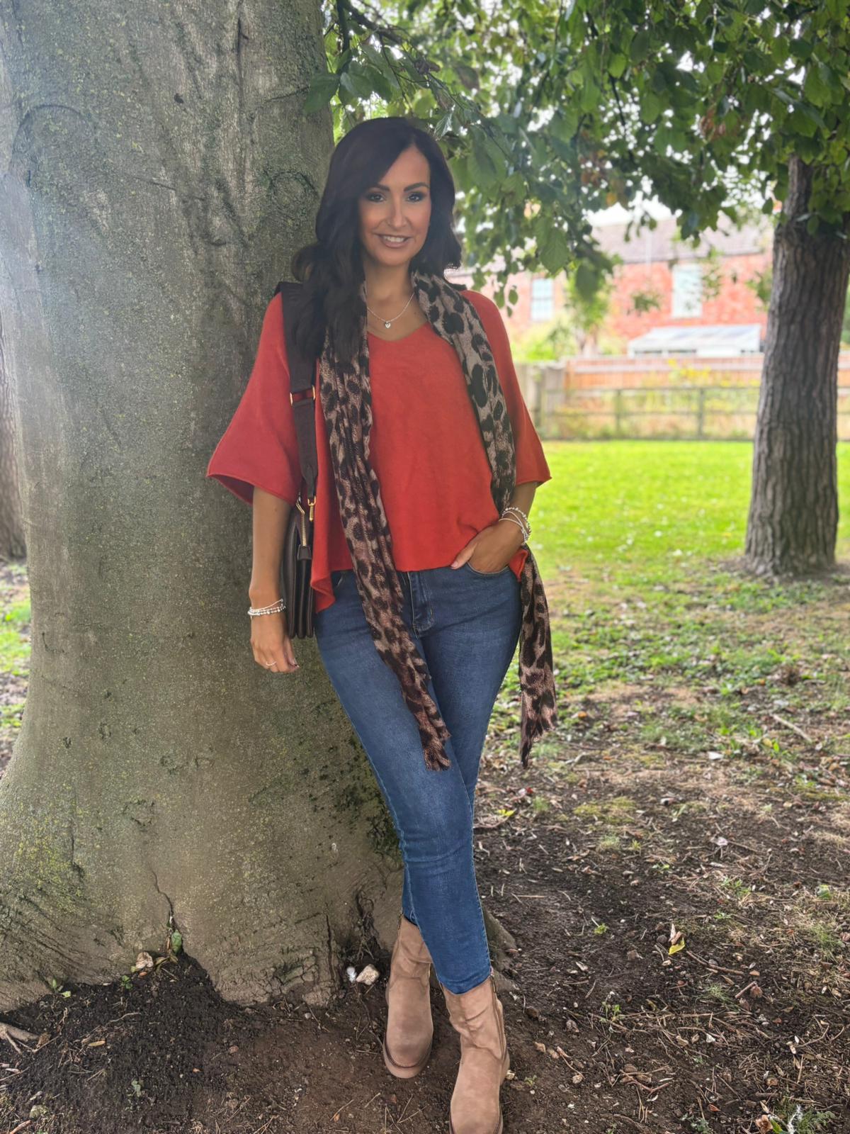 Styled with.....> Chocolate Gold Fleck Leopard Scarf / Mocha Chunky Ruched Boots / Denim Straight Leg Jeans