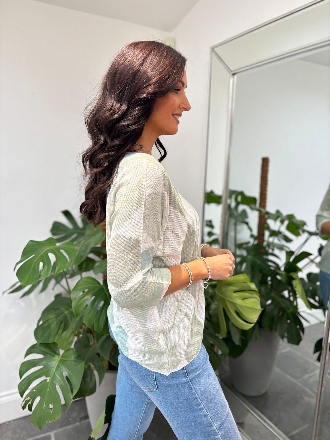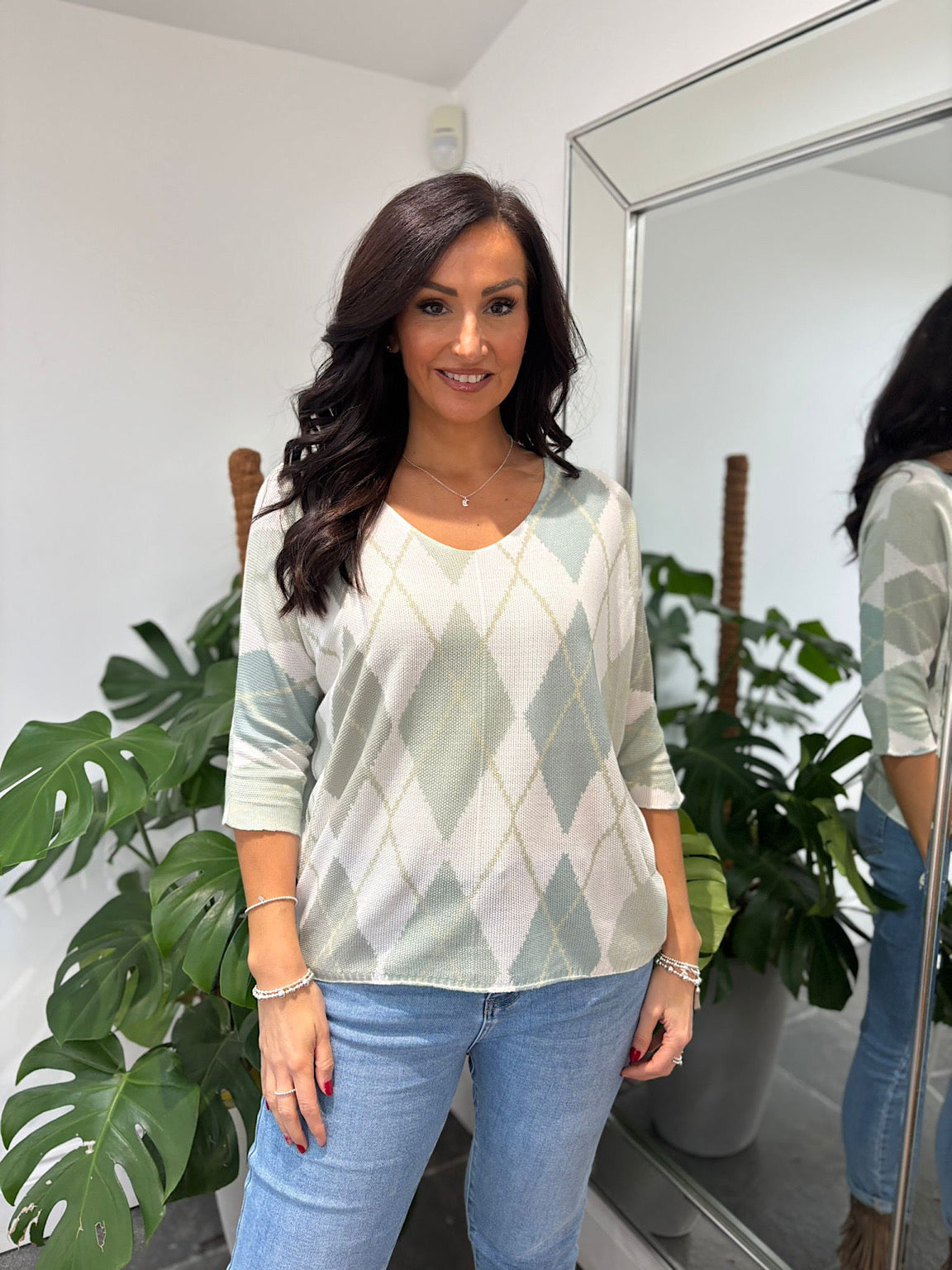 Introducing the Argyle Top Izzy – a versatile piece that effortlessly transitions through your wardrobe. This lightweight knit top features a stylish argyle pattern that adds visual interest and depth, while the flattering V-neckline offers a timeless silhouette. Perfect for layering or wearing solo, this comfortable knit is ideal for creating relaxed, everyday looks with understated elegance.