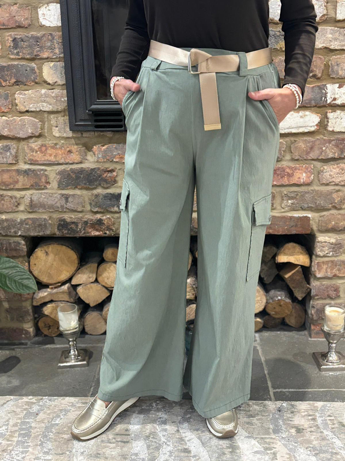 Sage Wide Leg Pull On Cargo Trousers